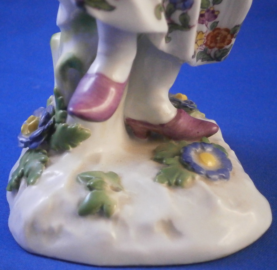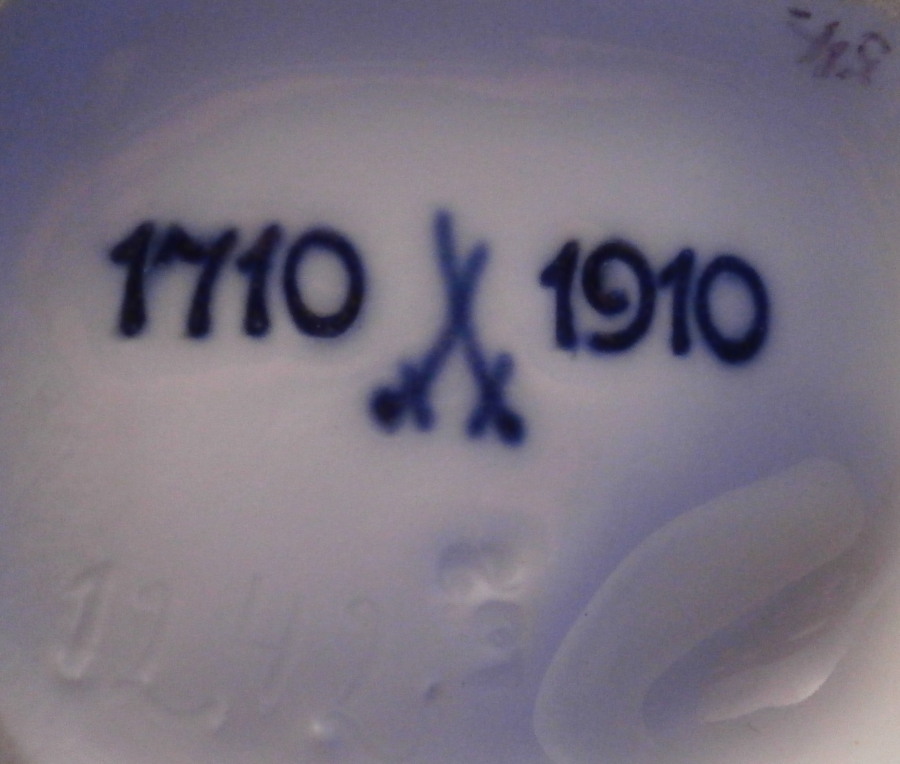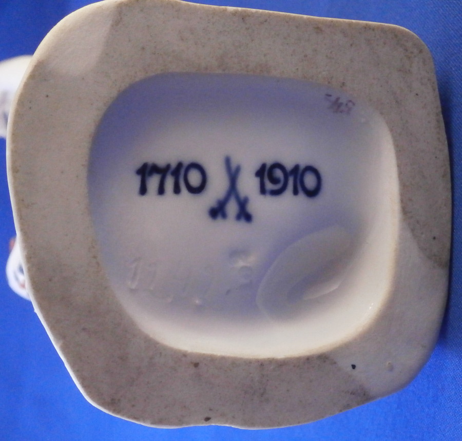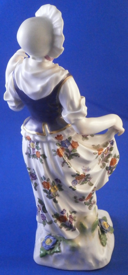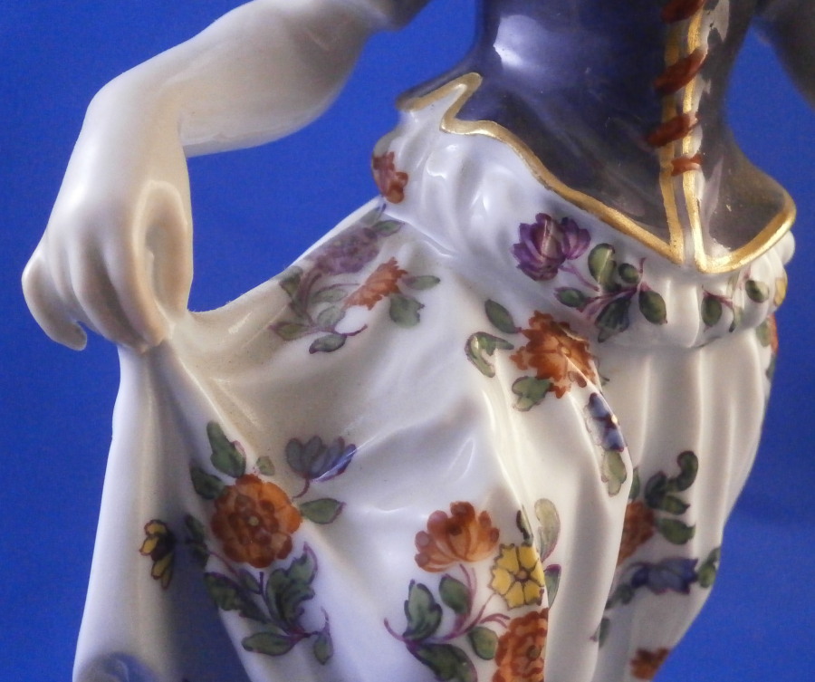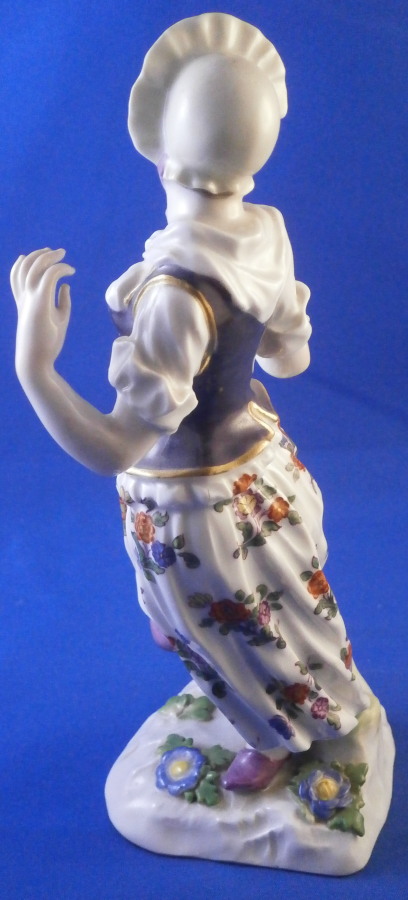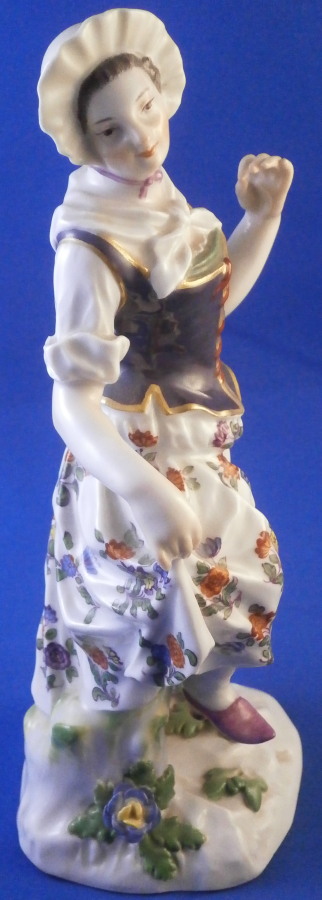 This is a figurine of a dancing peasant woman made by Meissen in 1910. A very ahrd to find figure that was first modeled by Kaendler in the mid 18th century. The lady is wearing a hat and fancy dress while standing on a base with a few leaves and flwoers to it. One of her hands is in the air while the other is holding up her floral skirt a little bit to make it easier to dance. A really nicely modeled piece and superbly hand painted. The figure is in great condition with one chipped leaf, another one that looks to have been chipped during the making as the edge is colored and an odd spot on the side of her left elbow area where it looks to ahve been stuck to another peice during the firing. They ground it down and it was painted over when it was painted so definitely from when it was made. Oddly enough still deemed a first choice! The piece displays perfectly and looks stunning! She is 7.5 inches tall, 3.375 inches wide and 2.75 inches deep. It is marked with the crossed swords anniversary mark underneath with the years 1710 and 1910 to either side. It also has the usual impressed and painter's marks underneath as shown. Please email me for more information or other pictures.