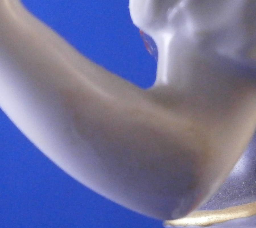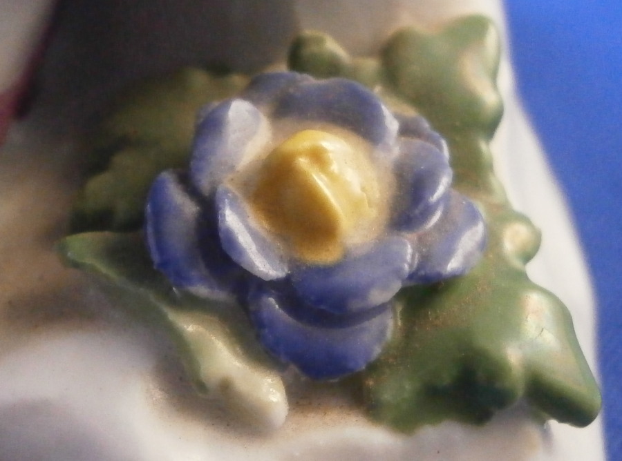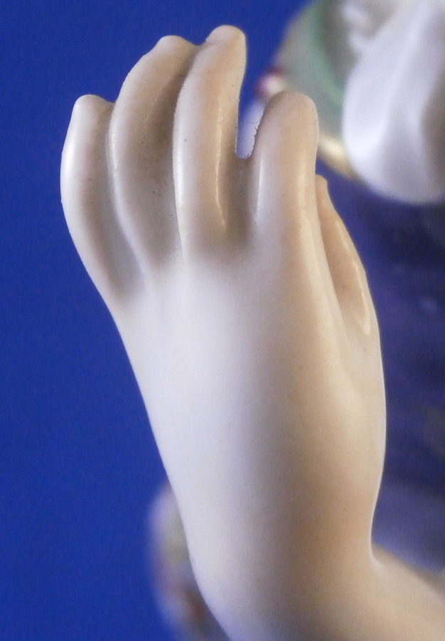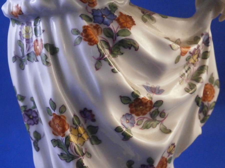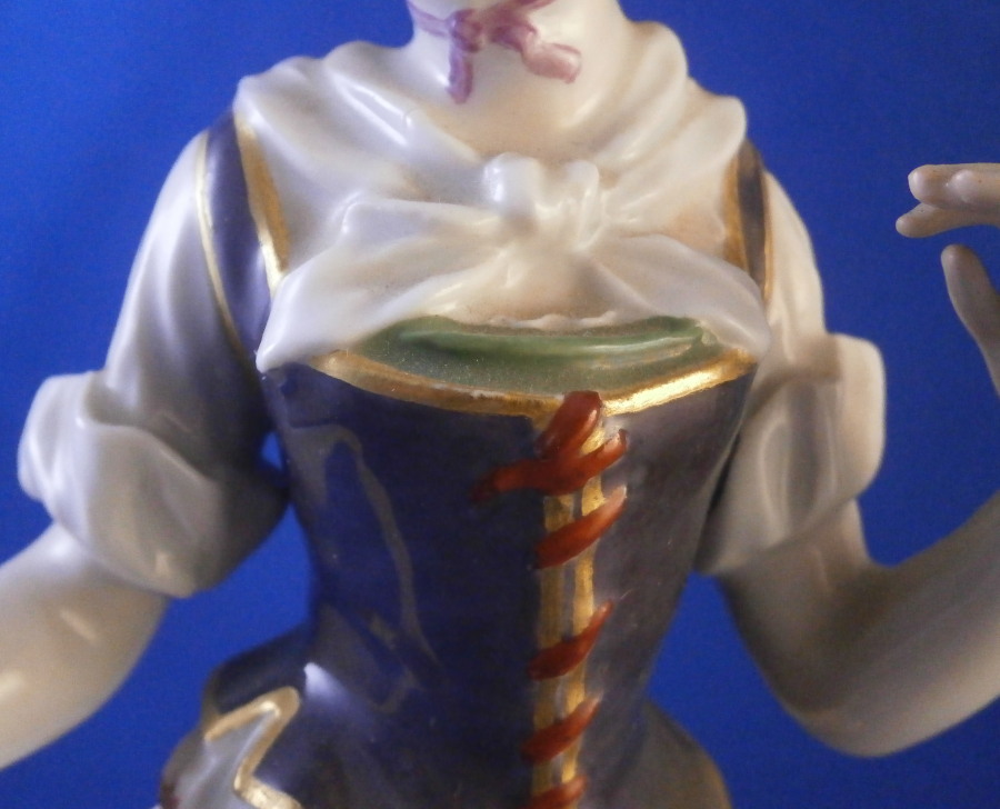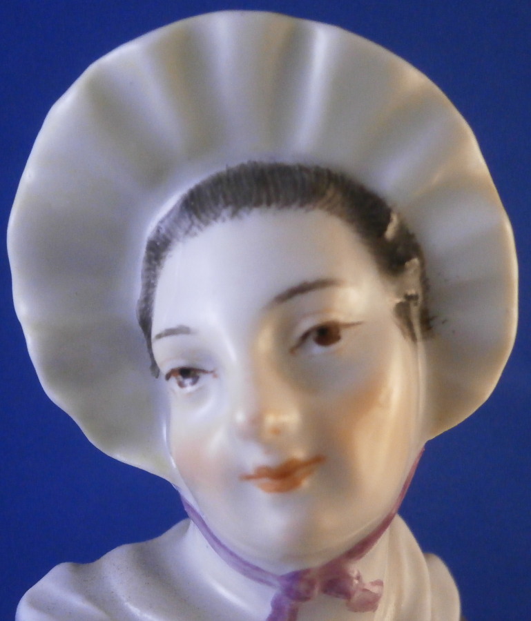 This is a figurine of a dancing peasant woman made by Meissen in 1910. A very ahrd to find figure that was first modeled by Kaendler in the mid 18th century. The lady is wearing a hat and fancy dress while standing on a base with a few leaves and flwoers to it. One of her hands is in the air while the other is holding up her floral skirt a little bit to make it easier to dance. A really nicely modeled piece and superbly hand painted. The figure is in great condition with one chipped leaf, another one that looks to have been chipped during the making as the edge is colored and an odd spot on the side of her left elbow area where it looks to ahve been stuck to another peice during the firing. They ground it down and it was painted over when it was painted so definitely from when it was made. Oddly enough still deemed a first choice! The piece displays perfectly and looks stunning! She is 7.5 inches tall, 3.375 inches wide and 2.75 inches deep. It is marked with the crossed swords anniversary mark underneath with the years 1710 and 1910 to either side. It also has the usual impressed and painter's marks underneath as shown. Please email me for more information or other pictures.