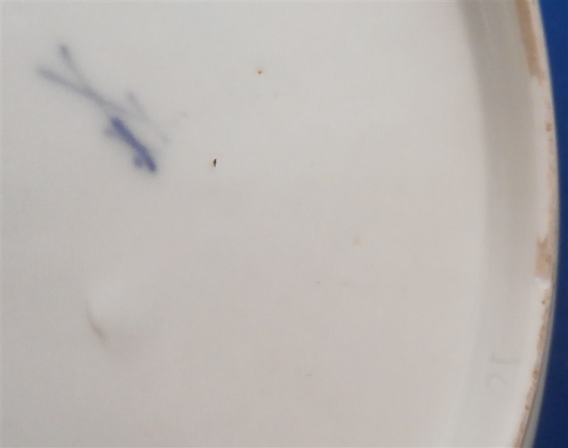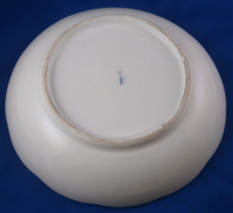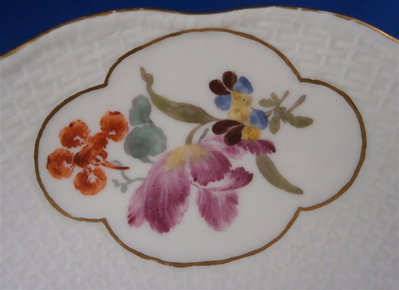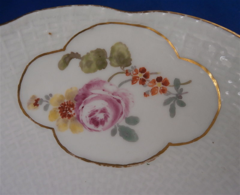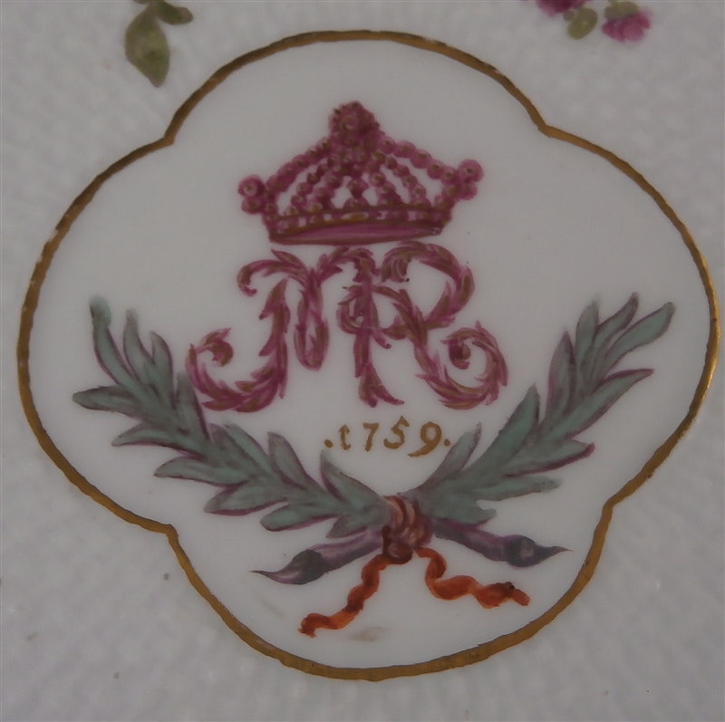 This is a fun early dish made by Meissen in about 1759. The plate has a superb basketweave design to the paste throughout and is hand painted with some nice floral arrangements with smaller flowers scattered throughout. Some gold trim around two medallions and the edge. The best part is a central monogram in puce of MR under a crown with a leaf design underneath it. Definitely made for royalty or nobility! The dish is in perfect condition. It is 1.5 inches tall and 7.5 inches in diameter. The bowl is marked with the underglaze blue crossed swords mark as shown. Please email me for more information or other pictures.