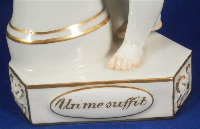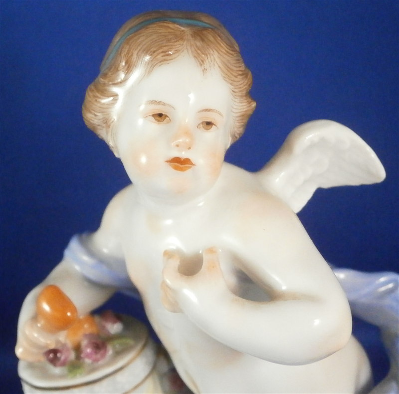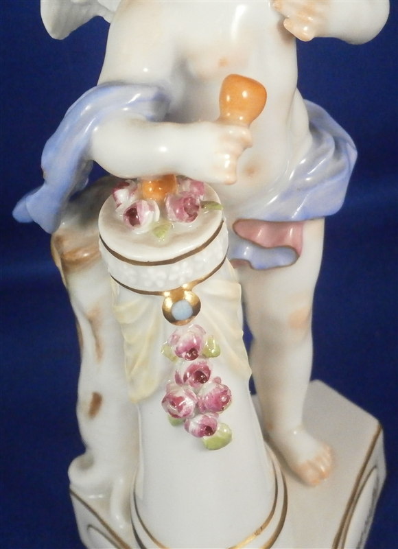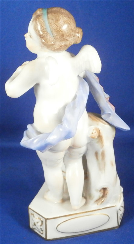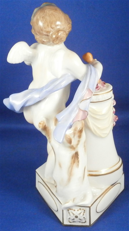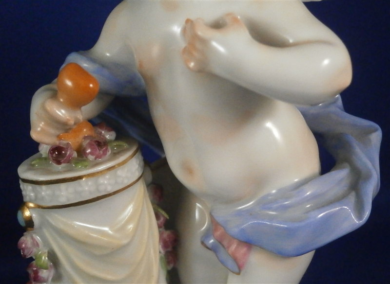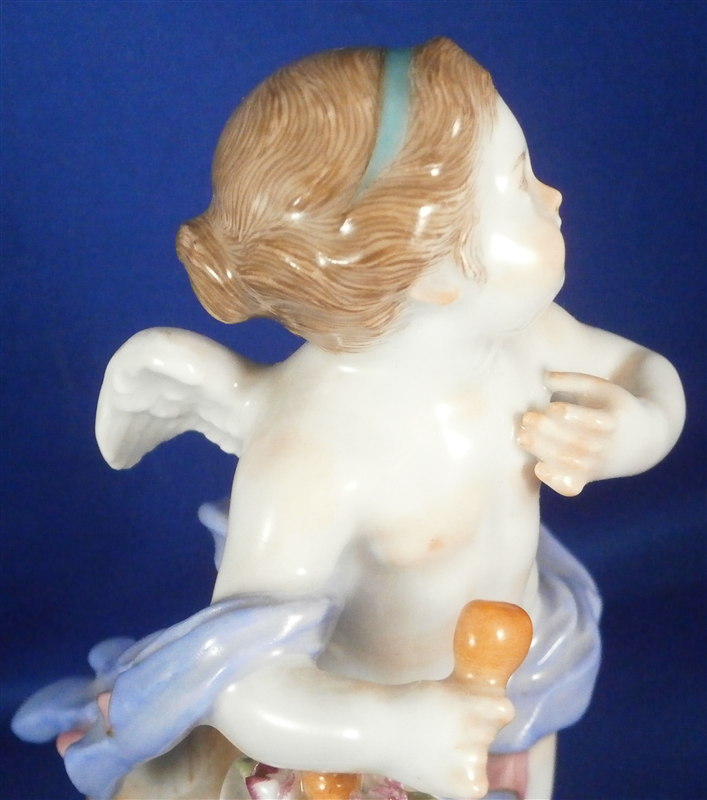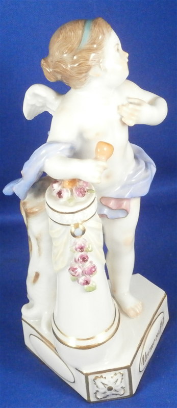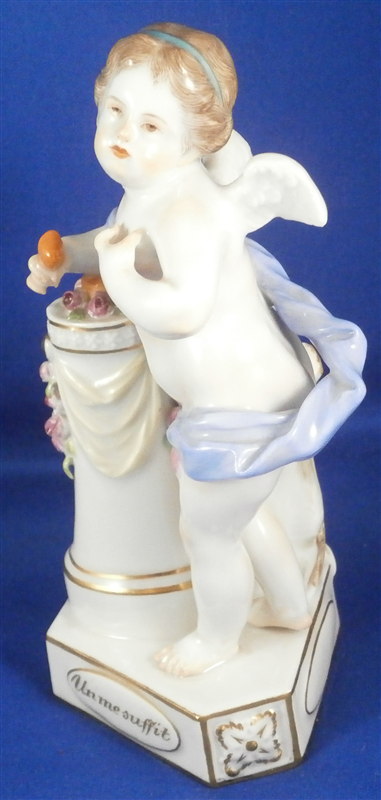 This is a figure made by Meissen in the 20th century. It is one of Devisenkinder figurines this one having the saying "Un me suffit" on the base meaning "One is enough for me" or something along those lines. It is a female cherub standing by a pedestal draped in flowers with one heart on top of the pedestal in the flowers and another in her right hand. Nice modelling and decoration as one expects from a Meissen piece. The figurine is in perfect condition except maybe one tiny leaf chip. It is marked underneath with the crossed swords as well as the incised model number F.8, the usual impressed marks as well as a painter's number. The figure is 5.625 inches tall, 3.25 inches wide and 2.5 inches deep. Please email me for more information or photos.