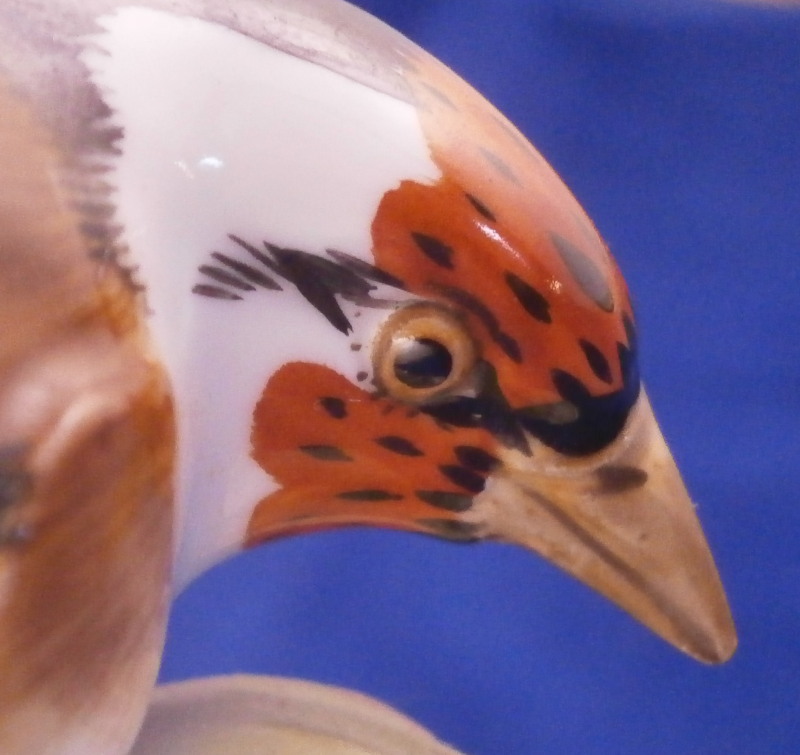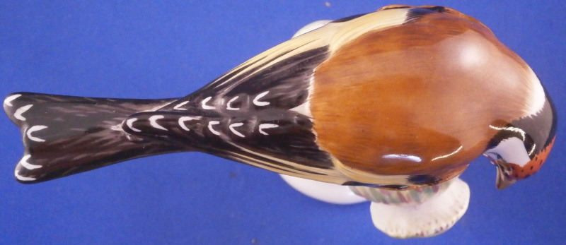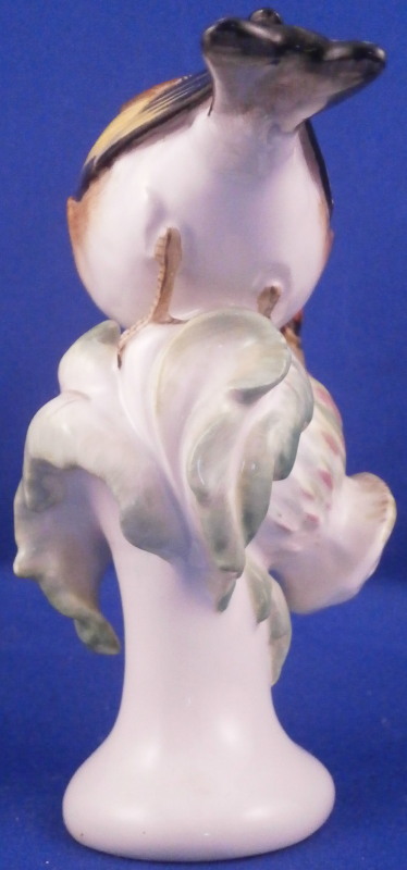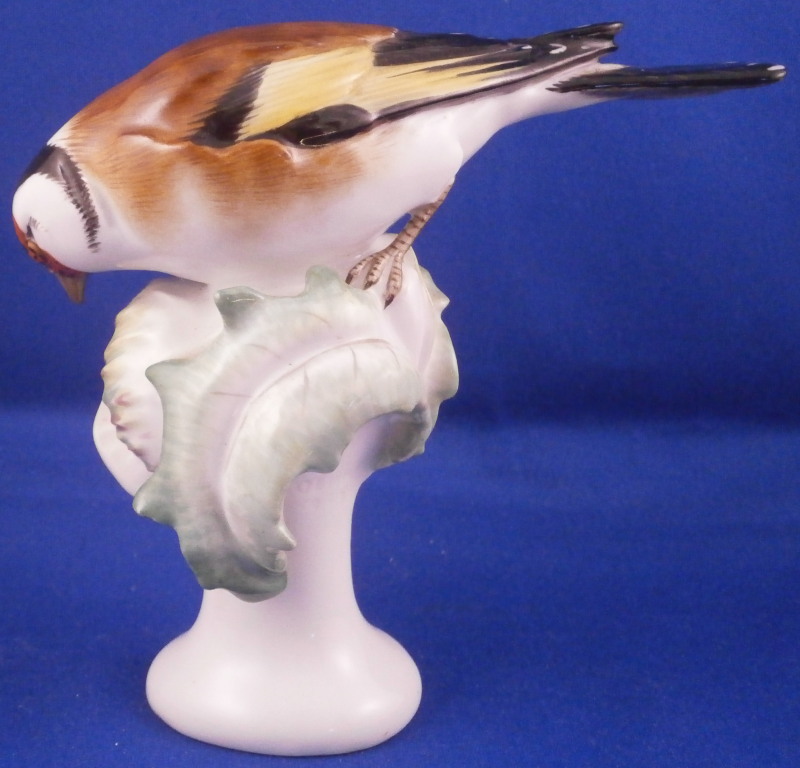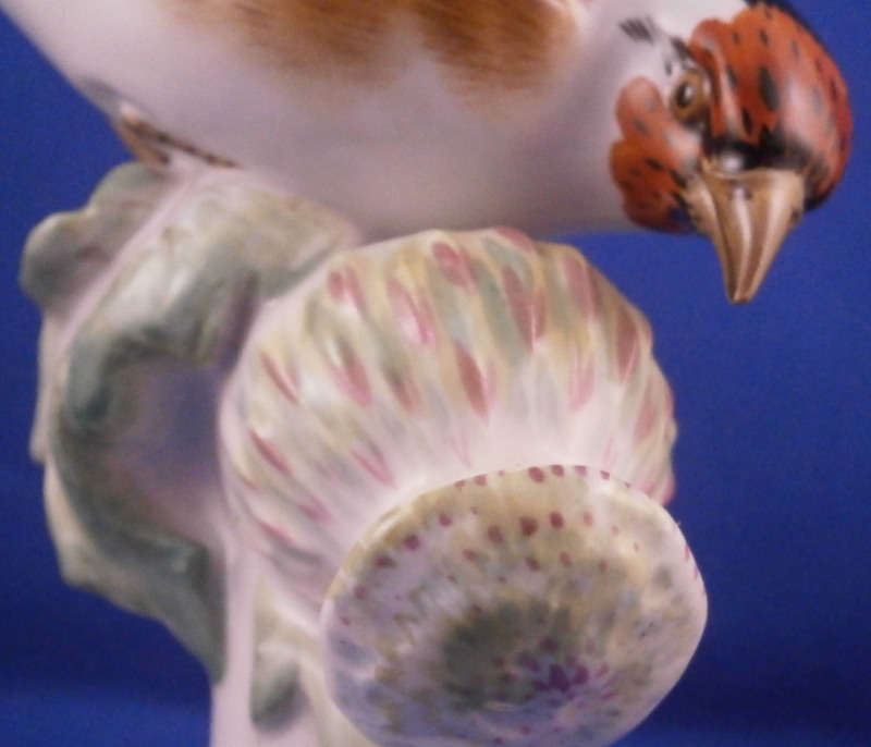 This is a great figurine of a bird made by Meissen in the mid 20th century. It is a goldfinch sitting on a thistle and pecking at the blossom. This piece is not easy to find and really one of their nicer bird figured in this size. It was first modeled by the famous Erich Oehme in the early 20thc entury. A very well modeled and superbly painted figure which is more colorful than many of the other birds they made in this style. The figure is in perfect condition. It is marked underneath with the under glaze blue crossed swords mark as well as the usual impressed numbers from the period as shown. Also impressed on the back base under the thistle leaf is the artist name and year it was modeled which I think is 1913 - hard to see! The figurine is 4.5 inches tall, 2.5 inches wide and 4.75 inches long. Please email me for more information or other pictures.
