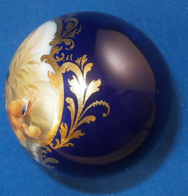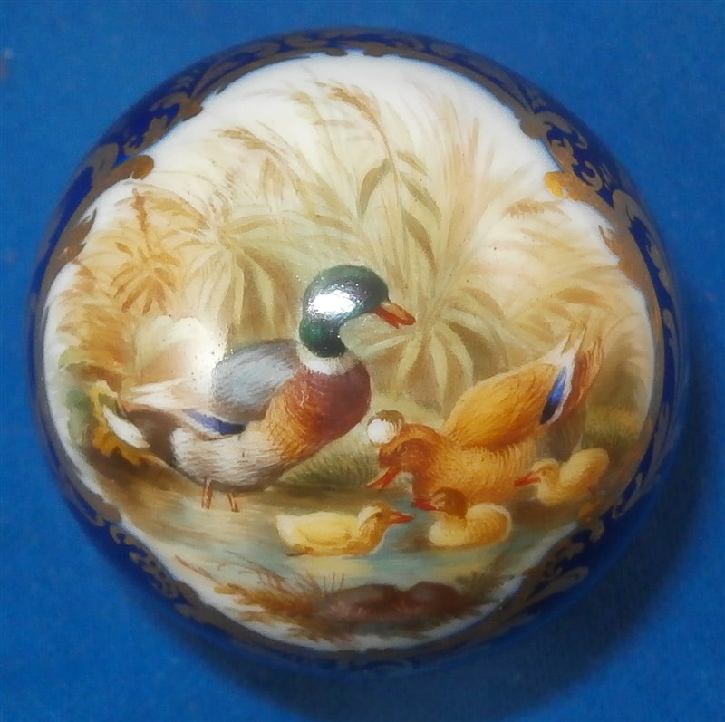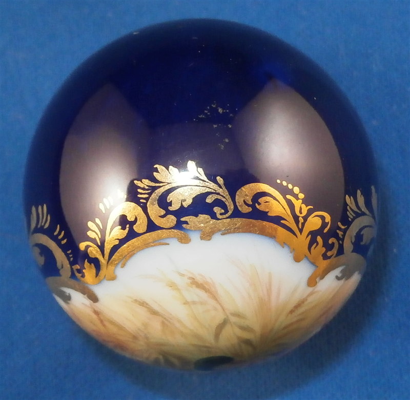 This is a cane or umbrella handle made by Meissen in the late 19th century or early 20th century. It is handpainted with a very high quality detailed scene on the top part including a duck family in a landscape surrounding with nice gilding surrounding the scene and the hole on the bottom. It is in the shape of a ball and is in perfect condition. It was probably never used or used very few times. The piece is marked on the inside hole where it usually would not be visible when attached to a cane or umbrella but it is faint and didn't come out that well in the pictures though it is still visible! But it is obviously Meissen. The handle is 1.625 inches in diameter and the inside diameter of the hole is about 0.25 inches. Please email me for more information or other pictures.