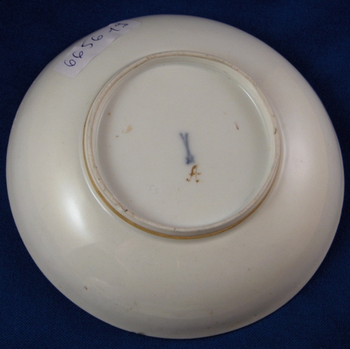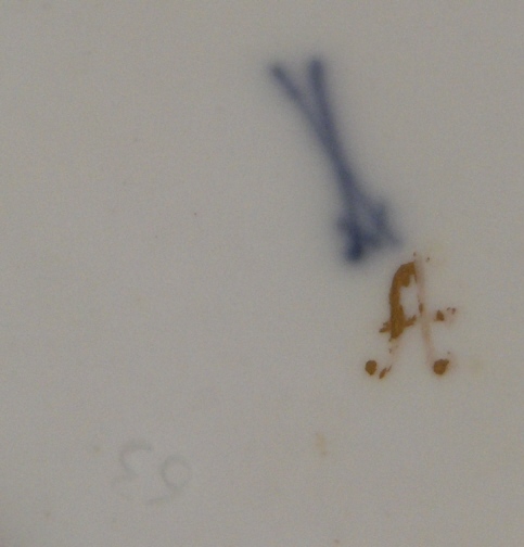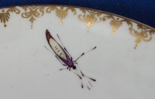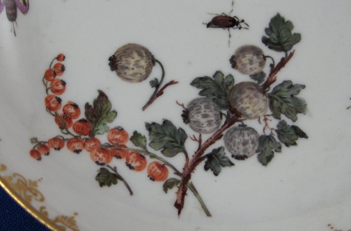 This is a great early saucer made by Meissen in about 1745. It is handpainted with some superb bugs including a large butterfly. There is also an arrangement of what look to be red and white currants with their twigs and leaves. Superb gold trim to the rim. The saucer is in superb condition with very very minimal wear to the gilding and a tiny chip from the making. The saucer is 1 inch tall and has a diameter of just over 5.25 inches. It is marked with the underglaze blue crossed swords mark underneath as shown as well as an impressed 63 and a script A as a gilder's mark. Please email me for more information or other pictures.