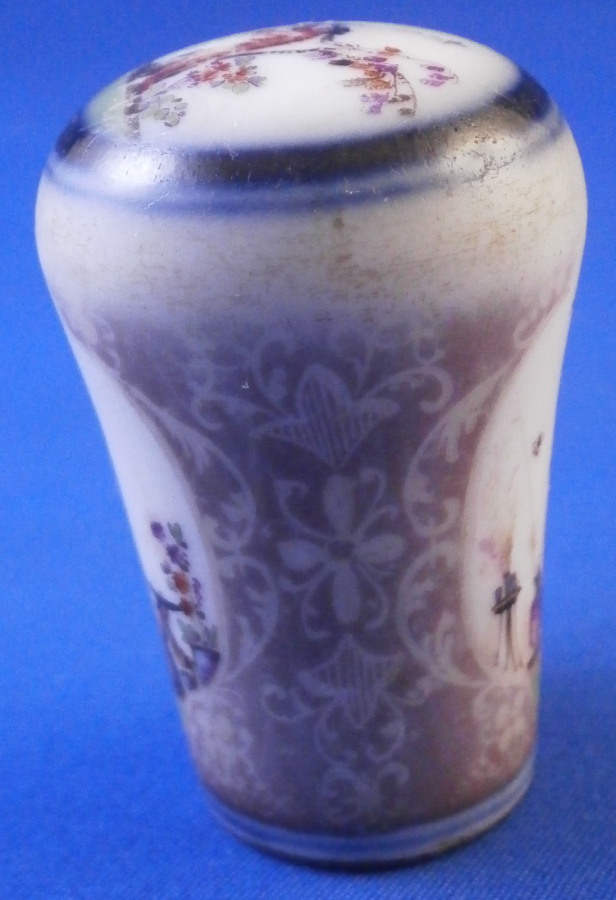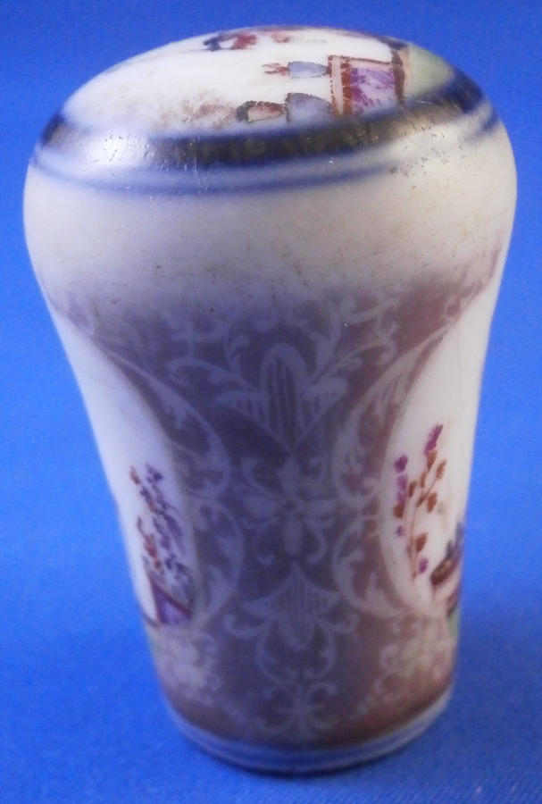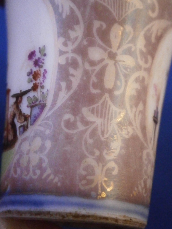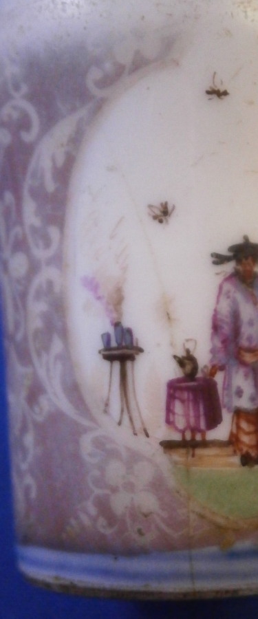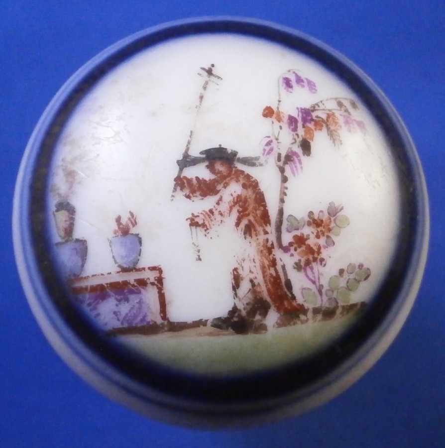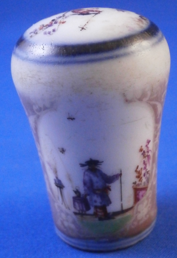 This is a rare early cane / umbrella handle made by Meissen around 1725-30. It is hand painted with a superb Chinoiserie scene to the top as well as one to the front and another to the back of the side. Double under glaze blue line trim around the scene on the top, another blue line trim to the bottom edge and the area between the scenes was once filled with the famous Boettger luster color with gold trim over that. The gold trim has mostly worn off sadly and there is wear to the scenes and along the top edge. This piece was heavily used which was kind of the point. Someone had some serious money to be able to buy it and use it. Each scene has a hairline crack from the bottom opening up the side as shown. Not uncommon if it was attached to wood which expanded and contracted with the seasons. It's still a nice survivor as these pieces are extremely rare. And Chinoiserie pieces are hard to come by these days that's for sure! The handle is just over 1.75 inches tall and 1.25 inches in diameter. It is unmarked as far as I can tell but there is lots of old resin glue type residue inside so it might be hiding something under it. The quality and style easily give it away as a very early Meissen piece. Please email me for more information or other pictures.