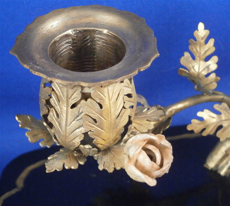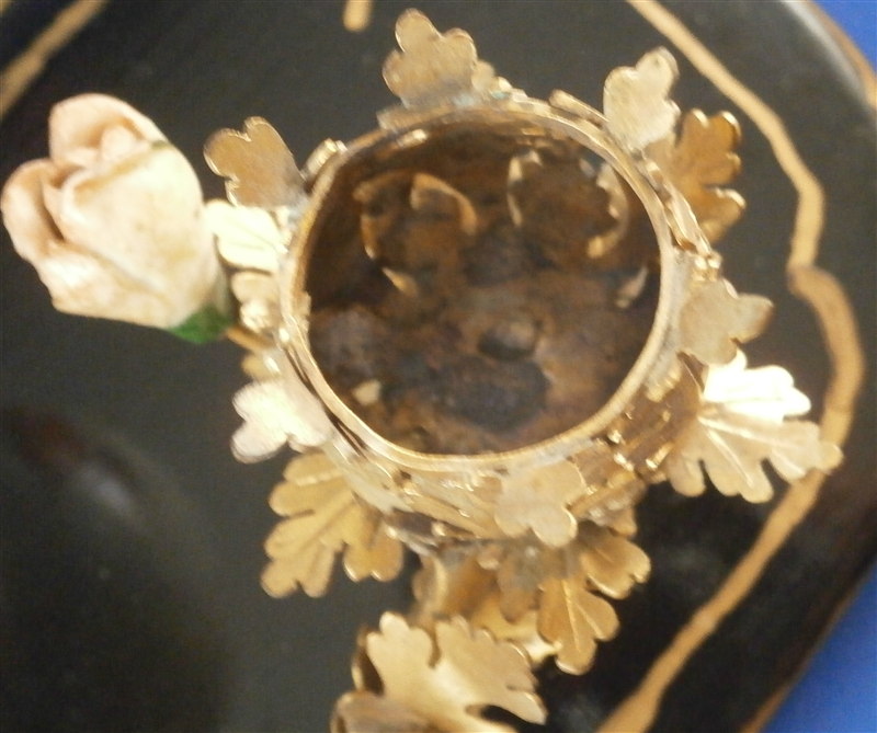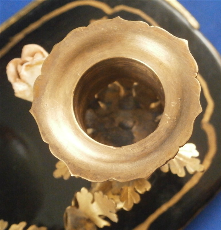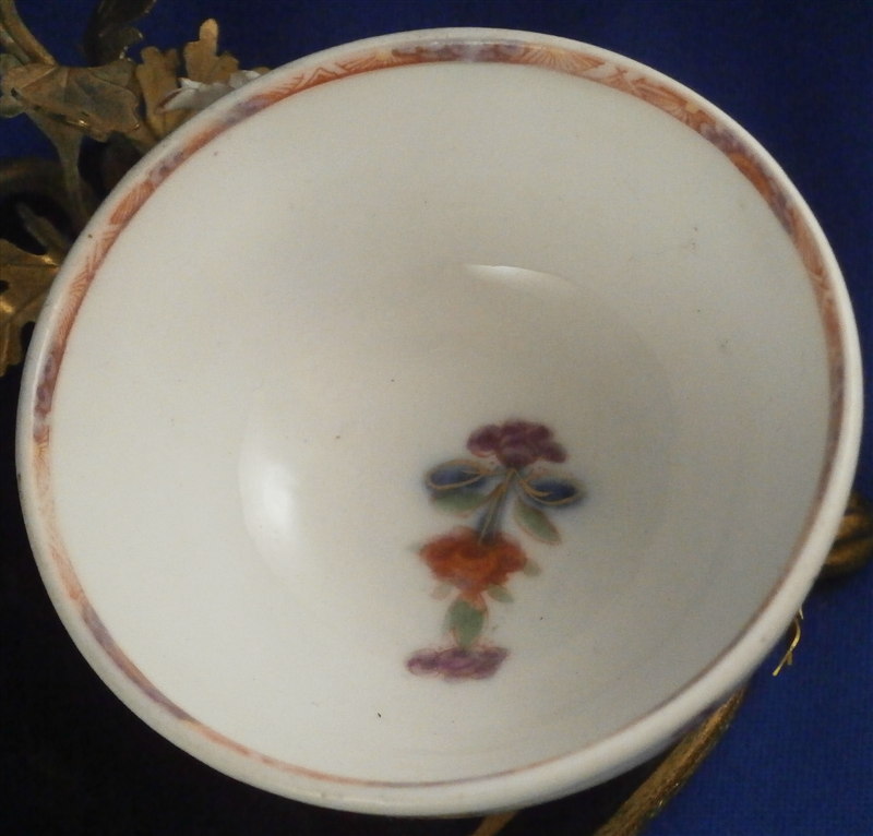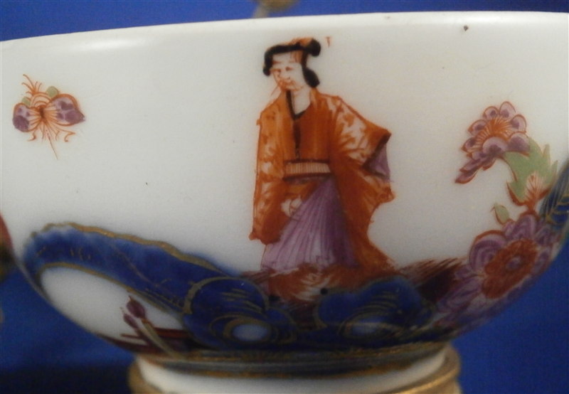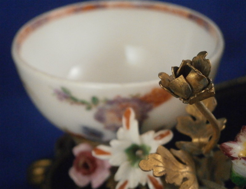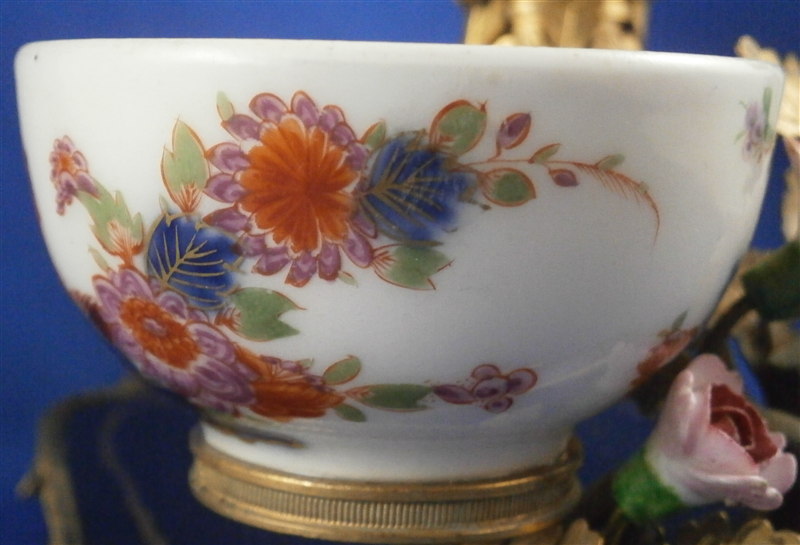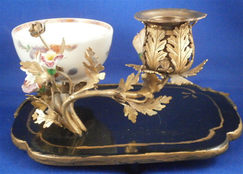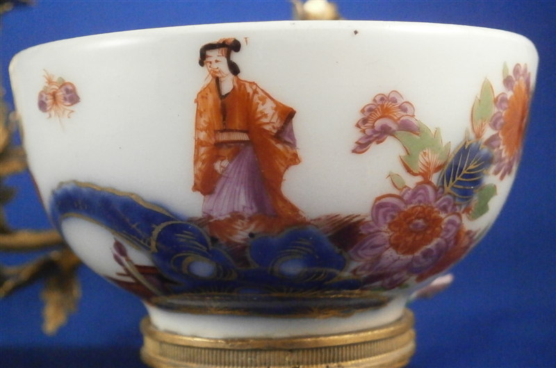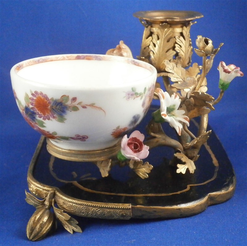 This is something a bit different :) The reason I bought it was that there is a tea bowl or Köppchen involved that was made by Meissen pre 1750. Hard to tell an exact date without seeing the udnerside but I suspect it is from 1735-45 but definitely not later than the mid 18th century. The teabowl is hand painted with a Kakiemon design reminicent of the Tischchenmuster in terms of colors and flowers but it includes an Asian lady which is superb! The porcelain cup displays perfectly but has had an expert restoration to a large chip on the backside which is not visible whatsoever. It was made into a spill or match holder type thing by combining it with an ormolu candle holder with porcelain flowers and a black laquer base highlighted with gilding. That part I would say is from the mid to late 19th century. All in all a really interesting setup. The one porcelain flower had some work done to it but otherwise the piece has no flaws and it displays superbly. No marks visible. The entire candleholder setup 6.5 inches wide, 4 inches deep and 3.625 inches tall. The tea cup is is It is about 1.5 inches tall and 2.75 inches in diameter. Please email me for more information or other pictures.