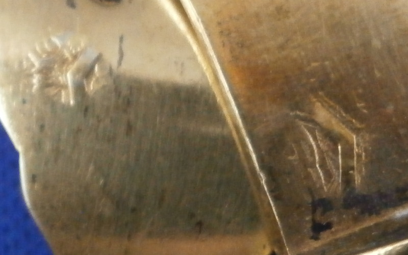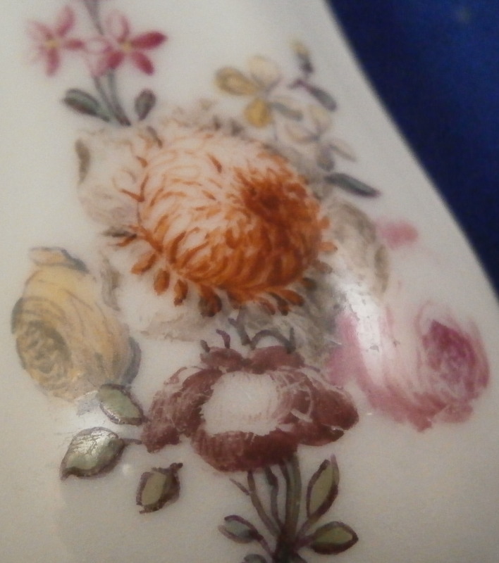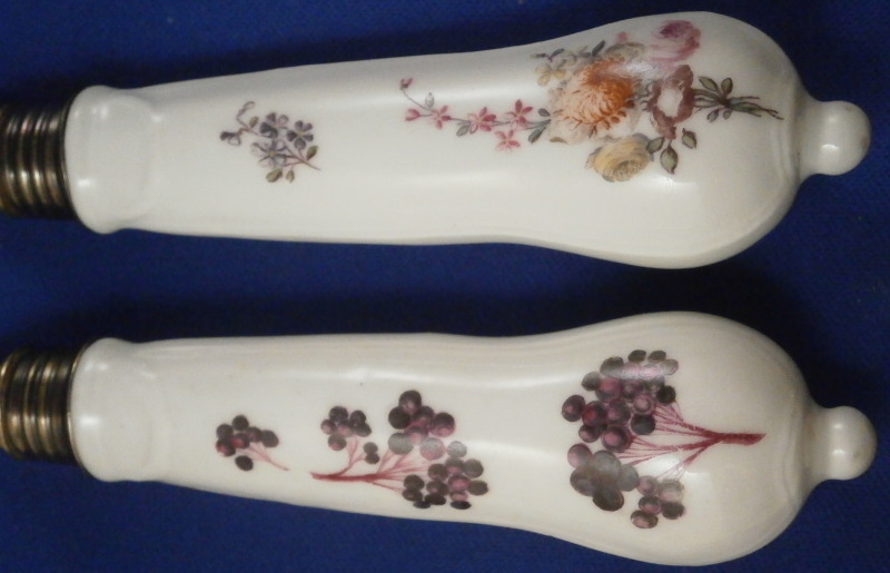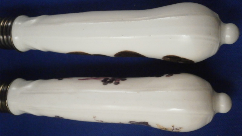 This is a really nice knife and fork set with the porcelain handles made by Meissen in about 1735-40. The nicest I have seen in this style! The handles are large and superbly decorated with large floral arrangements as well as single flowers and lots of fruit. One side is mainly flowers while the other has mainly fruit to it. The handles are thicker than most I have come across and perfect for me and my large hands. They have a bit of molded detail to them but the best part are definitely those fruit and flowers in the early woodcut style. The ends are porcelain knobs instead of the more often seen metal. The metal parts have been replaced sometime around the late 19th century with 800 Sterling Silver by the silversmith Alphonse Debain if I am correct. The pieces all have his mark of an A and a D with some sort of bird in between. Also a Minerva head I believe for the 800 silver mark. The blades and fork are gilded.for a little extra class. I think that is what they call vermeil but I don't know much about that. I stick to porcelain :) The pieces also have some sort of odd impressed mark on the opposite side of the minerva head mark. Not sure why. Either way - these are superb pieces. The two handles are in great condition with some very minor wear. They display perfectly and are just amazing! The fork is 7.25 inches long of which 3.5 inches is the length of the visible porcelain handle. The knife is 8 inches long of which 3.5 inches is the visible porcelain handle. The handles are 1.125 inches wide and 0.875 inches thick at the end. The porcelain is not marked or shall we say visibly marked since it would be hidden by the ferrule which is normal but it is definitely made by Meissen during this period. No mistaking their style and quality! I have four more sets if anyone would like a few. Please email me for more information or other pictures.