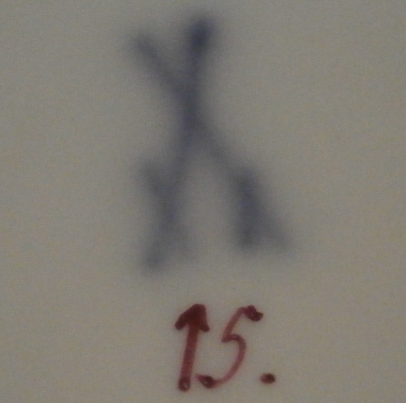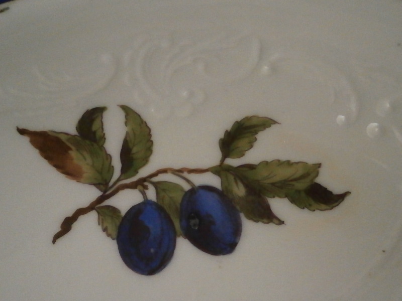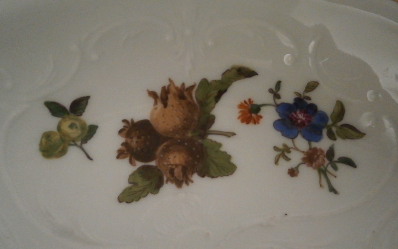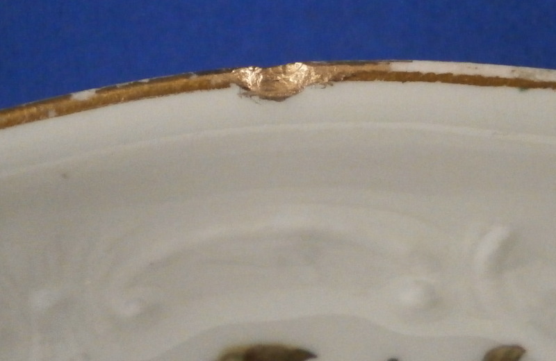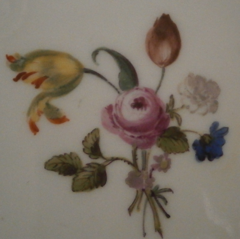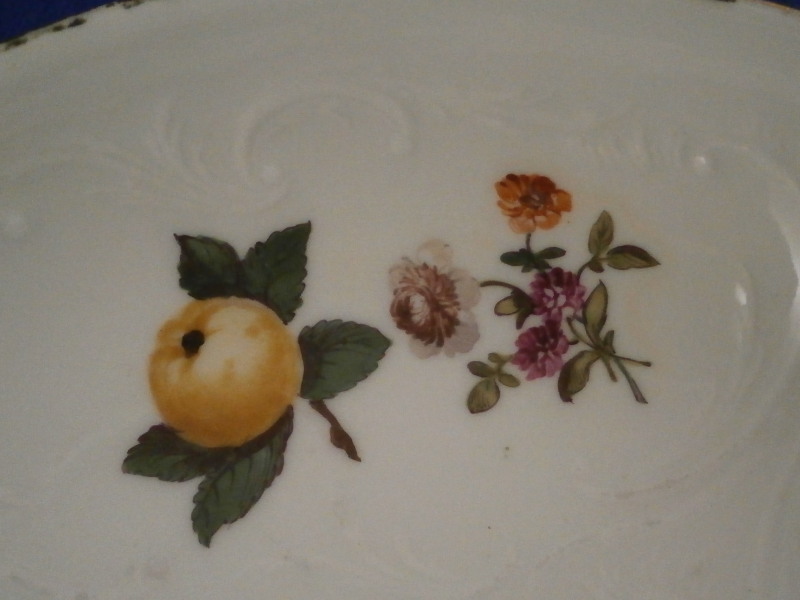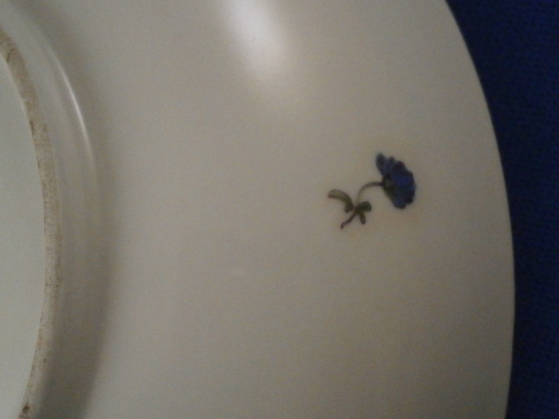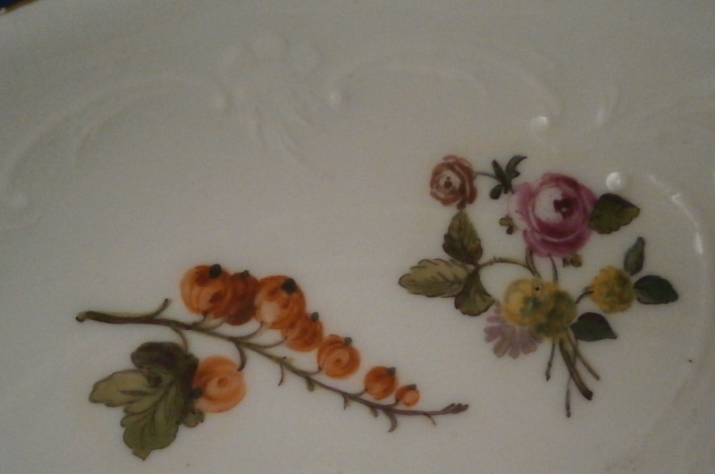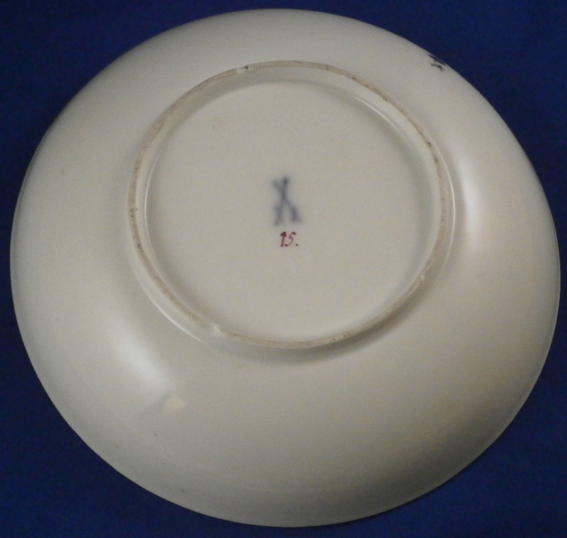 This is a great saucer made by Meissen in about 1750. It is hand painted with a few nice small floral arrangements, nuts, plums, red currants, and some sort of yellow fruit and has lots of nice relief designs to the paste as shown. Gold trim to the saucer edge. The saucer is in great condition with a tiny chip to the very edge that was gilded over to hide a bit and some wear to mostly the gold trim along the edge. A spot on the purple plum has had the color flaked off and was colored in a bit to hide that. A nice piece that still displays superbly. The saucer is 1.125 inches tall and 5.375 inches in diameter. It is marked with the under glaze blue crossed swords mark underneath as well as a puce 15. and an impressed number as shown. There is also a little flower painted on the underside rim to hide a firing flaw. Please email me for more information or other pictures.