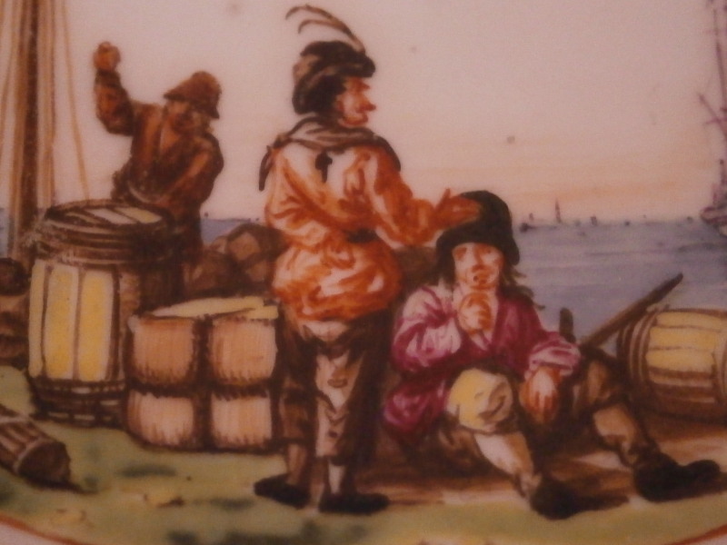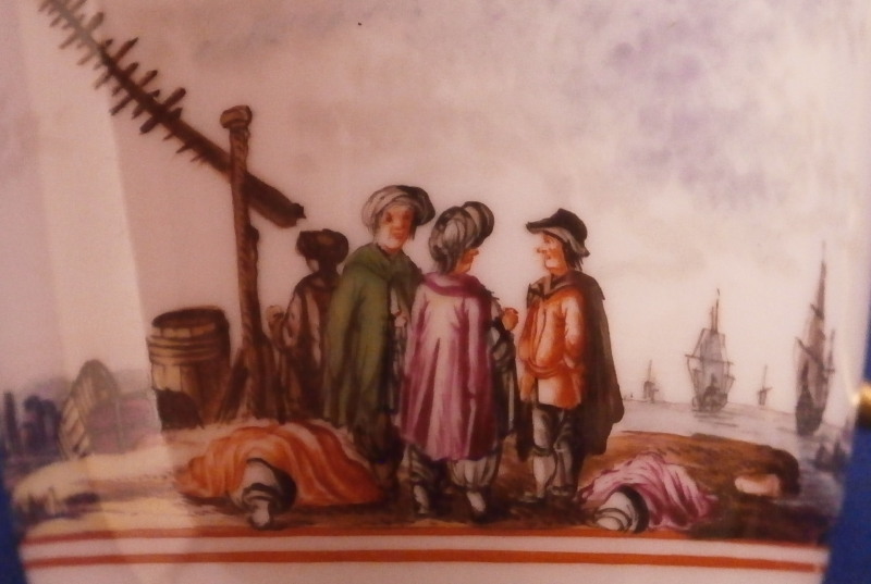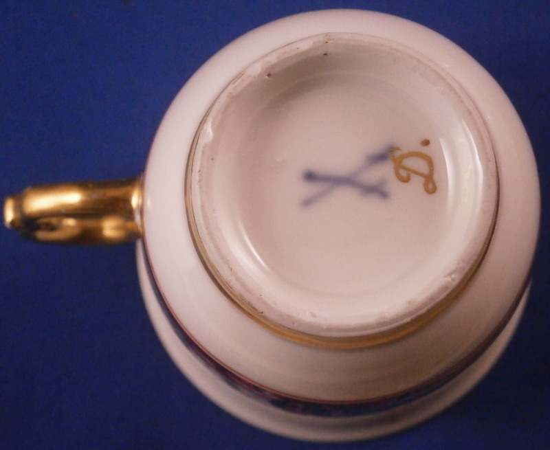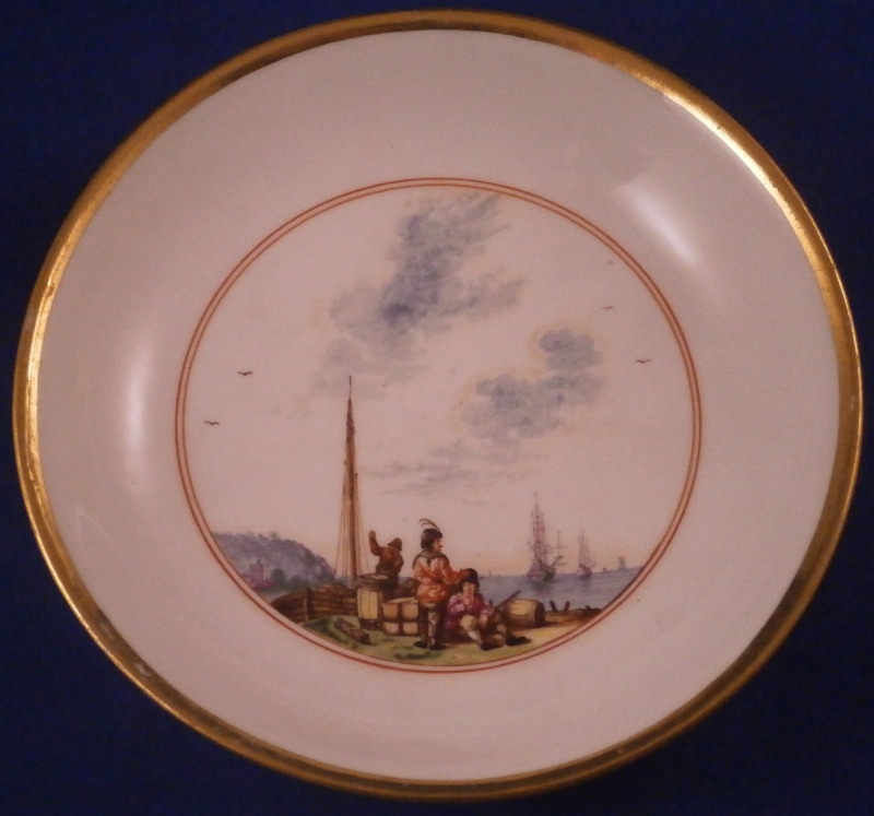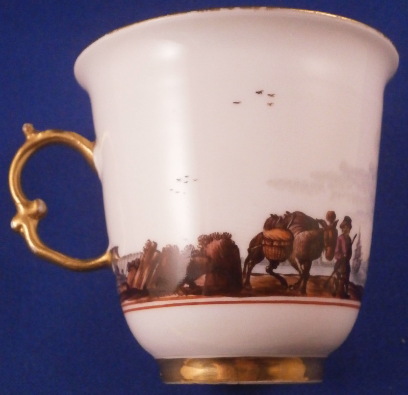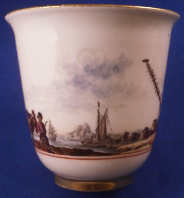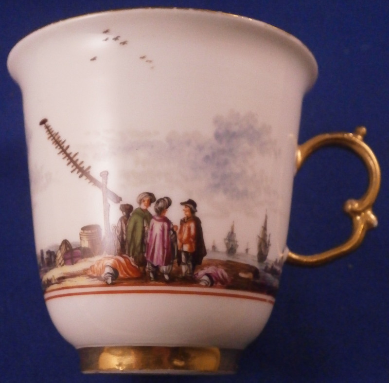 This is a really nice and early beaker style chocolate cup and saucer made by Meissen in about 1740. Both are superbly hand painted by Christian Friedrich Herold by the looks of it with a very nice harbor / merchant type scene in the center of the saucer that is surrounded by a double red line trim and a scene all around the cup with the double red line trim under it. Simple gold trim to the edges as well as the handle which has a typical shape for this early period. The scenes are of very good quality with people in them as well as ships, clouds, birds, buildings and even a donkey, etc. These types of scenes are amazing! The set is in perfect condition which is always great with just a touch of gold wear. The saucer is 1.125 inches tall and has a diameter of 5.125 inches and the cup is just under 2.75 inches tall with a diameter of 2.75 inches. Both are marked underneath with the under glaze blue crossed swords mark with the cup having a gold letter D under it as well and the saucer an impressed number so this set dates right around 1740. Please email me for more information or other pictures.