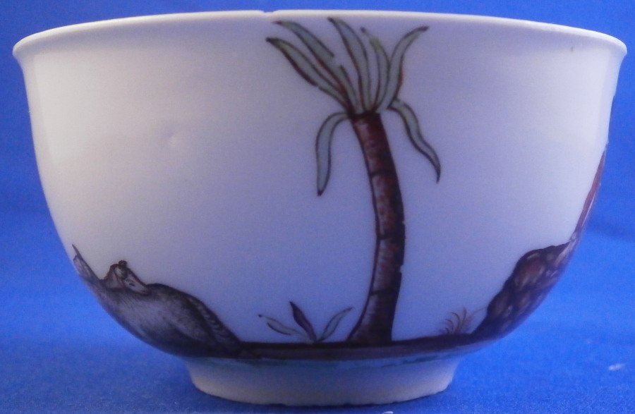 This is a really nice and early teabowl shaped cup made before 1740. The porcelain was made by Meissen around 1730-35 and then later decorated by the famous shop of FJ Ferner around 1745. The piece is hand painted with an amzing all around scene including a lady - likley a shepherdess as well as a gentleman, some sheep and a tree that oddly looks like a palm tree which is quite unusual on German porcelain. Some other greenery in between and a rock on which the gentleman is sitting with a brown and green terrain underneath. Nice flower to the bottom inside. It one of the nicest pieces I have come across by him! The cup is in great condition with a tiny edge chip, flaking of the green on the terrain portaiion of the scene and there used to be a gold trim to the top inside which is gone. A firing crack to the underside which is why Ferner got to decorate it as he bought flawed pieces at a great discount and then decorated them. It displays perfectly and is an amazing looking specimen! The cup is 1.75 inches tall and 3.125 inches in diameter. It is marked with the under glaze blue crossed swords mark underneath - a nice and early version. No impressed number yet! Please email me for more information or other pictures.