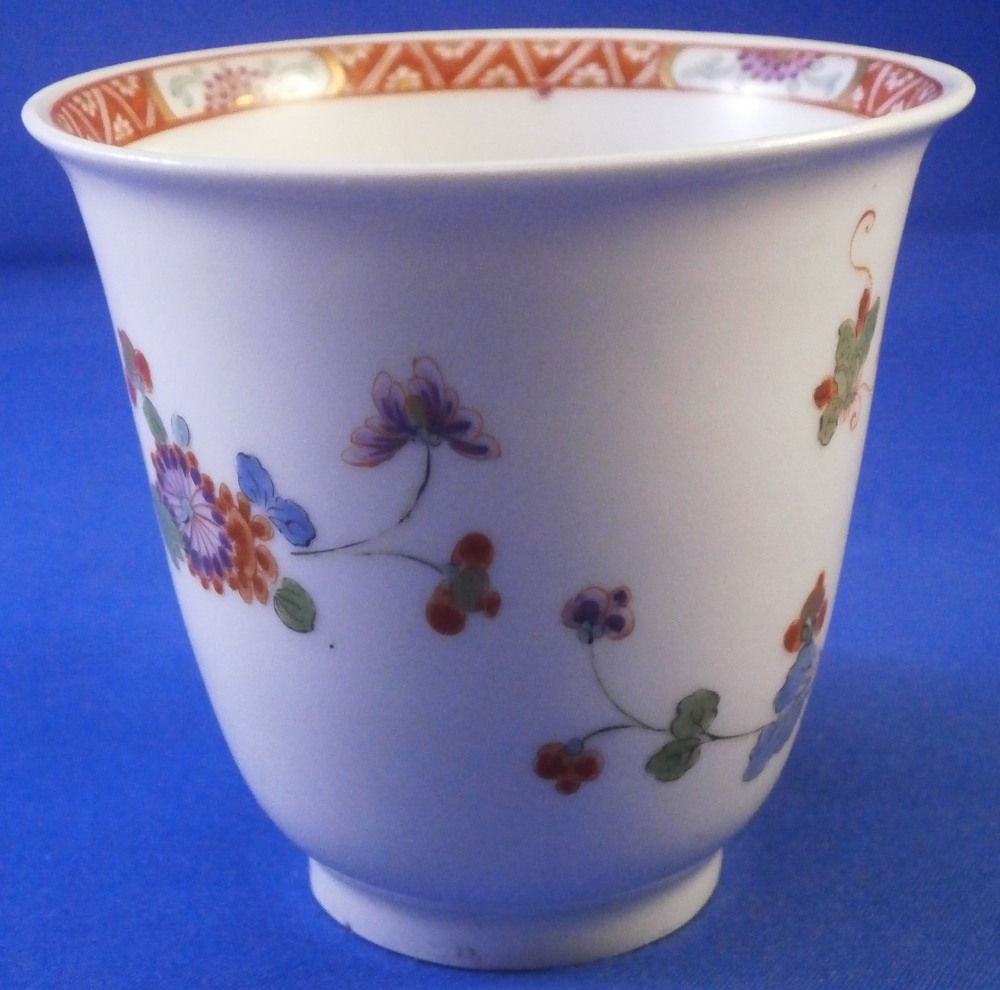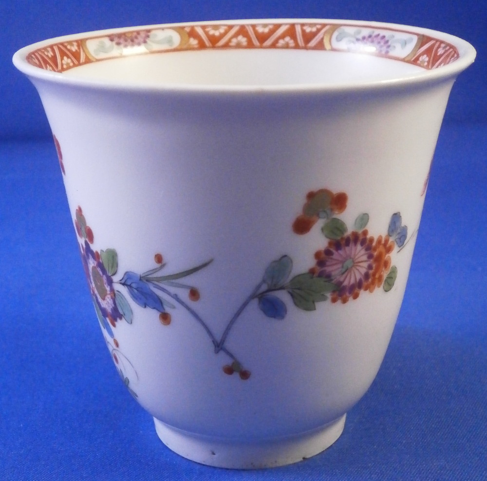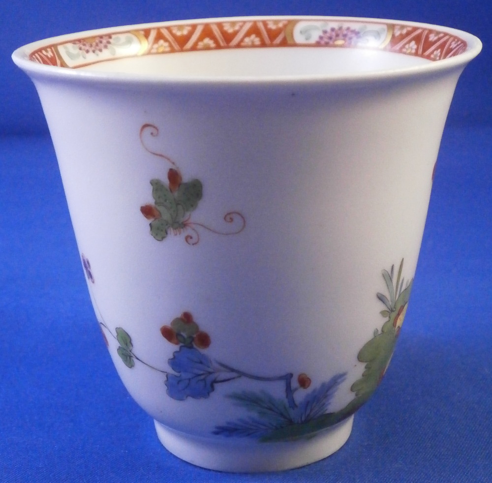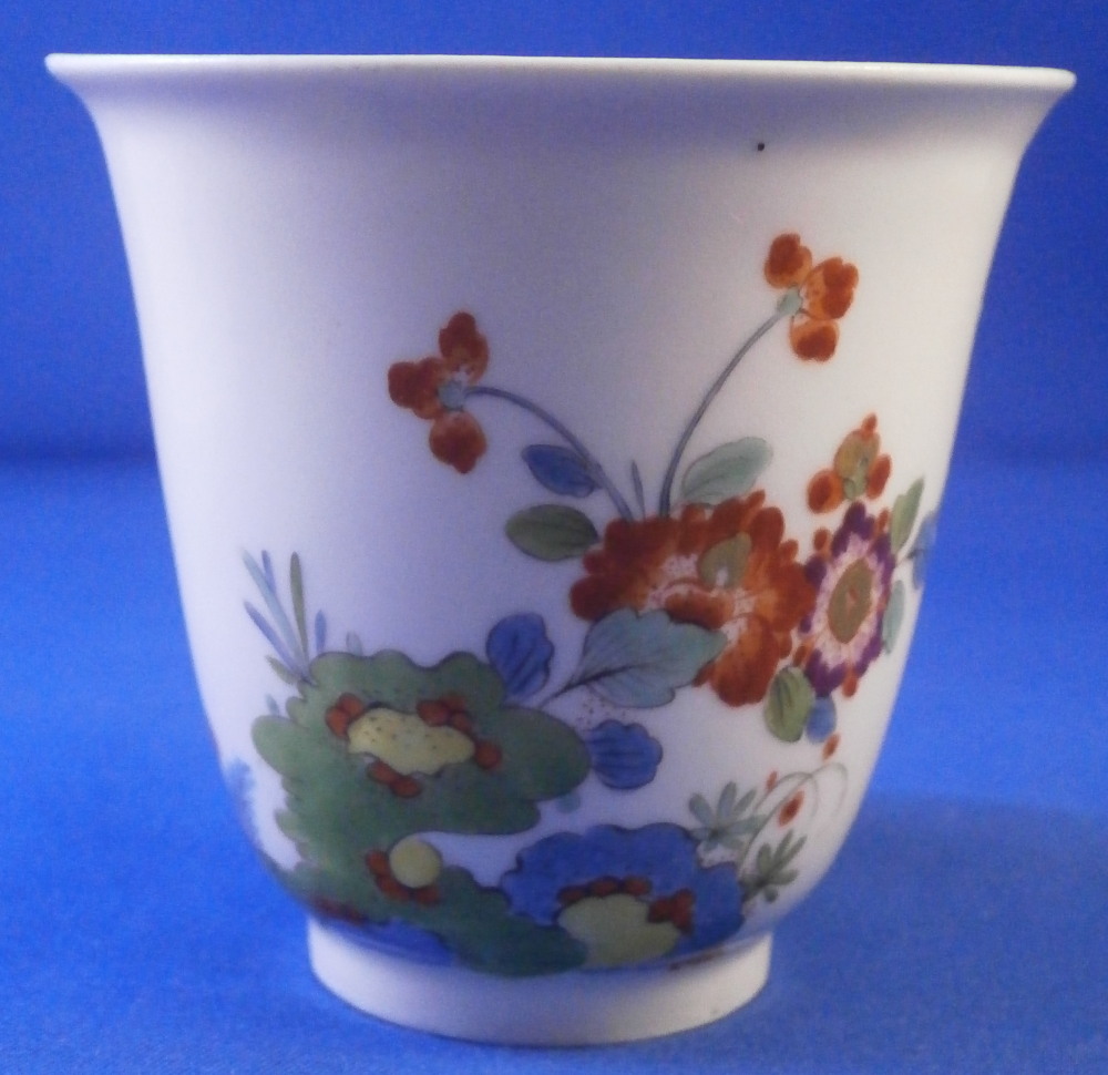This is superb handleless beaker style cup and saucer made by Meissen before 1740. Both are hand painted in the Kakiemon style with flowering chrysanthemum branches growing from some sort of colorful rock formation and a green and red bug flying above. The flowers cover most of the pieces very nicely and there is a superb trim to the isnide rim. White edge which never had any gilding but I think that is what makes it look even better because the inside trim design is all you need. Kakiemon colors of this period are some of my favorites and this is one superb design! Does not come much better than this! The cup and saucer are in perfect condition with a few very minor firing spots normal to these early wares. As good as they come! Each piece is marked underneath with their early crossed swords mark as shown - no impressed numbers yet so definitely pre 1740. Triple red ring trim to the udnerside of the saucer is also a clue to it having been made early on. Please email me for more information or other pictures.