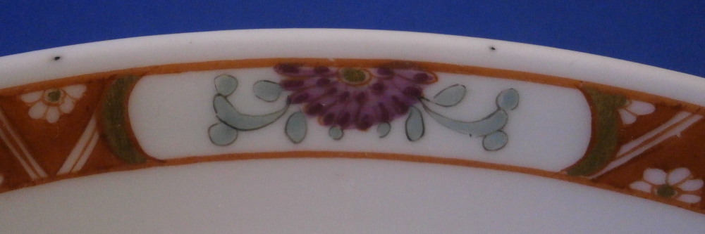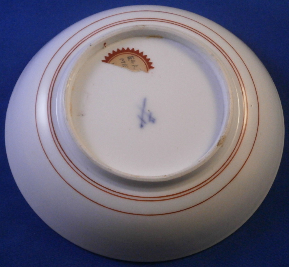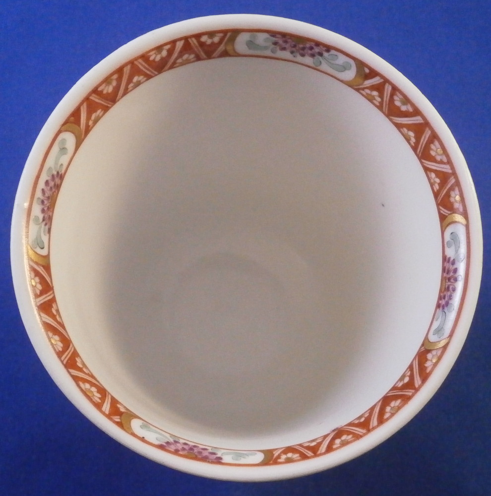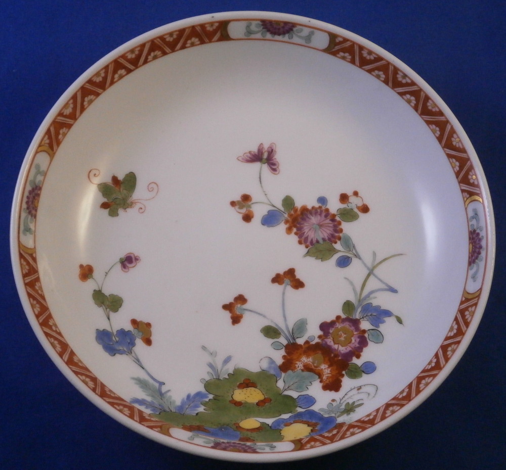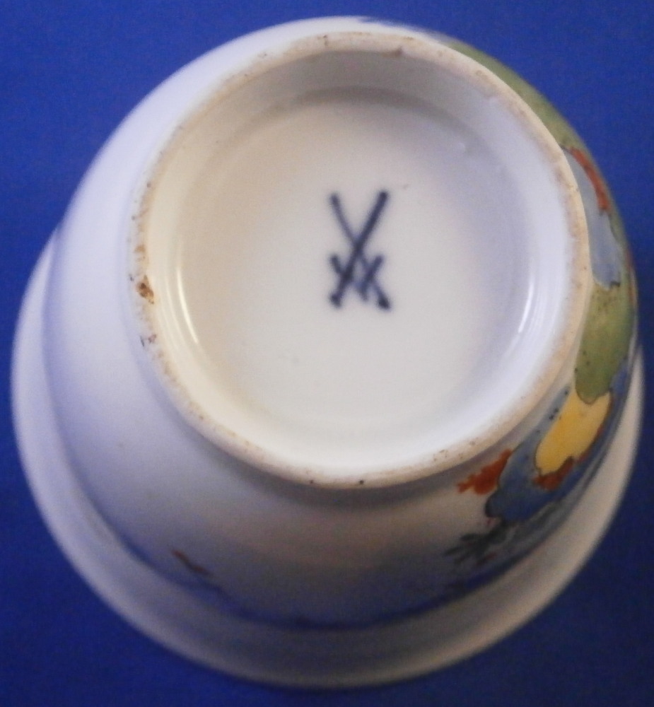 This is superb handleless beaker style cup and saucer made by Meissen before 1740. Both are hand painted in the Kakiemon style with flowering chrysanthemum branches growing from some sort of colorful rock formation and a green and red bug flying above. The flowers cover most of the pieces very nicely and there is a superb trim to the isnide rim. White edge which never had any gilding but I think that is what makes it look even better because the inside trim design is all you need. Kakiemon colors of this period are some of my favorites and this is one superb design! Does not come much better than this! The cup and saucer are in perfect condition with a few very minor firing spots normal to these early wares. As good as they come! Each piece is marked underneath with their early crossed swords mark as shown - no impressed numbers yet so definitely pre 1740. Triple red ring trim to the udnerside of the saucer is also a clue to it having been made early on. Please email me for more information or other pictures.