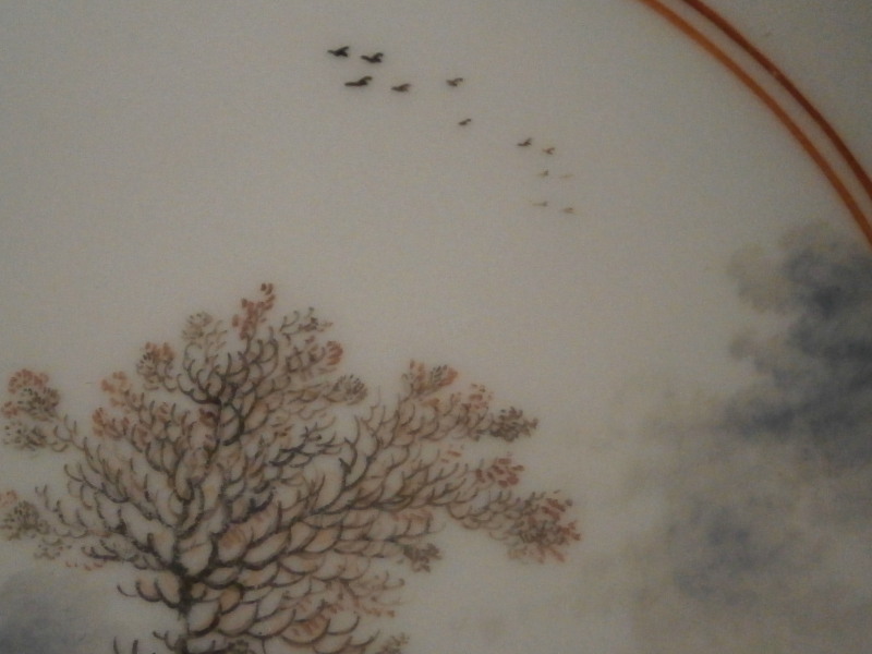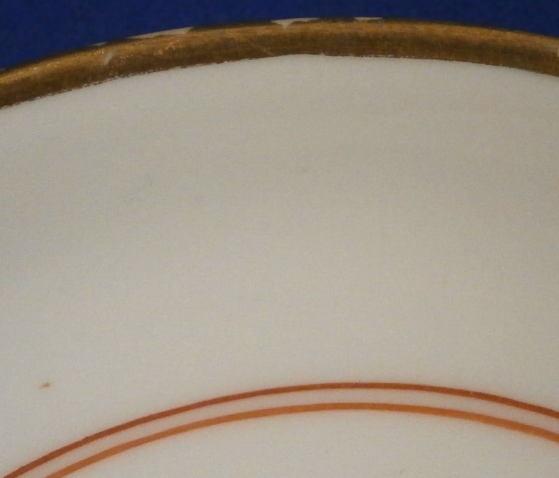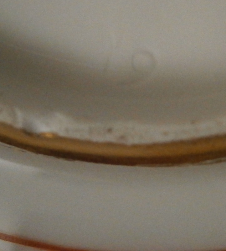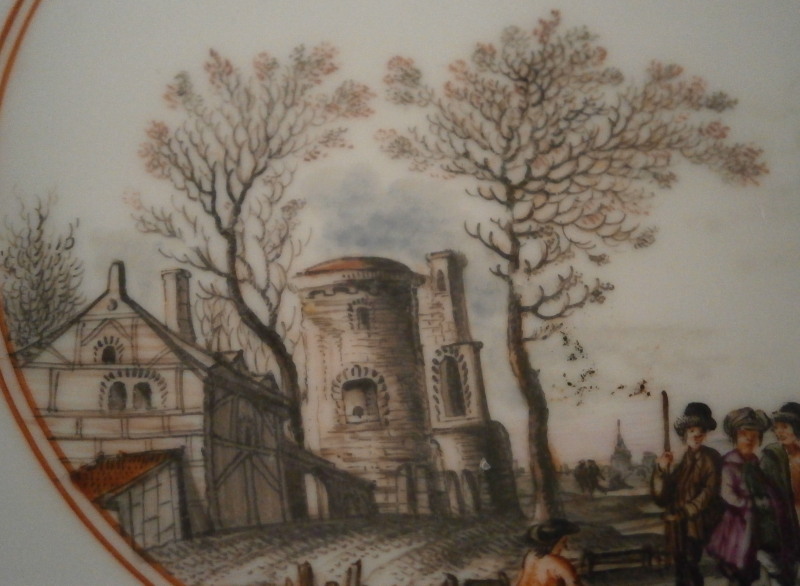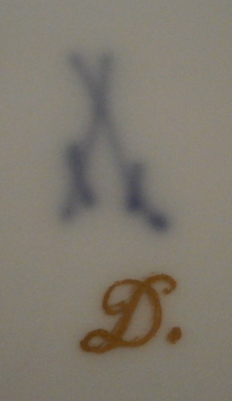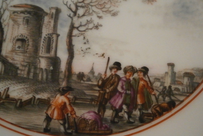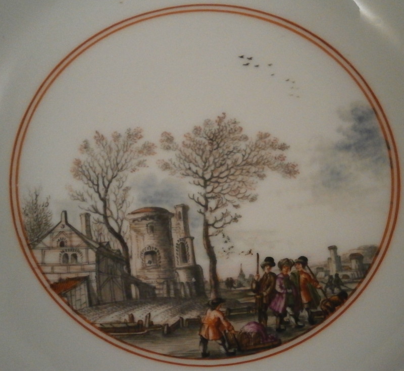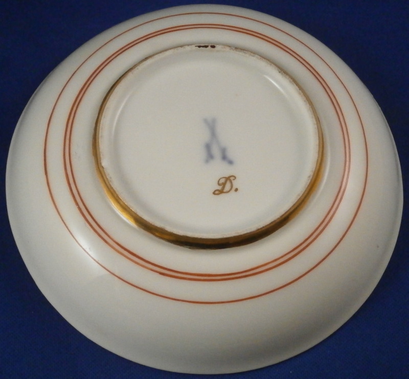 This is a really nice early saucer made by Meissen in about 1740. It is superbly hand painted with a superb scene scene in the center surrounded by a double red line trim and a gold trim to the edge. The scene is a bit unusual as is seems to be a winter or at least late fall scene with the colors of the trees and building muted while the figures are as colorful as they normally would be. Really a very nice look! Three red rings and a gold trim to the underside as well - a sure sign of quality and being an early piece. The scene appears to have been painted by Christian Friedrich Herold by what I can figure out. The saucer is in perfect condition with some very minor wear mainly to the gold trim on the edge. The white spot and weird dark stuff next to the tree trunk were dirt I just removed. Didn't realize it until I took the pictures that it was there. The piece is 0.875 inches tall and has a diameter of 4.625 inches. It is marked underneath with the underglaze blue crossed swords mark as well as a gold D and an impressed number. Please email me for more information or other pictures.
