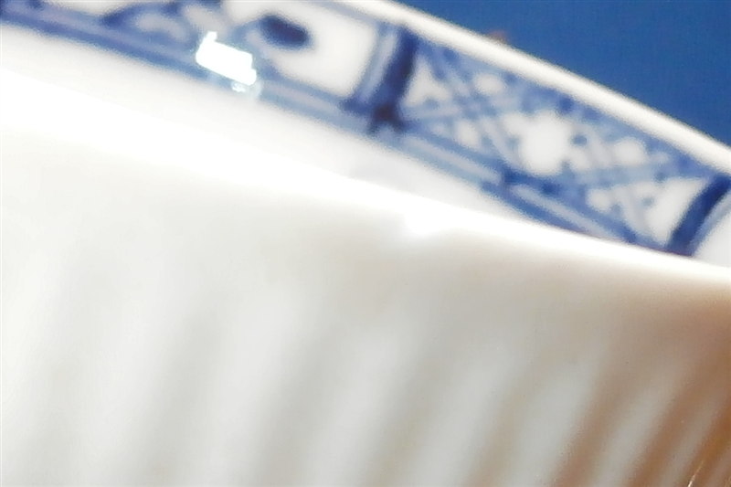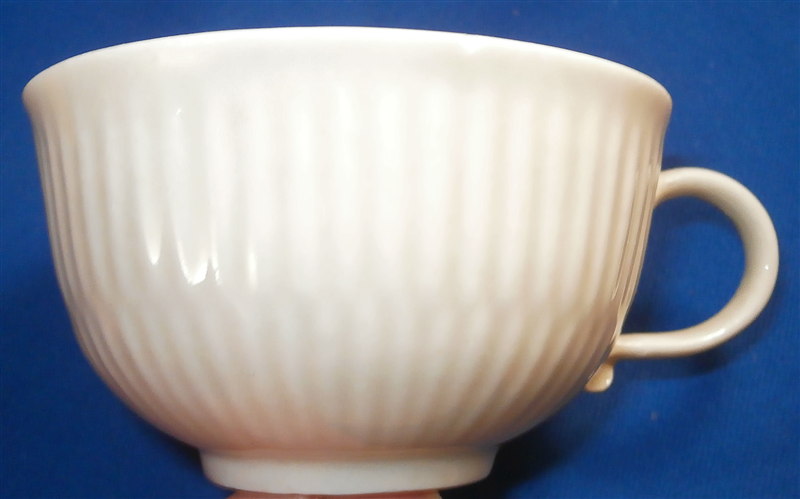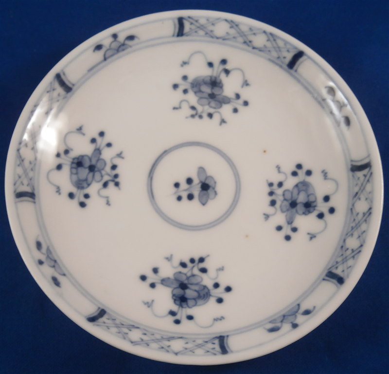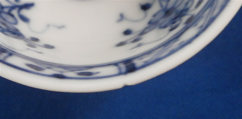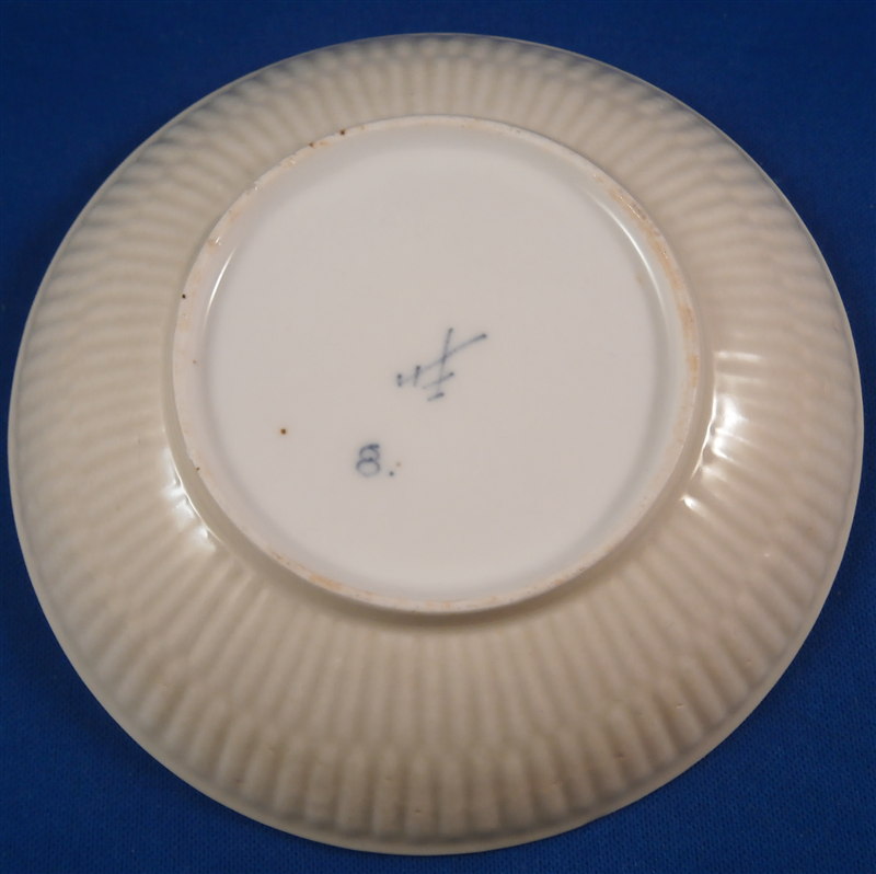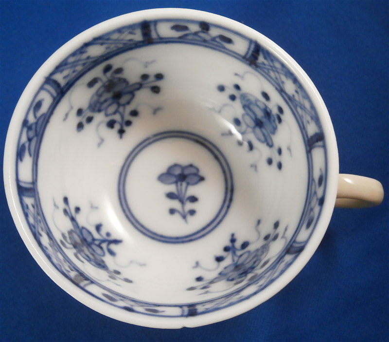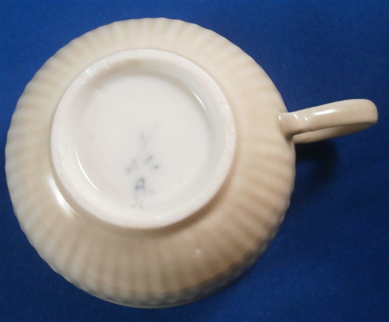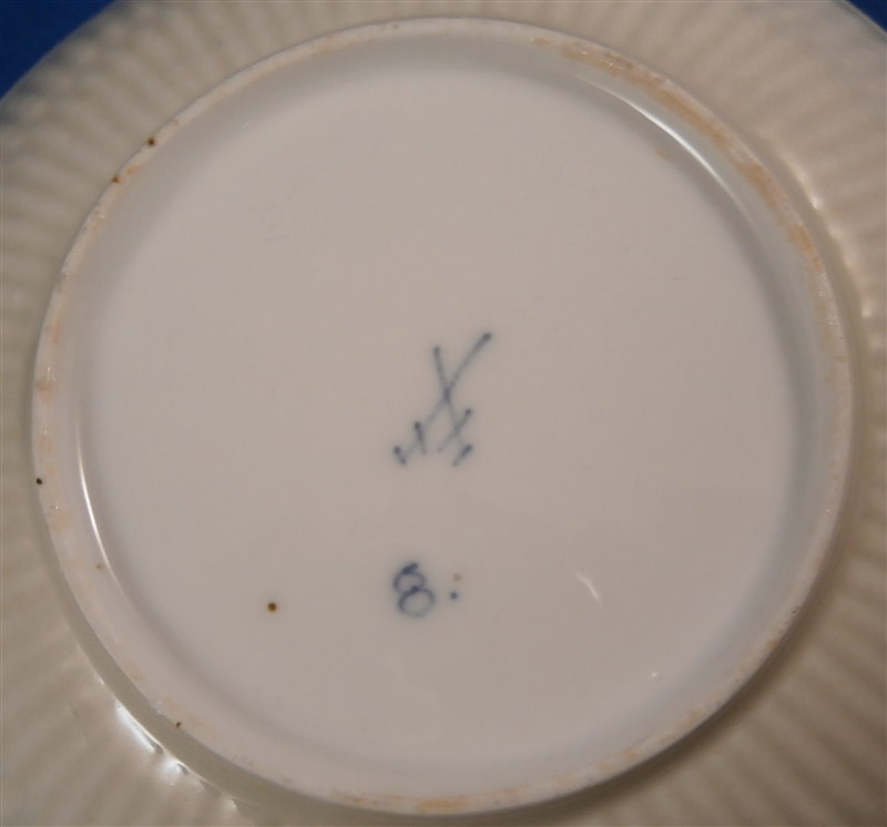 This is a great cup and saucer made by Meissen in about 1740 still after the Chinese design which later turned into the Strawflower design. The set is handpainted in underglaze blue with flowers and a nice rim design but my favorite part is that the outside has a ribbed relief design which is colored in the cafe-au-lait (milk coffee) hue. Amazingly the set is in great condition after all theese years with just a minor flea bite to the edge of the cup. The cup is 1.625 inches tall and 2.875 inches in diameter. The saucer is 0.875 inches tall and 4.75 inches in diameter. They are both marked with the underglaze blue crossed swords mark that are straight with the dot at the ends as well as a blue painter's mark and an impressed number. Please email me for more information or other pictures.