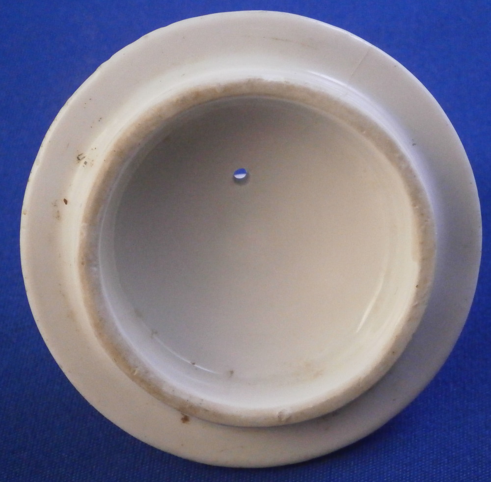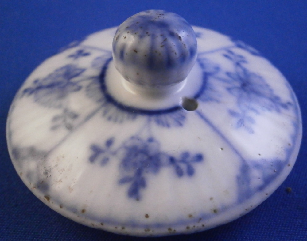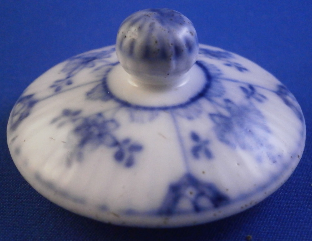 This is a early lid made by Meissen in about 1740 or jsut a touch earlier. It is hand painted with their famous under glaze blue Strawflower design. Nice looking piece that is in good condition with a few tiny black spots in the glaze common to their early wares and a hairline from that tiny vent hole on top to the edge. Hard to spot and stable. A ribbed relief design to the paste on top. The lid has a diameter of 2.125 inches and is about 0.75 inches tall not including the foot ring underneath. That has an outer diameter of 1.625 inches which needs to fit inside the pot you want to use it for. Unmarked but that is normal. I also have the pot that this belongs to but it's so damaged that it makes more sense to have this lid available for a pot that is missing its lid. Please email me for more information or other pictures.