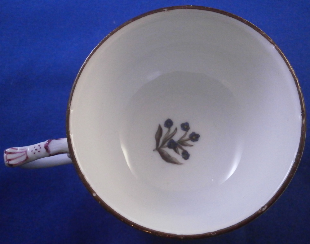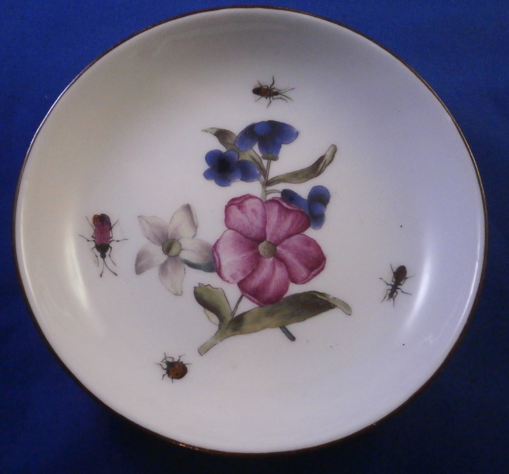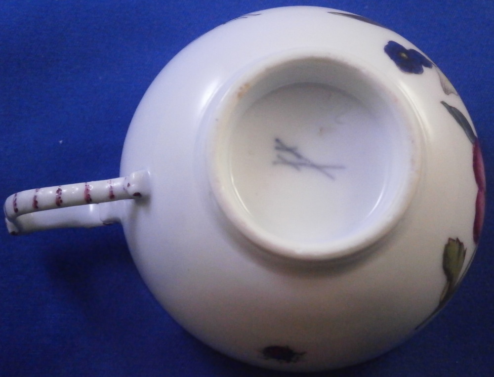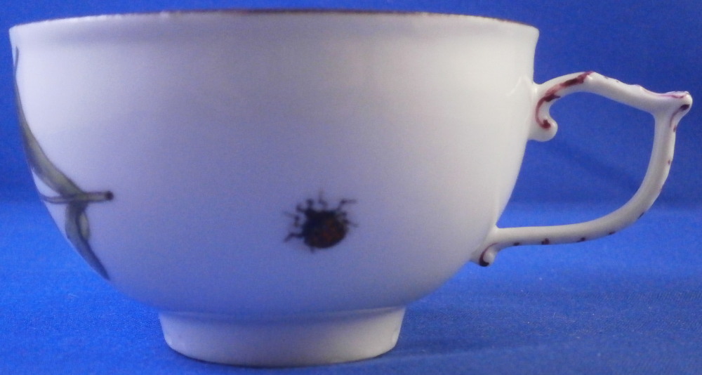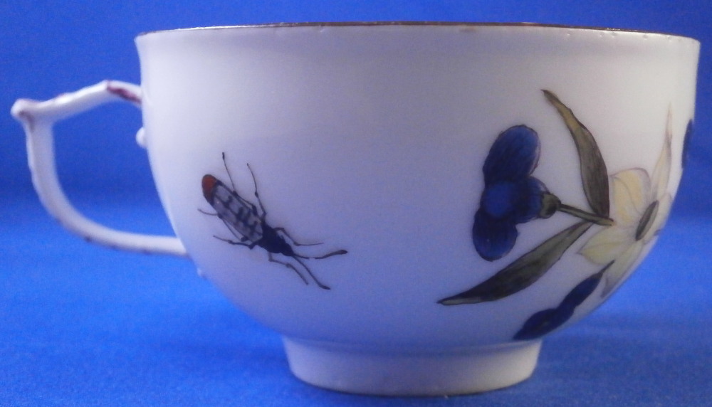 This is an early cup and saucer made by Meissen around 1740. Both are hand painted with flowers in the early and superb woodcut styleand the flowers even match perfectly which is pretty rare. The saucer has a large floral arrangement in the cetner with four bugs around them and a nice brown trim to the edge. The porcelain has a nice white color that only the early pieces have. The cup has them same floral arrangement to the front as well as two bugs, brown trim to the edge and a nicely shaped handle with some puce trim to it. A gorgeous looking set! A small flower on the inside bottom. The set is in superb condition with a few minor spots of wear to the brown trim of the cup and the saucer had two paint flakes to the blue flowers which were colored in to hide them well. One tiny and the other one larger. The cup is 1.75 inches tall and 2.75 inches in diameter. The saucer is 0.875 inches tall and 4.75 inches in diameter. They are both marked with the under glaze blue crossed swords mark that are straight from around 1740 and an impressed number. The swords on the saucer are quite faint but they are there. Please email me for more information or other pictures.