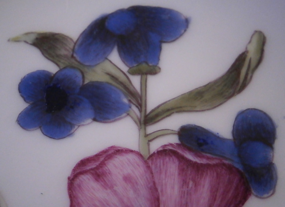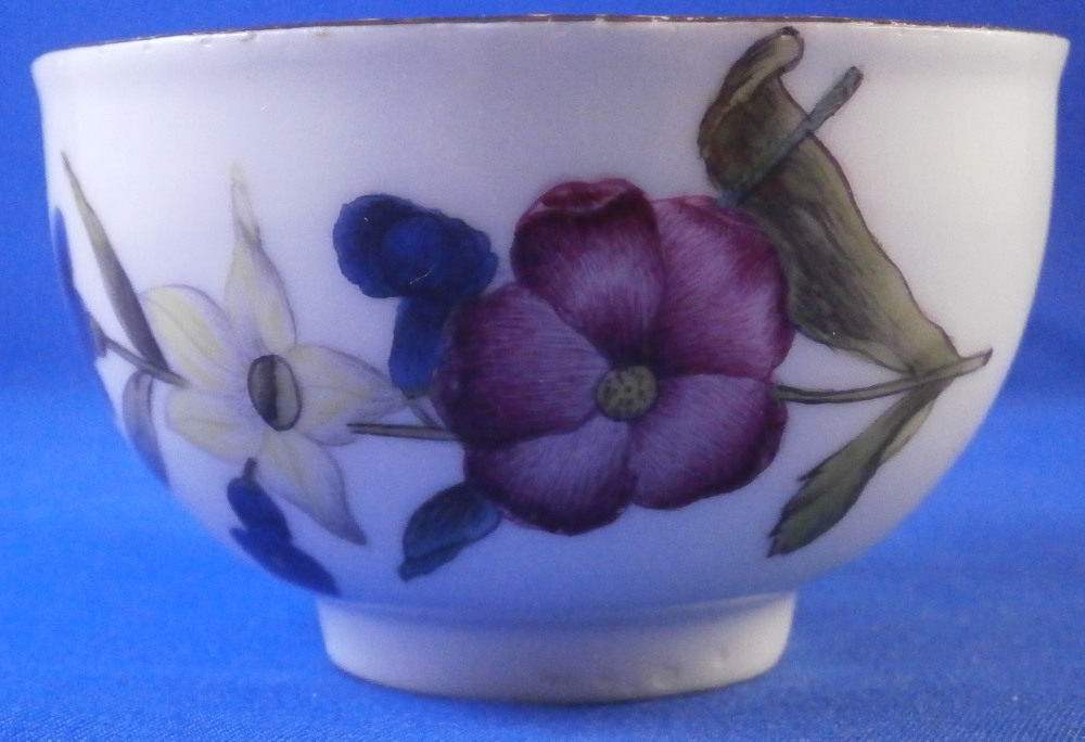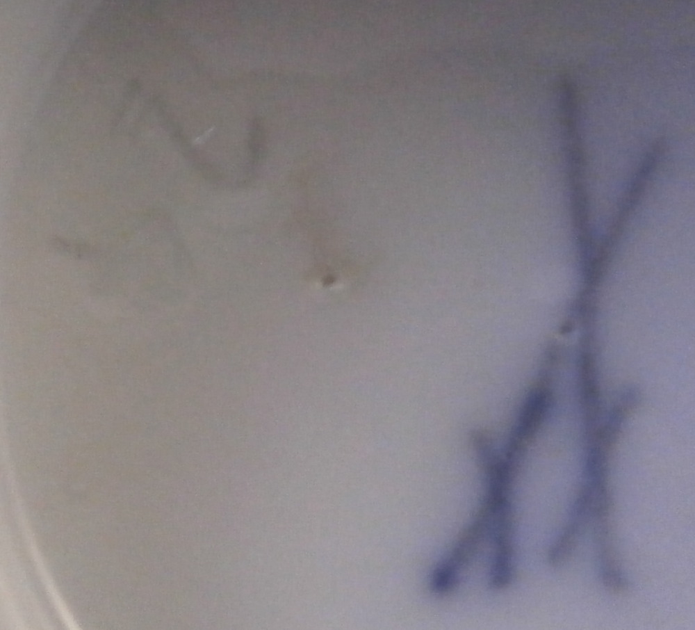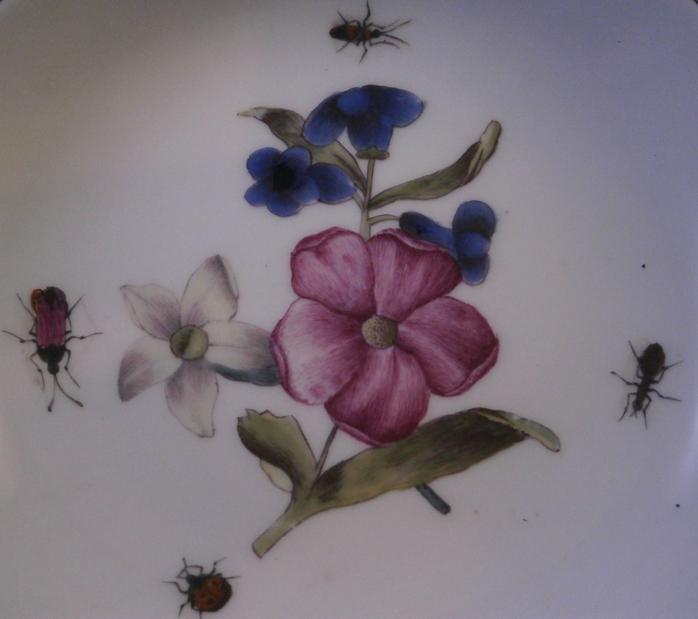 This is an early cup and saucer made by Meissen around 1740. Both are hand painted with flowers in the early and superb woodcut styleand the flowers even match perfectly which is pretty rare. The saucer has a large floral arrangement in the cetner with four bugs around them and a nice brown trim to the edge. The porcelain has a nice white color that only the early pieces have. The cup has them same floral arrangement to the front as well as two bugs, brown trim to the edge and a nicely shaped handle with some puce trim to it. A gorgeous looking set! A small flower on the inside bottom. The set is in superb condition with a few minor spots of wear to the brown trim of the cup and the saucer had two paint flakes to the blue flowers which were colored in to hide them well. One tiny and the other one larger. The cup is 1.75 inches tall and 2.75 inches in diameter. The saucer is 0.875 inches tall and 4.75 inches in diameter. They are both marked with the under glaze blue crossed swords mark that are straight from around 1740 and an impressed number. The swords on the saucer are quite faint but they are there. Please email me for more information or other pictures.