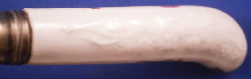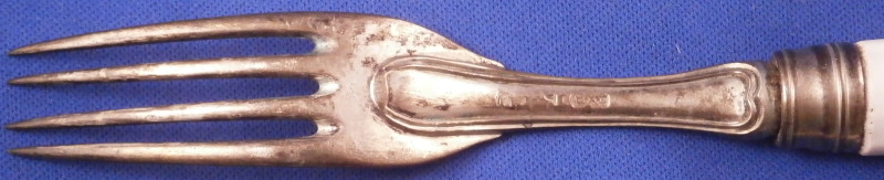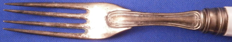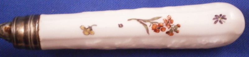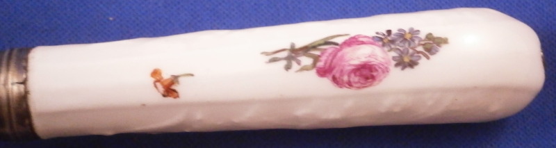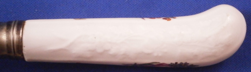 This is a rare fork made by Meissen in 1739. I thought they were from the 40's but my buddy told me the crossed swords silver mark dates them to 1739 which is neat. It matches some other cutlery pieces I have on my site. The handle is nicely modeled with a floral Gotzkowski relief pattern on the sides with hand painted flowers on the top and bottom of the handle in the wood cut style of this period. The ferrule between the handle and the blade has a nice ring design to it and it as well as the fork itself is made of silver. The silver is nicely marked with a set of silver hallmarks including a crossed swords mark which I have not seen before. The metal part goes into the handle and there is a spot coming out on the other end to fasten it in place which was only done on early pieces! The fork is in superb condition with the metal turning a bit in the porcelain if you try but it is just a touch. The fork is 7.5 inches long of which 3.125 are the porcelain handle. The handle is about 0.75 inches wide. The porcelain is not marked which is normal but is definitely made by Meissen.