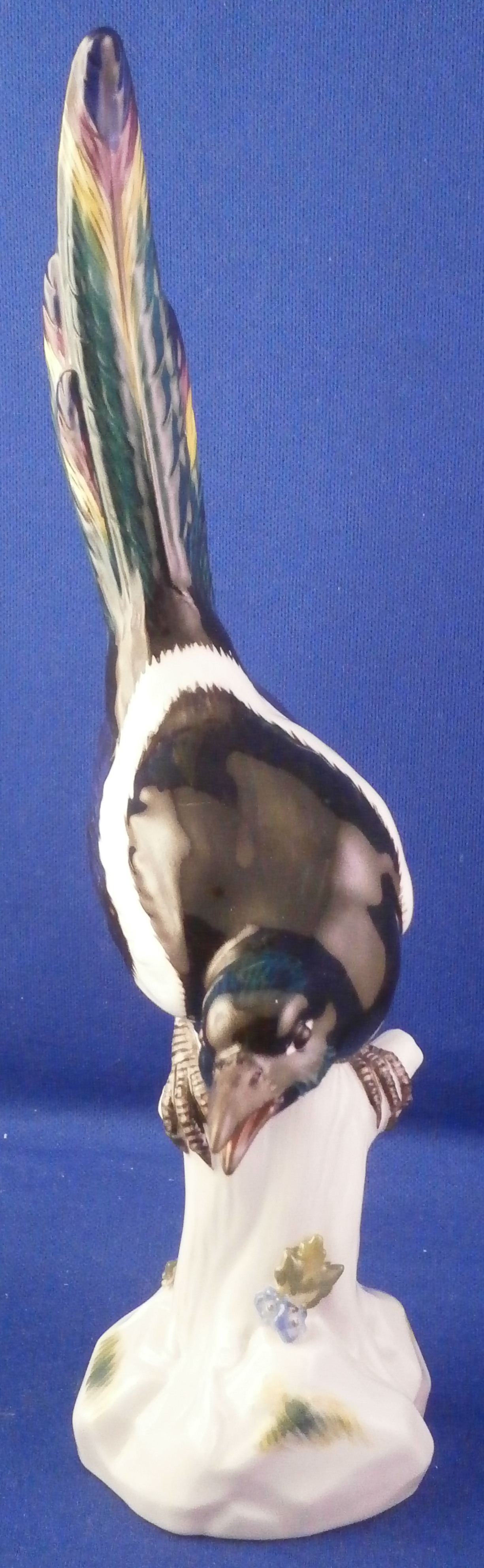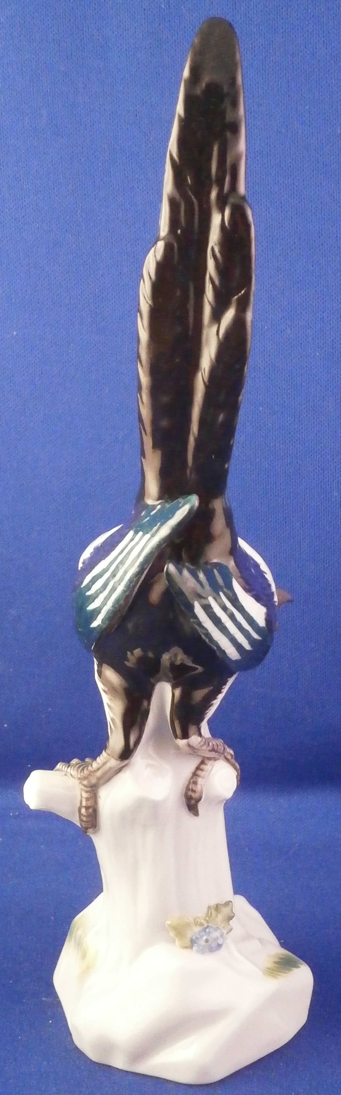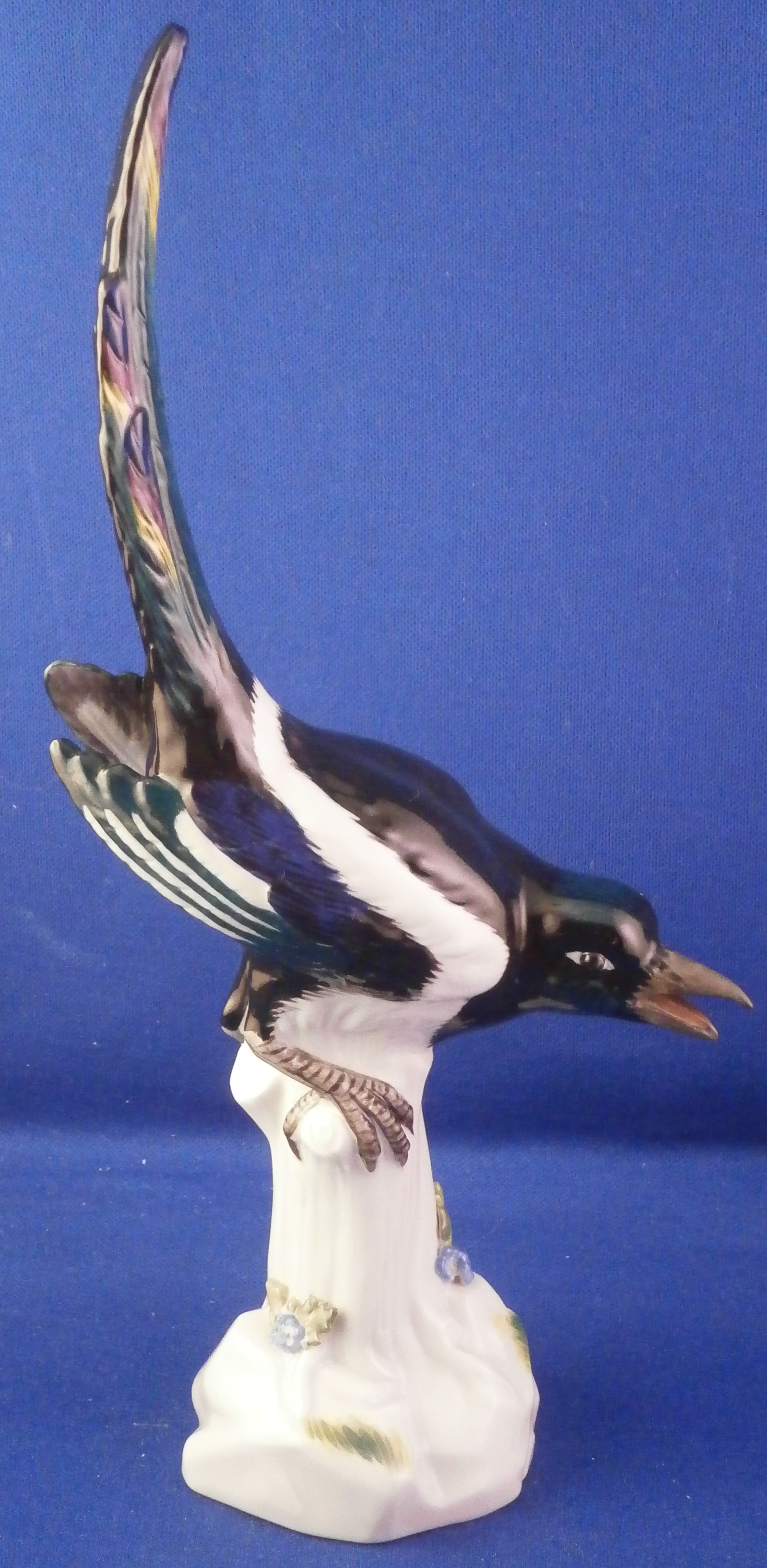This is a great bird figurine made by Meissen in the 20th century. It is a magpie bird . The figure is very well modeled with its colorful tail up in the air while sitting on a tree stump with some grasses painted on it and a flower to the front. Superbly hand painted with lots of detail! A very fragile piece and one sees them damaged at the beak or tail almost all the time so it is nice to see one without issues. The figurine is in superb condition. It is marked underneath with the under glaze blue crossed swords mark (first choice) as well as the usual impressed numbers and a blue painter's mark 23 as shown. The piece is 7.875 inches tall, 2 inches wide and 3.5 inches deep. Please email me for more information or other pictures.