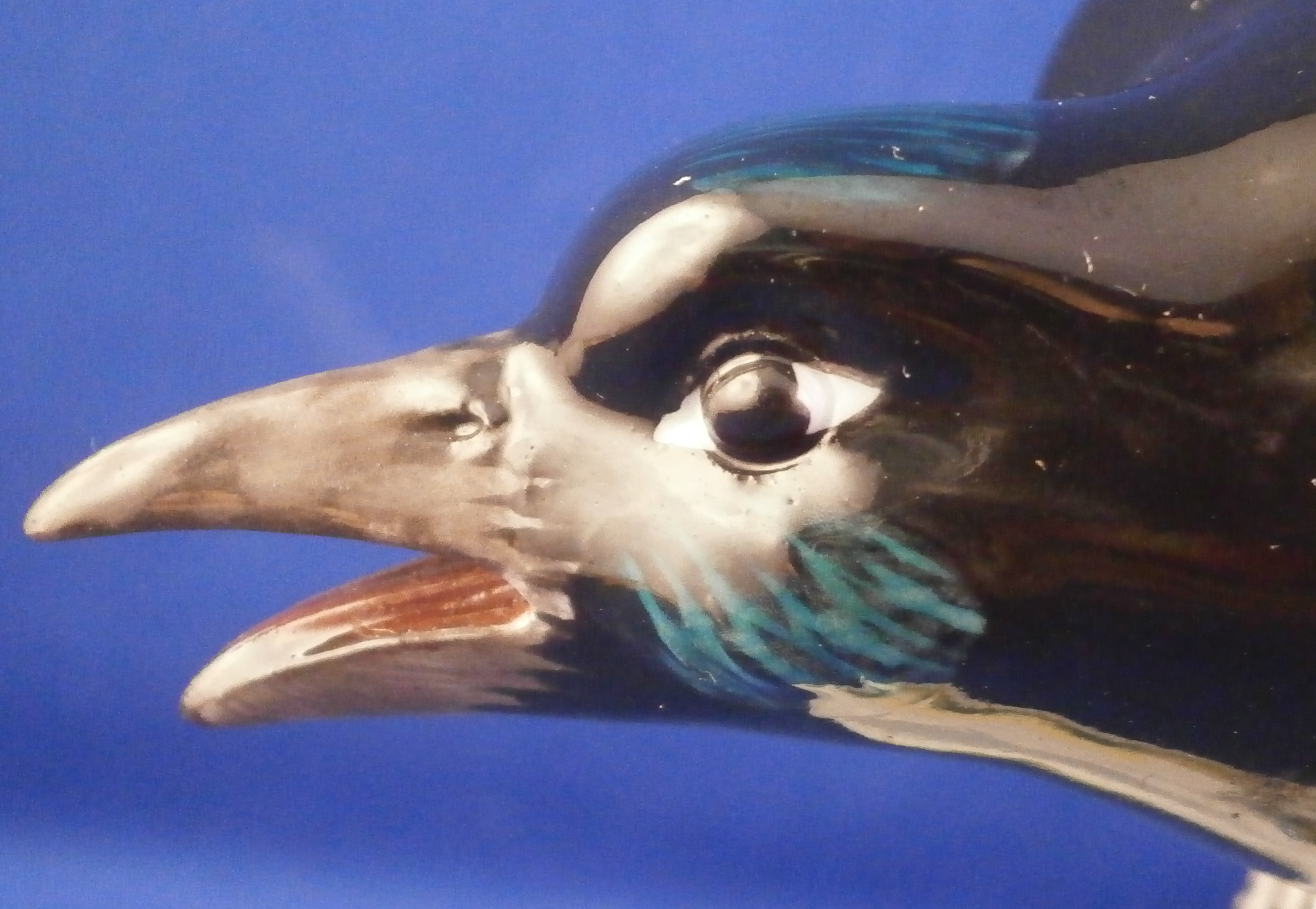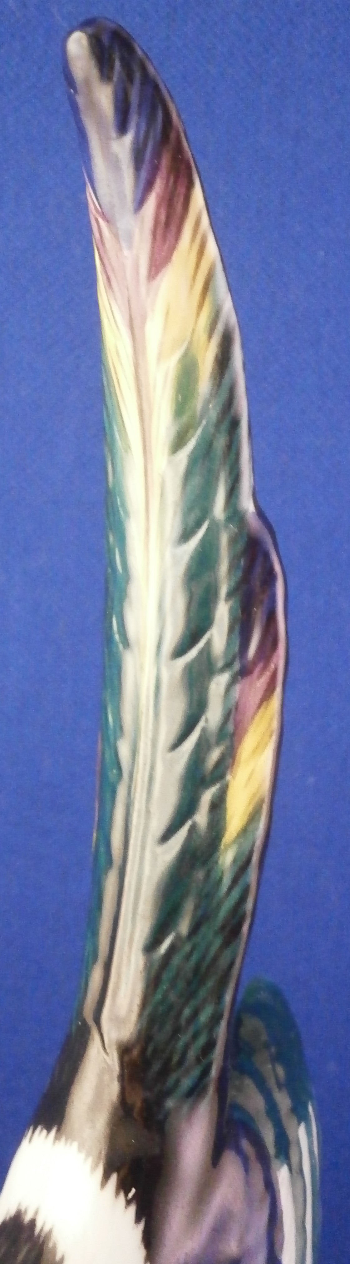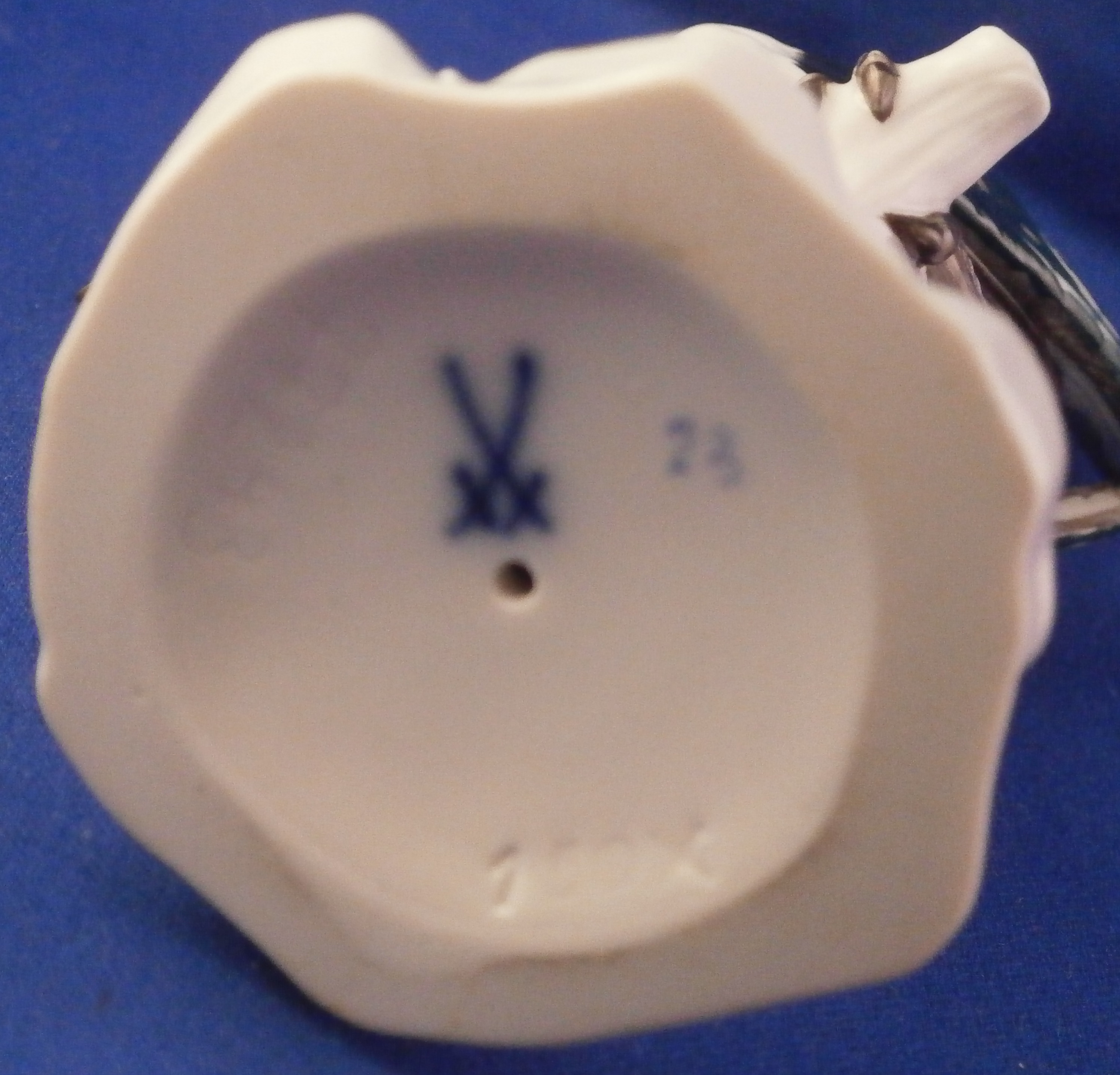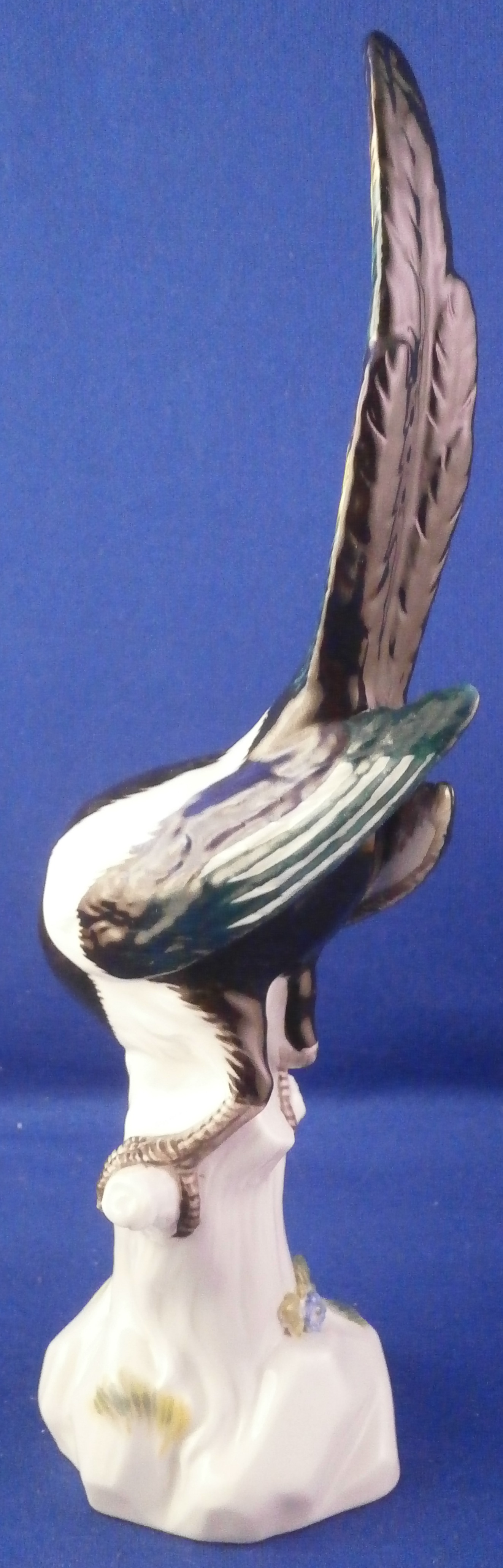 This is a great bird figurine made by Meissen in the 20th century. It is a magpie bird . The figure is very well modeled with its colorful tail up in the air while sitting on a tree stump with some grasses painted on it and a flower to the front. Superbly hand painted with lots of detail! A very fragile piece and one sees them damaged at the beak or tail almost all the time so it is nice to see one without issues. The figurine is in superb condition. It is marked underneath with the under glaze blue crossed swords mark (first choice) as well as the usual impressed numbers and a blue painter's mark 23 as shown. The piece is 7.875 inches tall, 2 inches wide and 3.5 inches deep. Please email me for more information or other pictures.