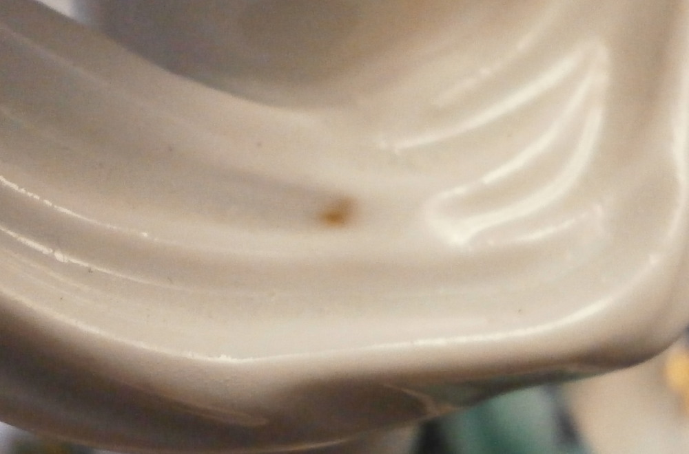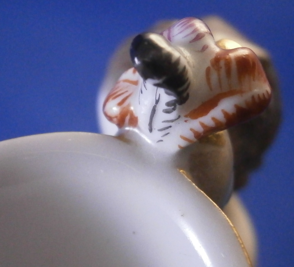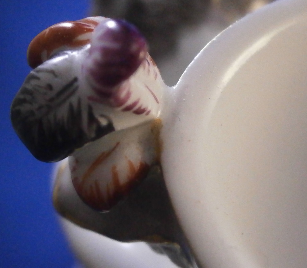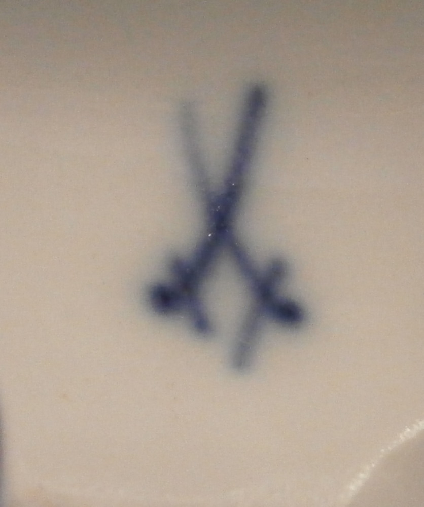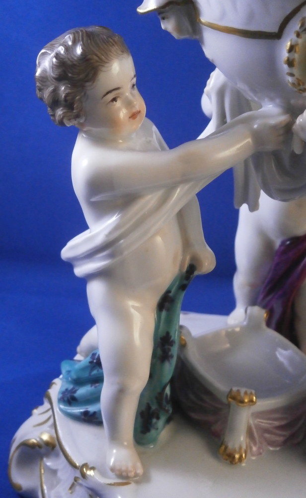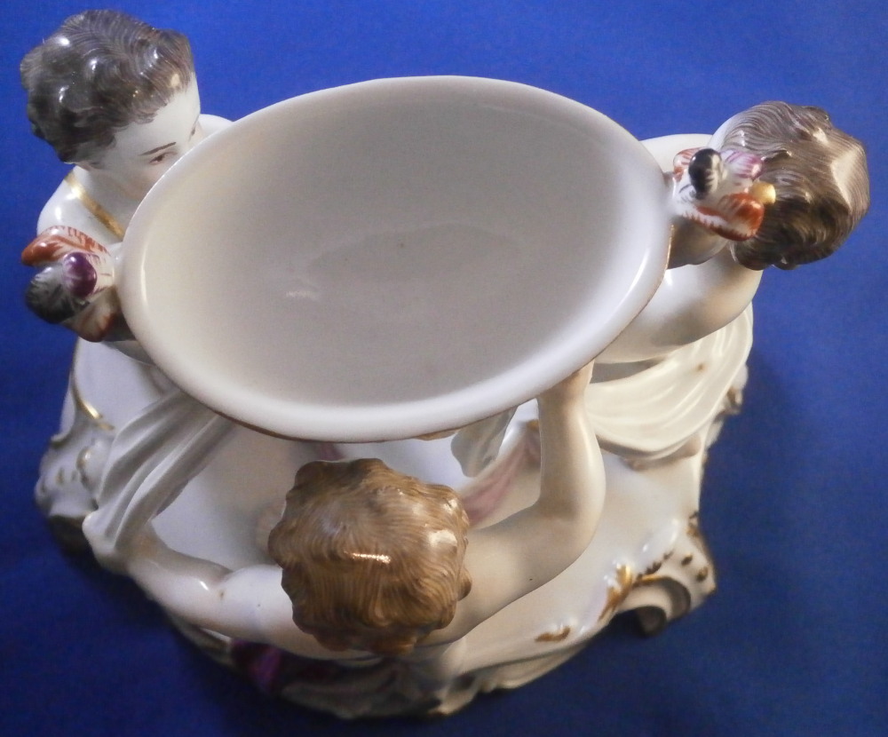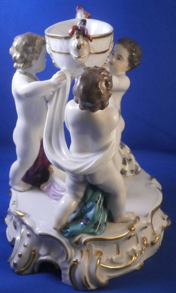 This is an unsual figurine made by Meissen in the late 19th to early 20th century. I think it was meant to be an essential oil diffuser with the bowl in the center of the base meant to hold a candle and the oval bowl up top holding the oil. Not a model I ahve ever come across before so I am not entirely sure. Either way it is a nicely modeled figure of three putti standing on a fancy base holding up the bowl in the center. The bowl has figural heads as handles. These are wearing little helmets with three feathers on top. Each putto has a different color cloth between their legsand they are holding a white cloth in their hands that goes from one putto to the next. The base has some superb scrolls all around the edge with gold highlights to them. A really nice figurine and I might even try to use it one of these days after my kids cook some smelly food :) The piece is 6.375 inches tall, 6 inches wide and 5 inches deep. It is in perfect condition but there are two or three small black firing spots - one in the white cloth and one on the one putto's arm I found and there is probably another one hiding somewhere. Normal to larger pieces of this period and does not take away from the piece! The figurine is marked underneath with the under glaze blue crossed swords mark (first choice) as shown as well as the usual impressed and incised marks as shown. Please email me for more information or other pictures.