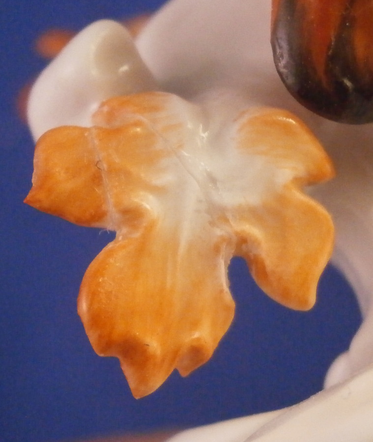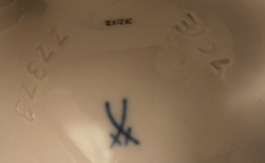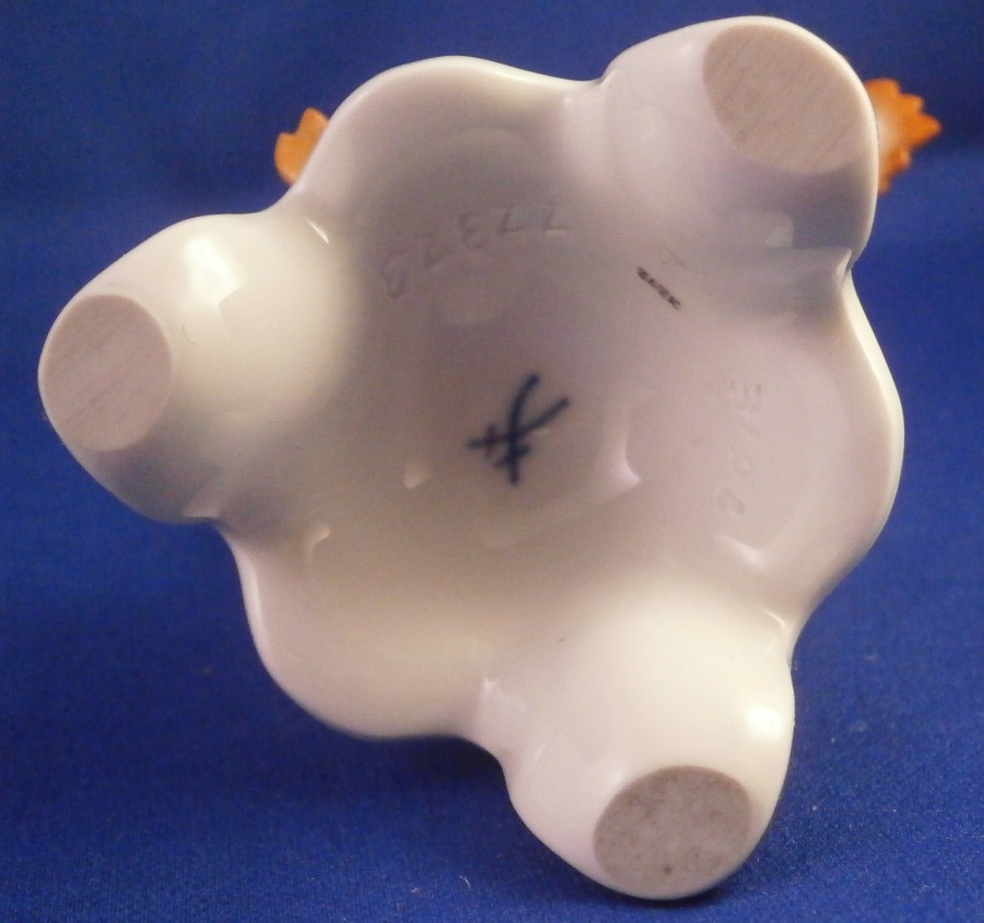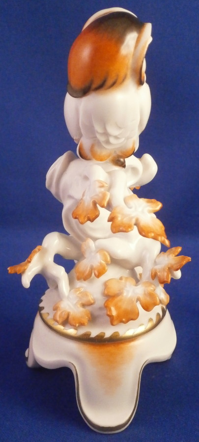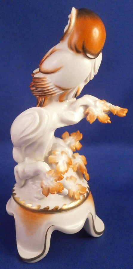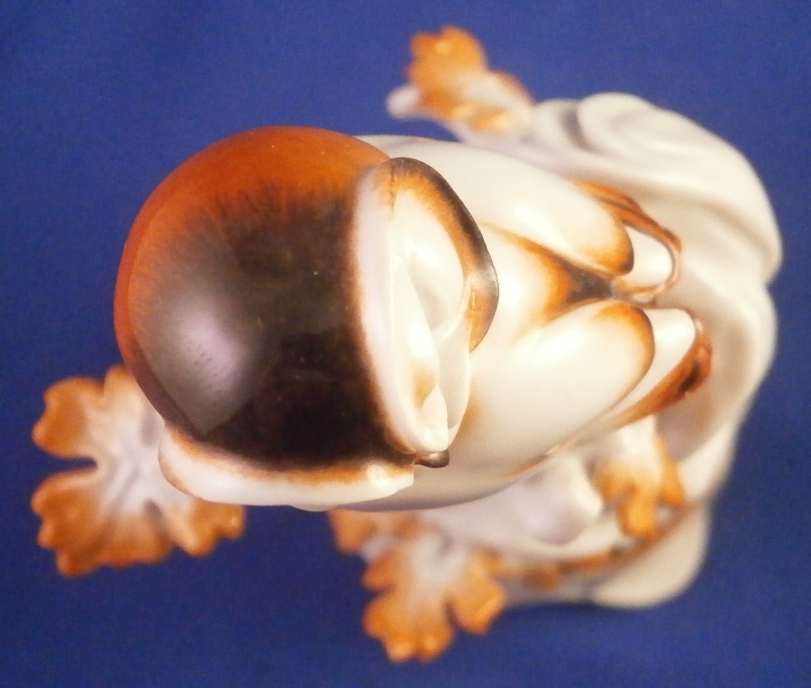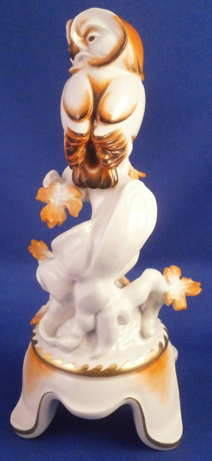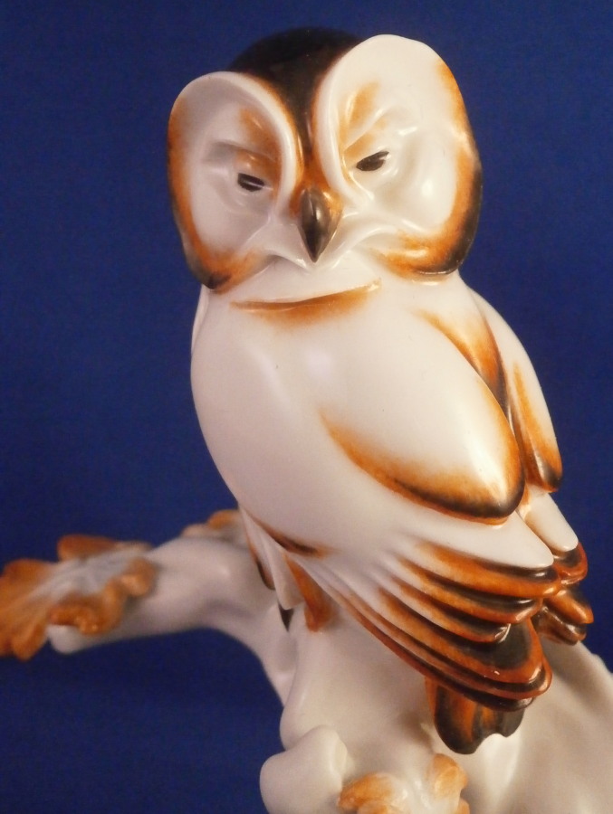 This is a really fun figurine of an owl sitting on a gnarly old tree made by Meissen in the 20th century . The style and coloration means it has to be a rare design by the famous Max Esser who made so many really cool animal models for Meissen. I could not find this exact model but it fits his style. Either way the figure is superbly modeled with lots of detail and has that typical rust colorations hand painted on it with gold details to the base and black eyes. A truly amazing piece and the perfect size not to take up too much room. The figurine displays perfectly but one of the leaves has been reglued as shown. Not obvious at all unless you really look very closely at it. The figurine is 5.125 inches tall, 2.5 inches wide and 2.25 inches deep. The figure is marked with the under glaze blue crossed swords as well as the usual impressed numbers and letters as well as some black numbers as shown. Please email me for more information or other pictures.