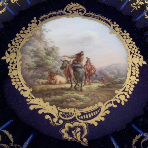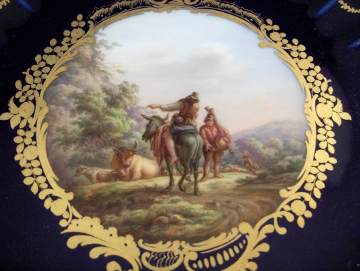 This is a superb plate made by Meissen in the late 19th century. It is handpainted with a detailed scene in the center of a rider on a horse talking to a man holding a set of bagpipes with a shepherd attending to his flock in the background and two cows to the side. Lots of detailed greenery all around. The rest of the well has that superb deep cobalt blue we all love, there is some superb gilding around the scene and at the edge of the well with an amazing reticulated trim highlighted with gilding and blue flowers finishing off a perfect piece! This is one of the best plates one can own from this period! It even has some fancy gilding underneath as shown in the pictures which Meissen only did on their best pieces. The plate is in perfect condition. The plate is marked with the underglaze blue crossed swords mark underneath as well as the usual impressed numbers and letters one finds on Meissen of this period. It is 1.25 inches tall and 9.875 inches in diameter. Please email me for more information or other pictures.