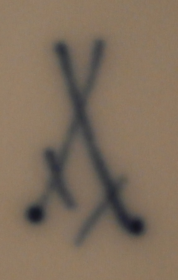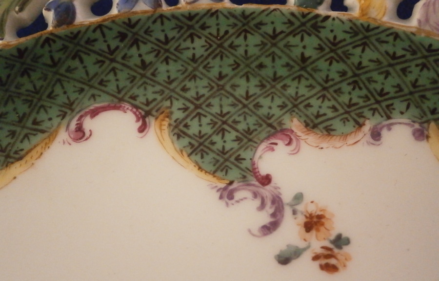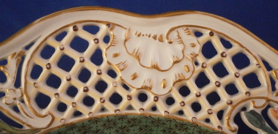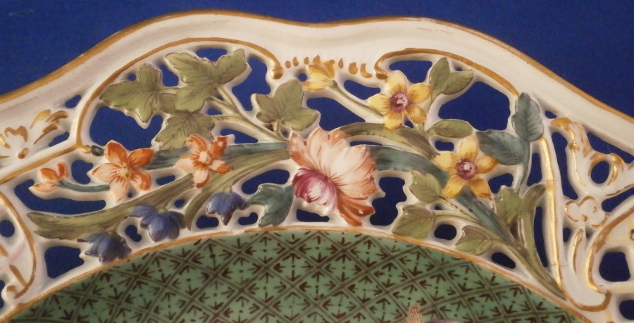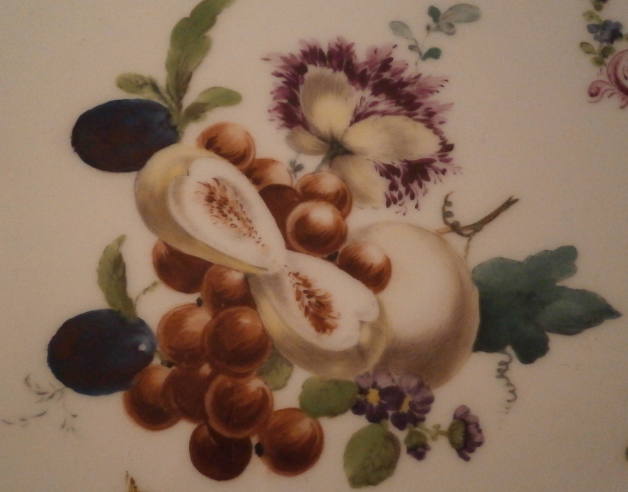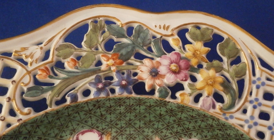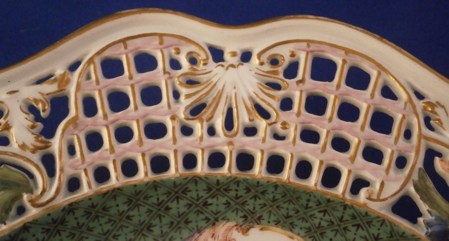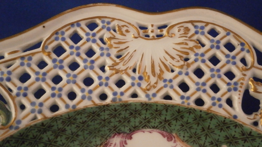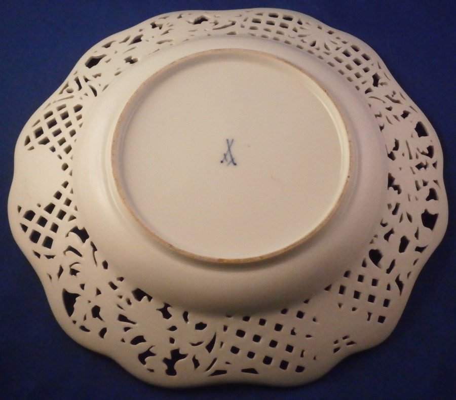 The plate is a fancy plate made by Meissen in the early to mid 19th century. It has a rim design called Brühlsches Allerei as well as a hand painted fruit arrangement in the center which is much rarer than the flower ones one usually finds on these types of plates. My favorite part however is that super fancy trim around the well edge including the green ground with the black design with colorful scrolls around the edge and a couple of little single flowers as well. Off course it has the very fancy reticulated rim with lots of flowers and gold highlights which gives it its name. A bit more fancy than the usual kind. Each reticulated area is different with three that arehighlighted with different colros and designs with a gold design in the center and three more that are in the shape of a floral arrangement with each flower hand painted perfectly! The Bruehlsches Allerlei design is one of the nicest rim designs one can own by Meissen - it was originally made for Count von Bruehl . The edge has a gold trim to it. The plate is in superb condition with just a minor touch of wear. It is marked with the under glaze blue crossed swords mark as well as the usual impressed / incised numbers one find on Meissen of this period as shown. The plate is 1.5 inches tall and 9.625 inches in diameter which is a very nice size.