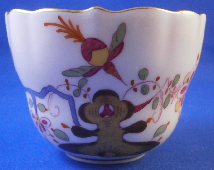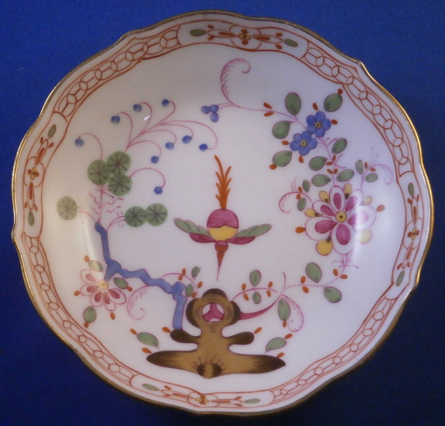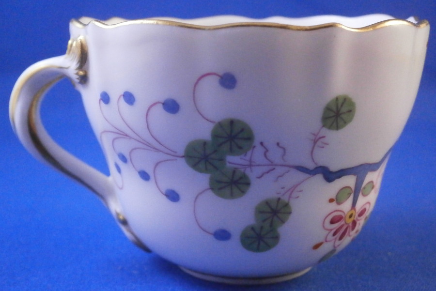 This is a demitasse sized cup and saucer made by Meissen in in the late 19th century. Both pieces are hand painted with the polychrome Fels & Vogel design which looks stunning. It includes the rock in the bottom center with colorful branches of flowers coming out of it and the funky bird in the center. Nice red and green trim along the rim and gold trim to the edge and branch shaped handle. The design of the shape of the pieces is called Neuer Ausschnitt. The set is in perfect condition. The saucer is 1 inch tall and has a diameter of 4.25 inches. The cup is 1.875 inches tall and has a diameter of 2.5 inches. Both pieces are marked underneath with the under glaze blue crossed swords as well as the usual impressed numbers common to Meissen pieces of this period as shown. Please email me for more information or other pictures.