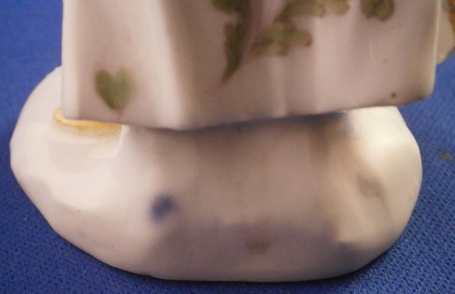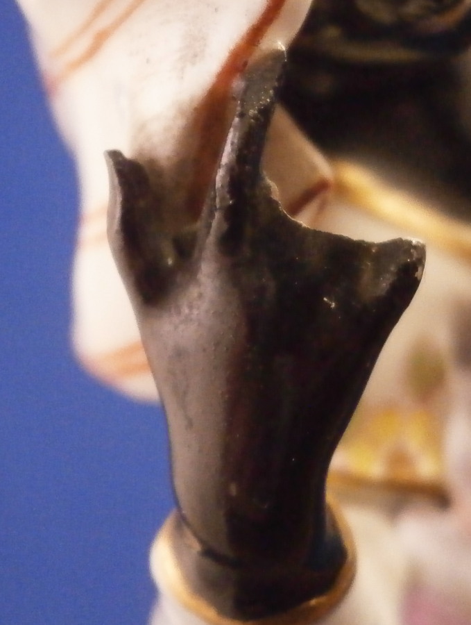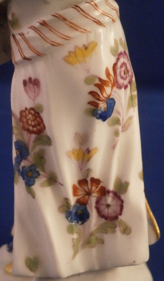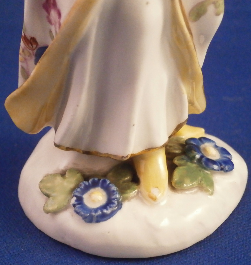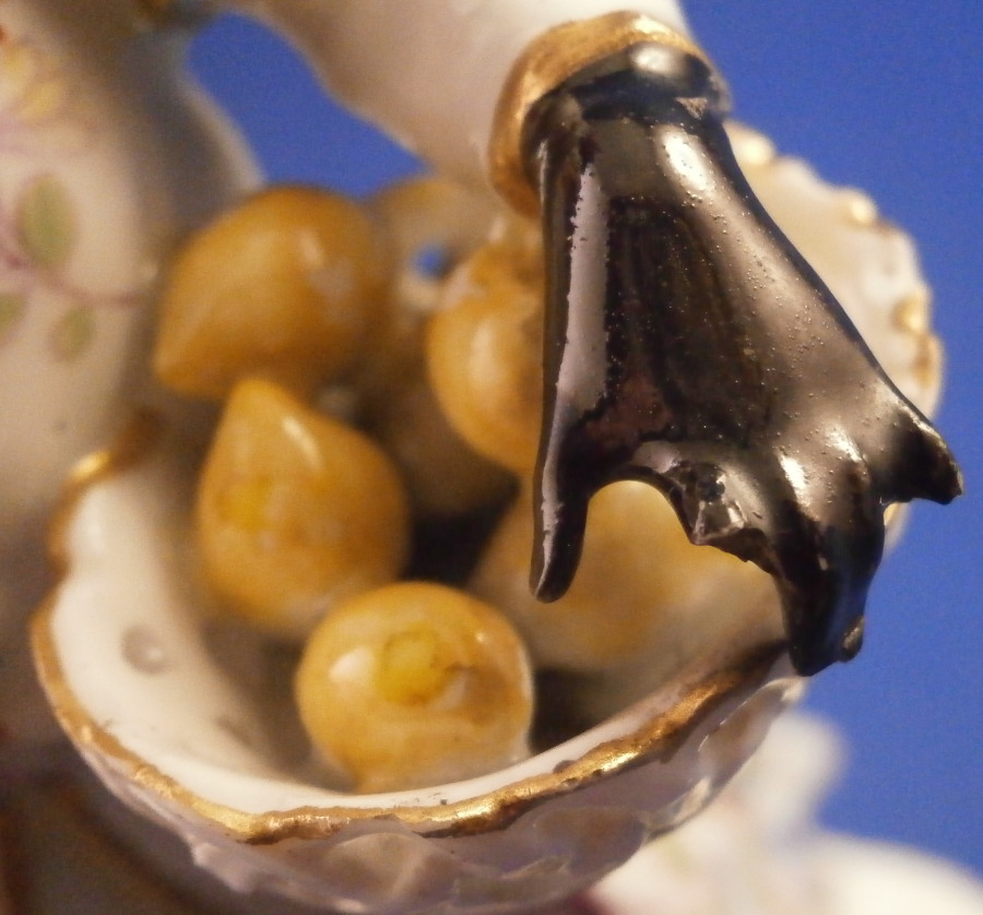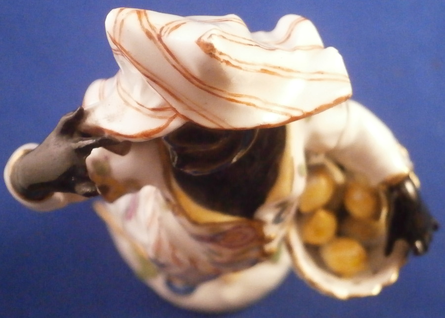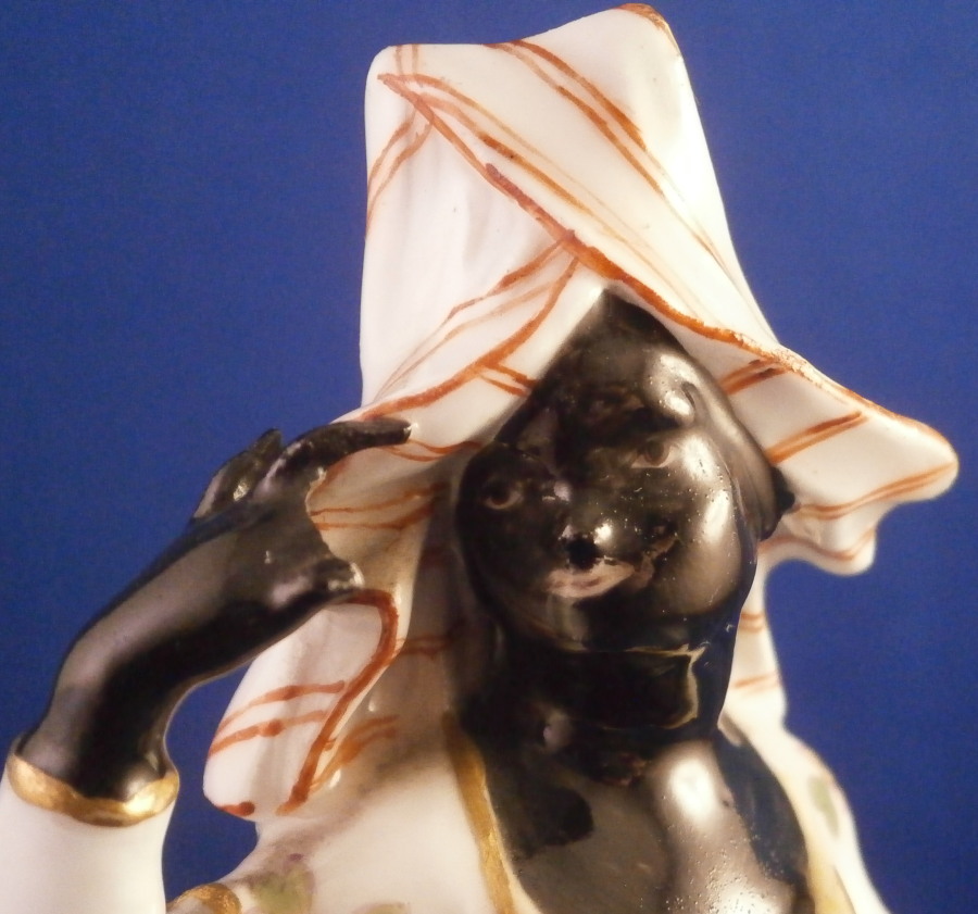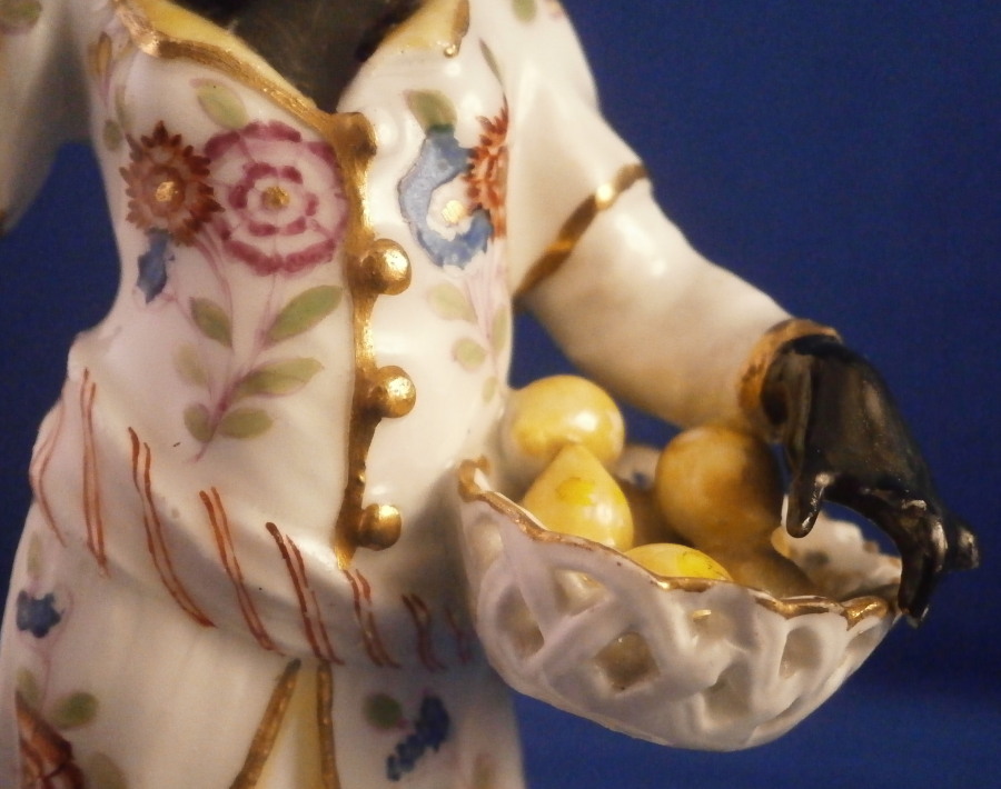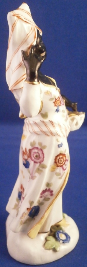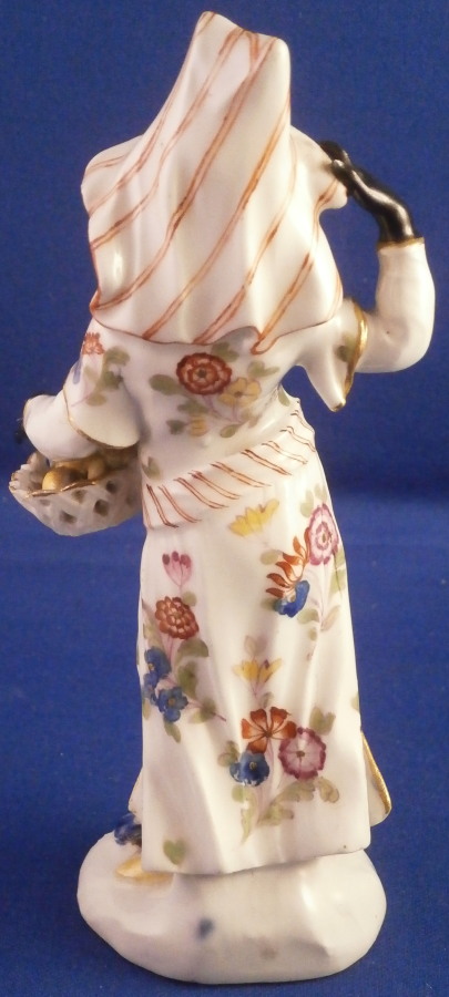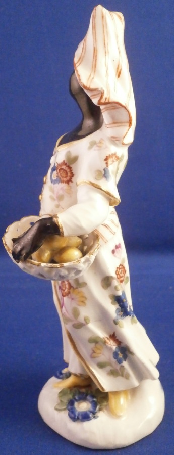 This is a rare and amazing figurine of a lady Blackamoor made by Meissen in about 1745. Modeled by Peter Reinicke this is a new favorite of mine. The piece is superbly modeled and hand painted in thos really nice early colors. It is about as early a figurine that one can find made by them that is still affordable. The lady is wearing a Turkish dress with a white and red striped headdress. She is holding an oval reticulated basket filled with lemons at her waist, her right hand removing some of the headdress from her face and standing on a nice base with two flowers and their leaves on it. This figurine has lots going for it. It was painted when it was made (very important!) and not later. It has superb colors and a nice design with those awesome flowers to her dress. She displays very nicely but has three fingers chipped on her top hand, two on the hand on the basket, a chip to the basket edge and some flaking to the yellow paint on the lemons and a spot on one of her shoes. None of this is obvious and she looks great! And to make it even better I also have her male friend to make a perfect couple :) The figurine is 5.5 inches tall, 2.25 inches wide and 1.875 inches deep. There are remnants of the blue crossed swords mark to the back base but one cannot mistake these early pieces. They are amazing to say the least! Please email me for more information or other pictures.
