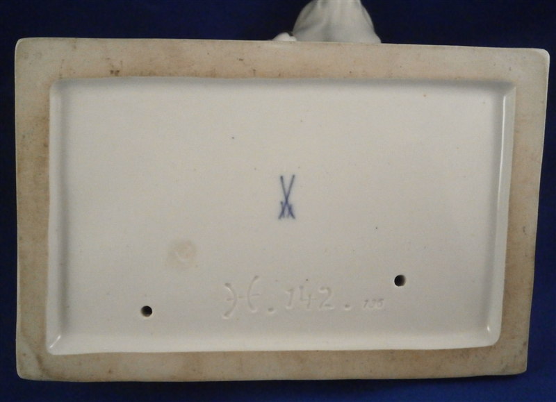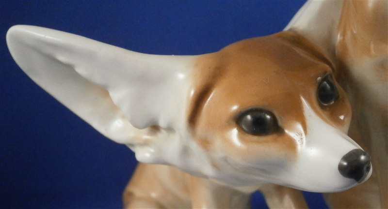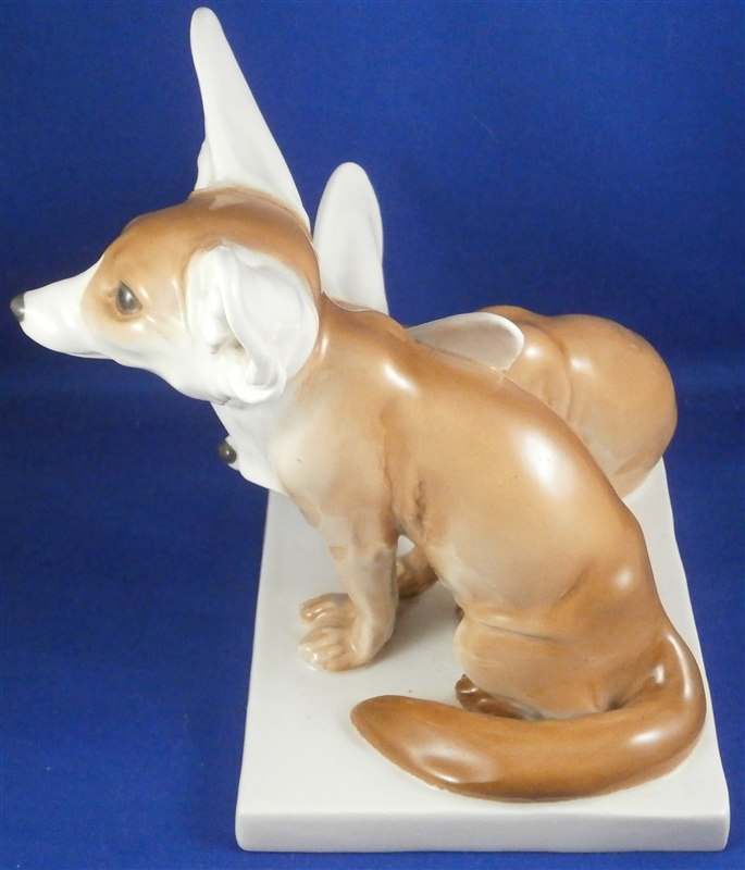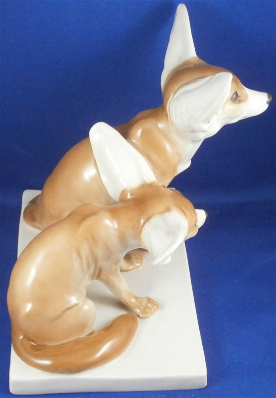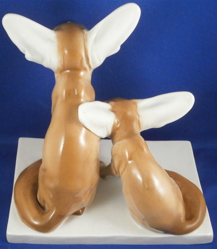 This is a figure two Fennec Foxes made by Meissen in the early 20th century. The figure was first designed by Otto Pilz around 1907 and is of two fennecs hand painted in under glaze colors sitting on a rectangular base. Fennec foxes have to be the cutest animals in the porcelain world and this pair is just stunning. A superbly modeled and painted piece - it doesn't come any better than this. The figurine is in perfect condition and first quality which isn't that common on this model. It is marked underneath with the under glaze blue crossed swords mark as well as the model number H142 and an impressed number 136. The piece is 6.25 inches tall, 6.5 inches wide and 4.25 inches deep. Please email me for more information or other pictures.