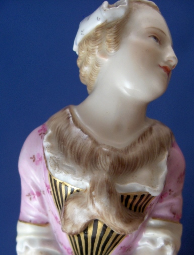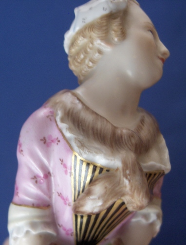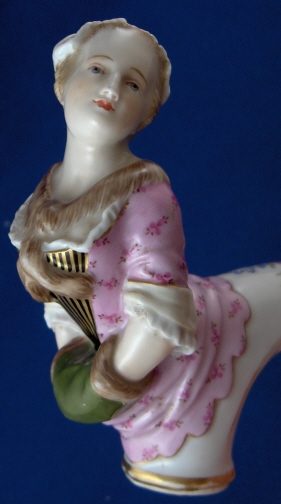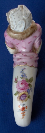 This is a rare cane handle made by Meissen in the 19th century. It is of a lady's head with the body making the shape of the handle. The body has her two arms in front in a muff and she is wearing a fur scarf. Nice pink dress and abonnet on her head. Lot of nice modeled detail and the usual quality of handpainted detail one expects from Meissen but finds nowhere else. The handle part has a nice gold trim and some scattered flowers on it with a large floral arrangement on top. The piece is in great condition with a tiny chip to her left sleeve, a little wear to the gilding and a shallow chip to the top edge of her white shirt by her right bussom which is not very obvious and would be an easy fix if needed! The piece is 3.75 inches tall, 4.25 inches long and 1.5 inches wide. It is marked underneath and on the inside with the blue crossed swords mark, an impressed nubmer and red painters mark. The inside hole diameter is 0.625 inches. Please email me for more information or other pictures.