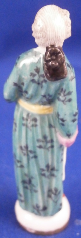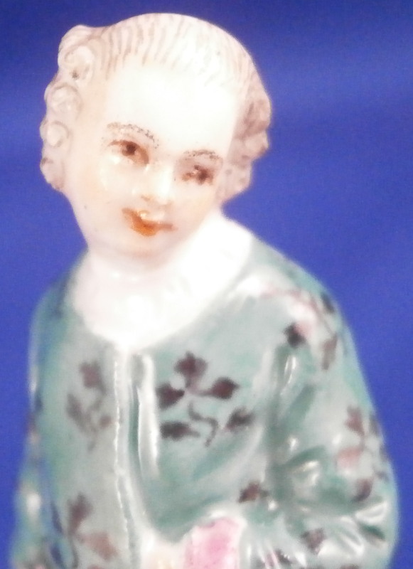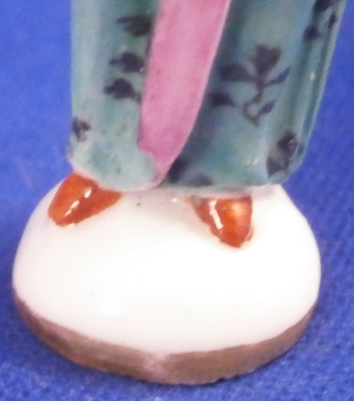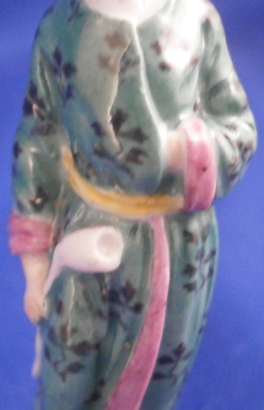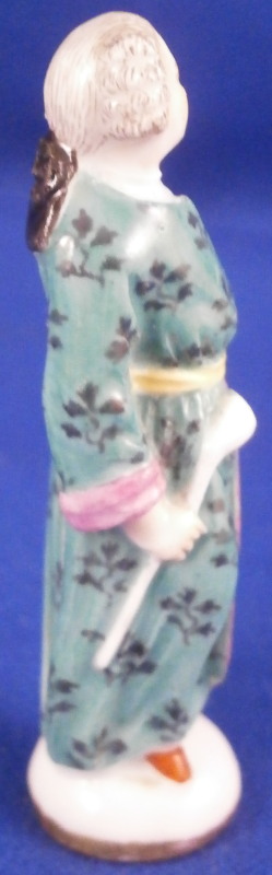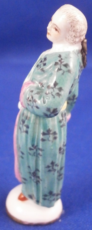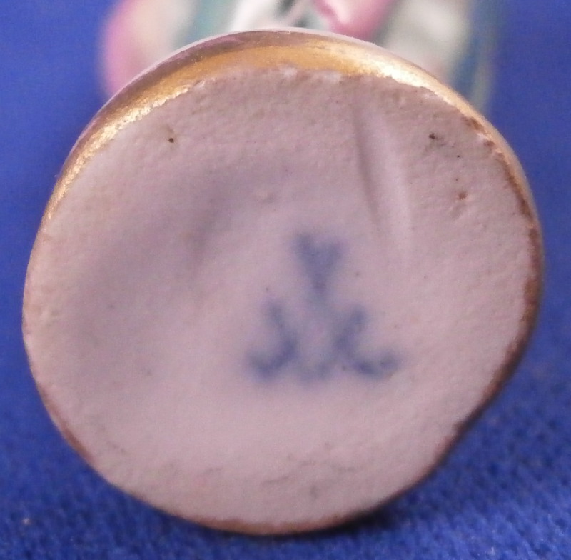 This is a fun piece - a figural pipe stuffer / tamper in the form of a miniature gentleman figurine wearing his evening smloking outfit made by Meissen in the 19th century. Nicely modeled and hand painted as one would expect from the top maker! The gentleman is dressed nicely in a long green robe / gown with red shoes while holding one of those old clay pipes in his right hand. This piece is standing on a smaller base than a usual miniature would stand on so it could fit into the pipe to pack down / compact the tobacco before smoking it. A known model of a pipe tamper. The piece is in perfect condition which is always nice. It is marked underneath with the blue crossed swords mark as shown. The figure is 2.25 inches tall with the base having a diameter of 0.625 inches. Please email me for more information or other pictures.