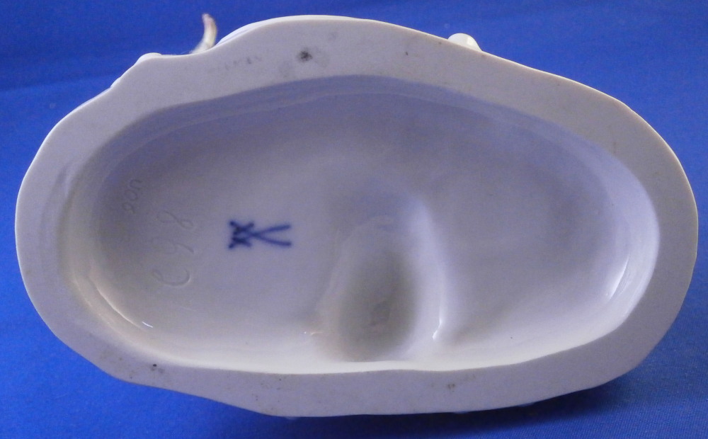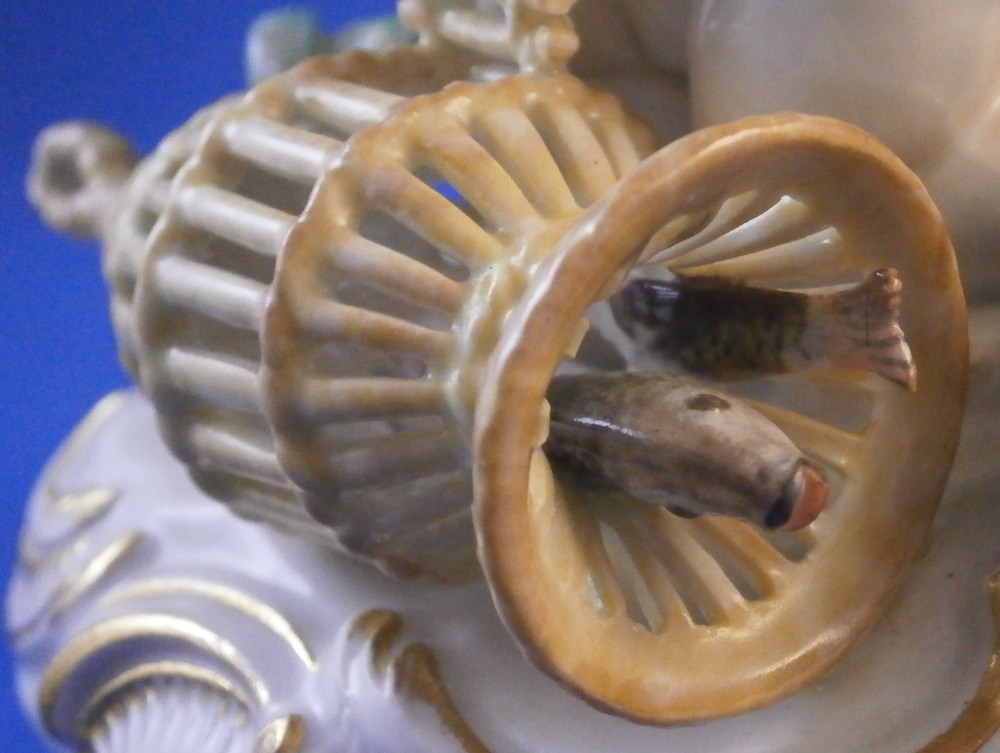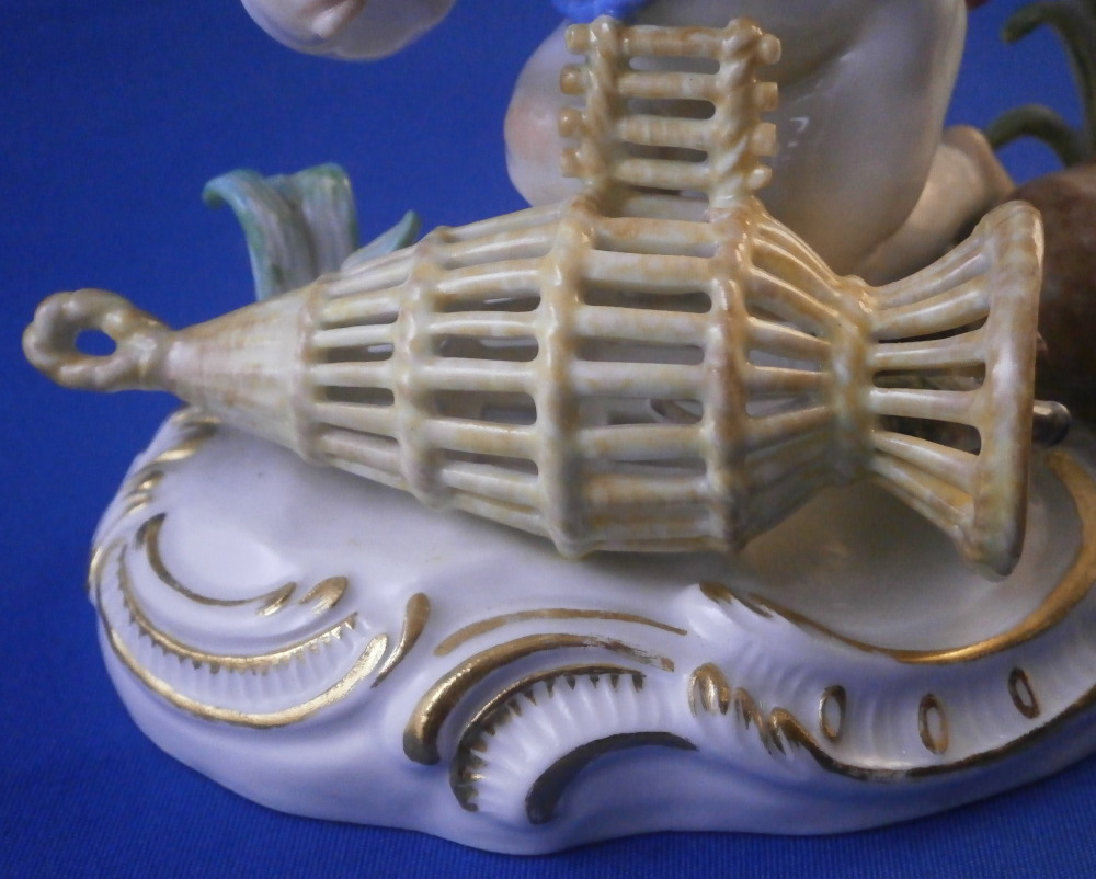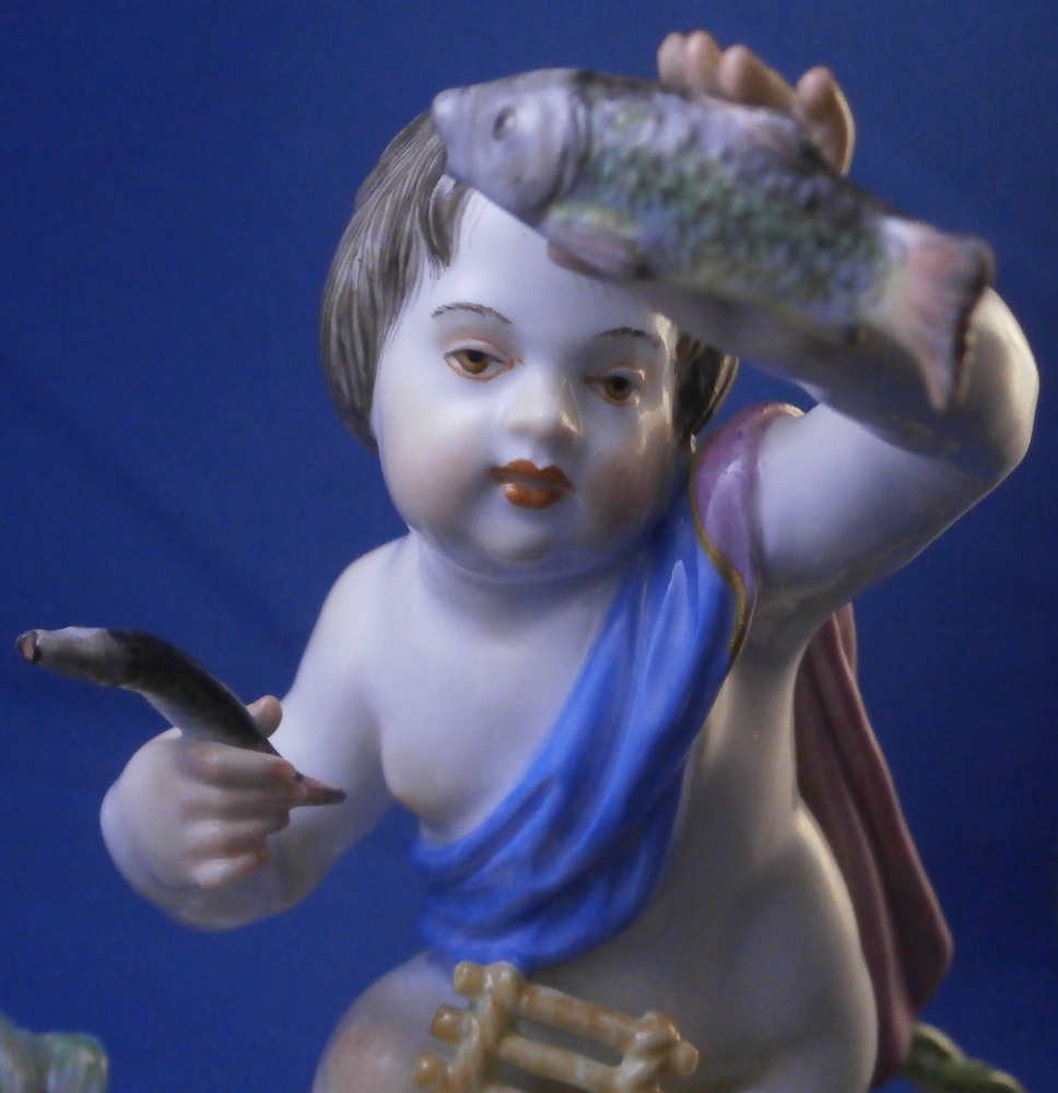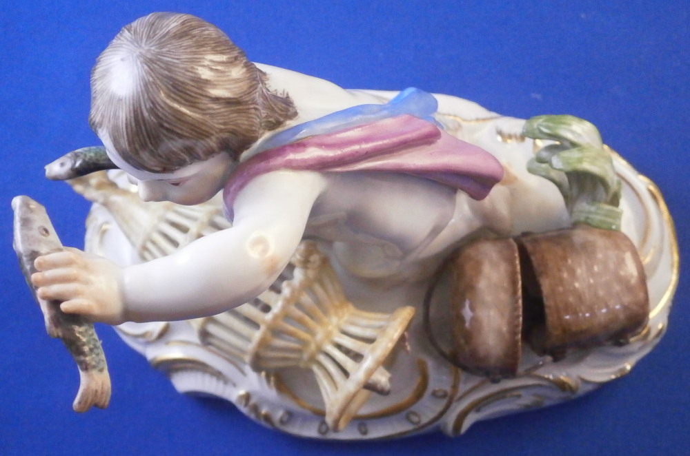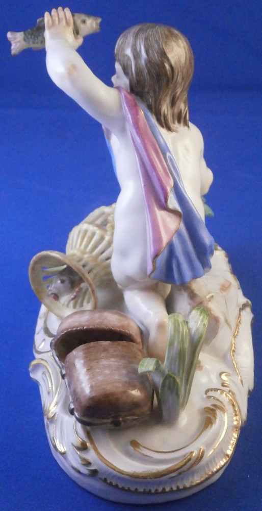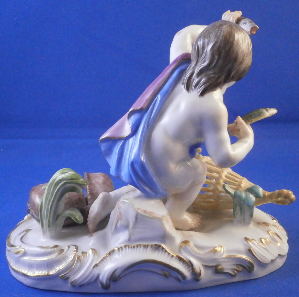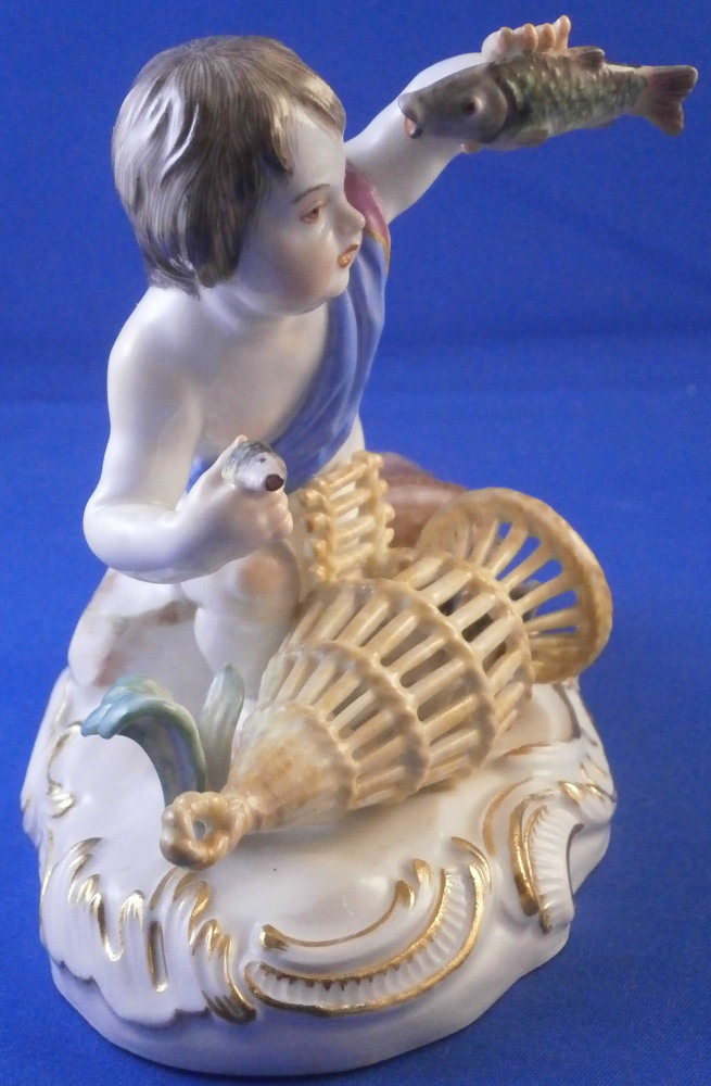 This is a really nice figurine emblematic of the element of water made by Meissen in the mid 20th century. Not a rare figurine by any means but what is very rare about this piece is that it is in almost in perfect condition - just a chip to the leaf of one of the grasses as shown. The piece is of a putto holding a fish in his upper hand, another fish in his lower hand, there is a primitive fish trap in front of him with two fish in it and a basket with its straps next to it that has a lobster in it. Two reeds growing out of the base which has lots of scrolls all around highlighted with gilding. This figure is one from the series of elements. I also have air and earth and fire listed if anyone is interested in the whole set.The figure is very well modeled and hand painted. It looks stunning on its own or even nicer in the set. The figurine is 4.25 inches tall, 5 inches wide and 3 inches deep. It is marked with the crossed swords mark underneath the base (first choice) as well as the usual impressed / incised marks as shown. Please email me for more information or other pictures.