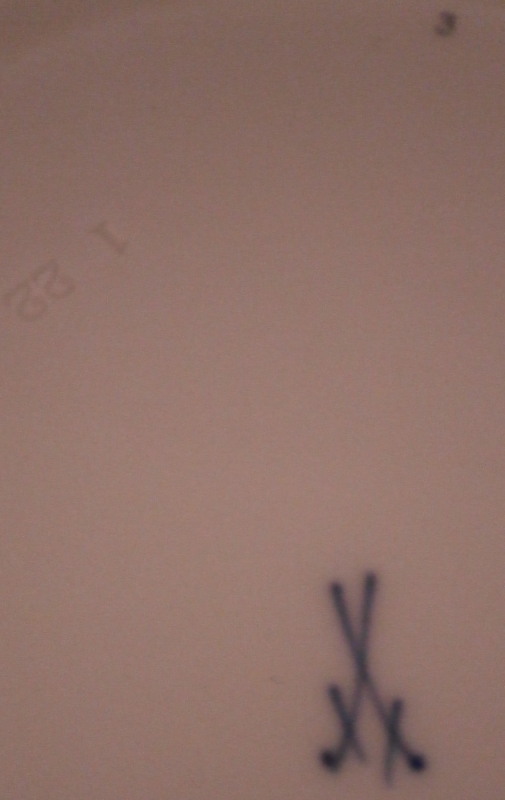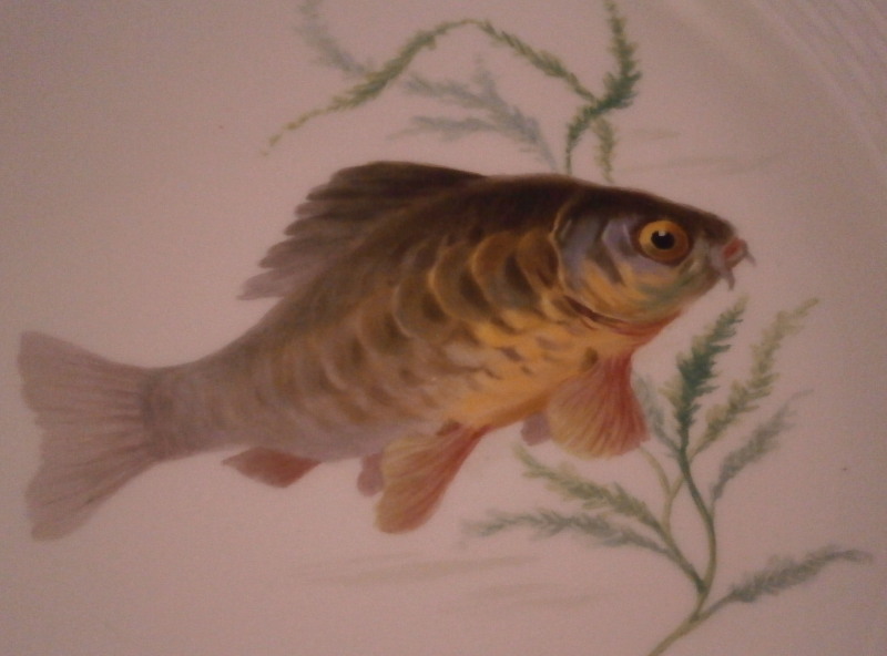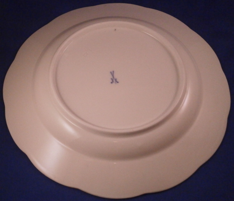 This is another great plate made by Meissen in the late 19th century or early 20th century. It is hand painted with a detailed fish scene in the center with a slight water effect around it as well as a green grass or algae grass behind it. The rim has a nice shape to it and a basket weave design to the paste with gold trim to the edge as well as two bugs and red corral hand painted on it. The plate is in perfect condition (with one spot of stray gold on the back rim) and marked with the under glaze blue crossed swords mark underneath as well as the usual impressed numbers and a black painter's mark 3. It is 1.375 inches tall and 10.25 inches in diameter. Please email me for more information or other pictures.