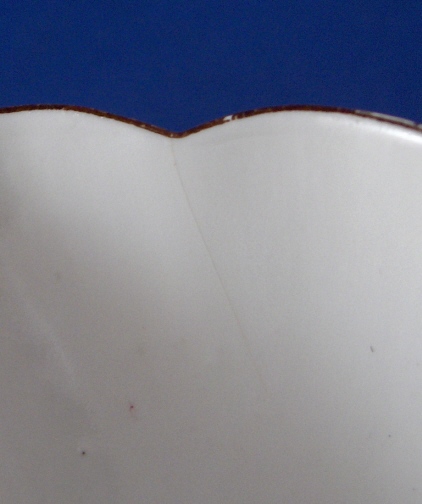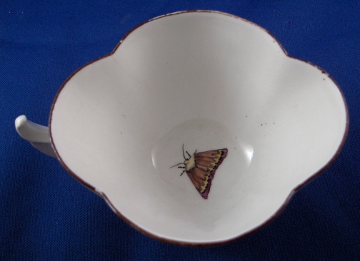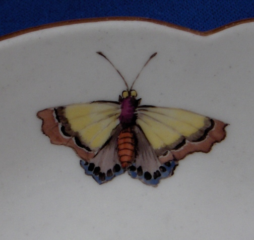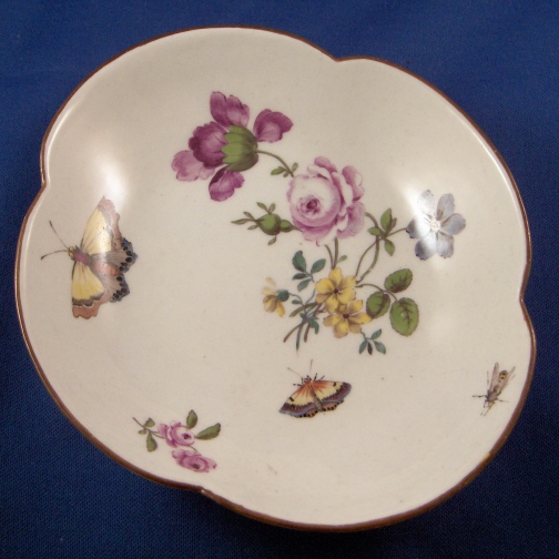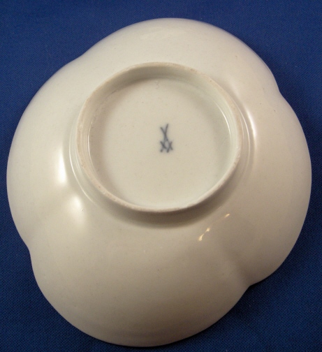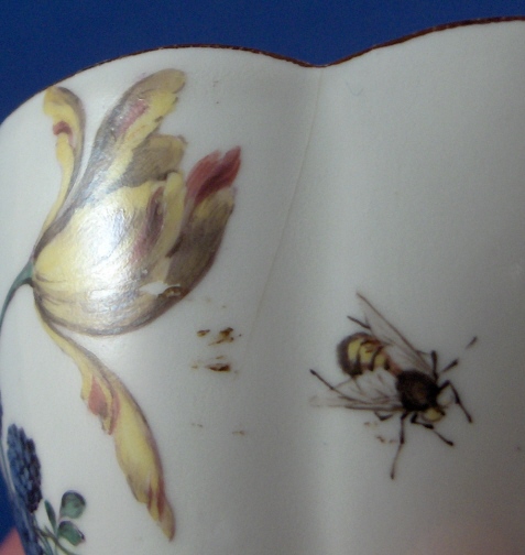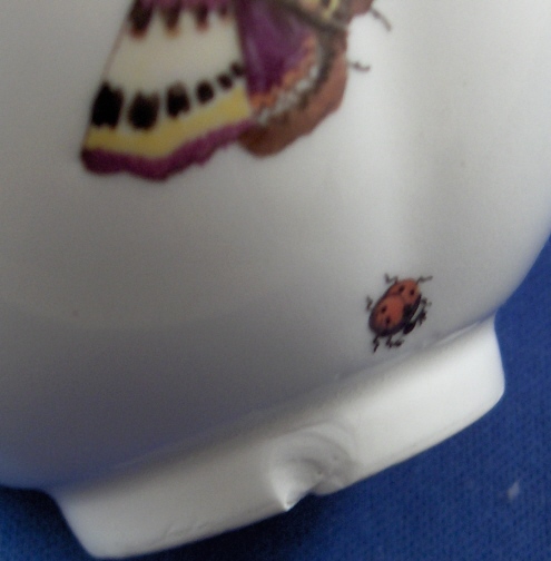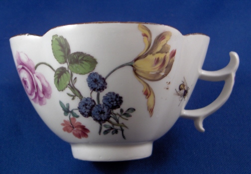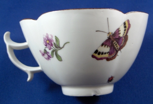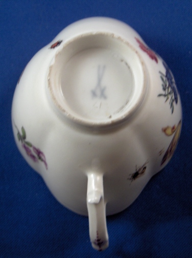 This is a very early and superb cup and saucer set made by Meissen in about 1740-1745. The shape is superb and the decoration is top as well. This is the shorter wider version of the ten cups I have for the set. For tea I presume. The colors are a bit stronger than in the pictures in real life for some reason. There is a large floral arrangement handpainted on the front and then there are lots of bugs and a small flower scattered throughout as well. From a small fly to the gorgeous large butterfly. Nice and rare handle shape as well! Nice brown trim on the rims. The flowers on these pieces are much more natural looking and much more detailed than later ones. The cup and saucer are in good condition with a tight hairline from the rim of the cup to the right of the yellow tulip. Not easy to spot at all! Also a small chip to the end of the cup handle and to the footring. The cup is just over 2 inches tall, 3.5 inches from front to back without the handle and just under 3 inches wide. The saucer is 1.25 inches tall, 5.375 inches wide and 4.75 inches deep. Both pieces are marked with the underglaze blue crossed swords mark underneath. There is an impressed 3 underneath the saucer. This is one of the cups and saucers to the rest of the set I have up on the site. Please email me for more information or other pictures.