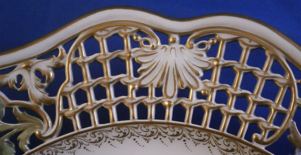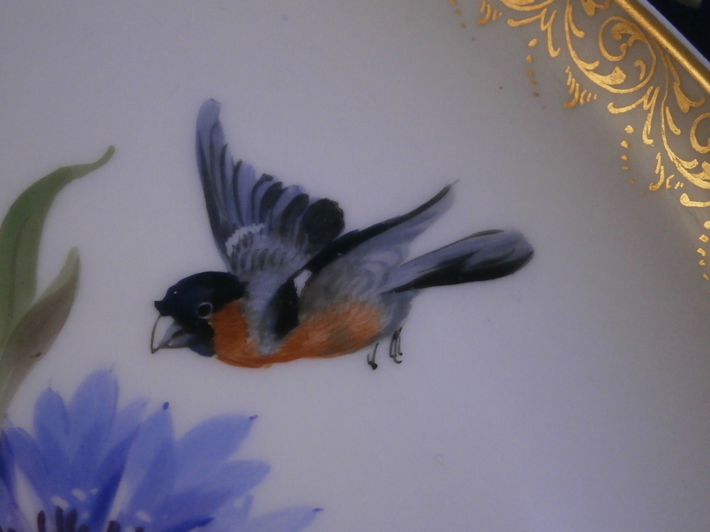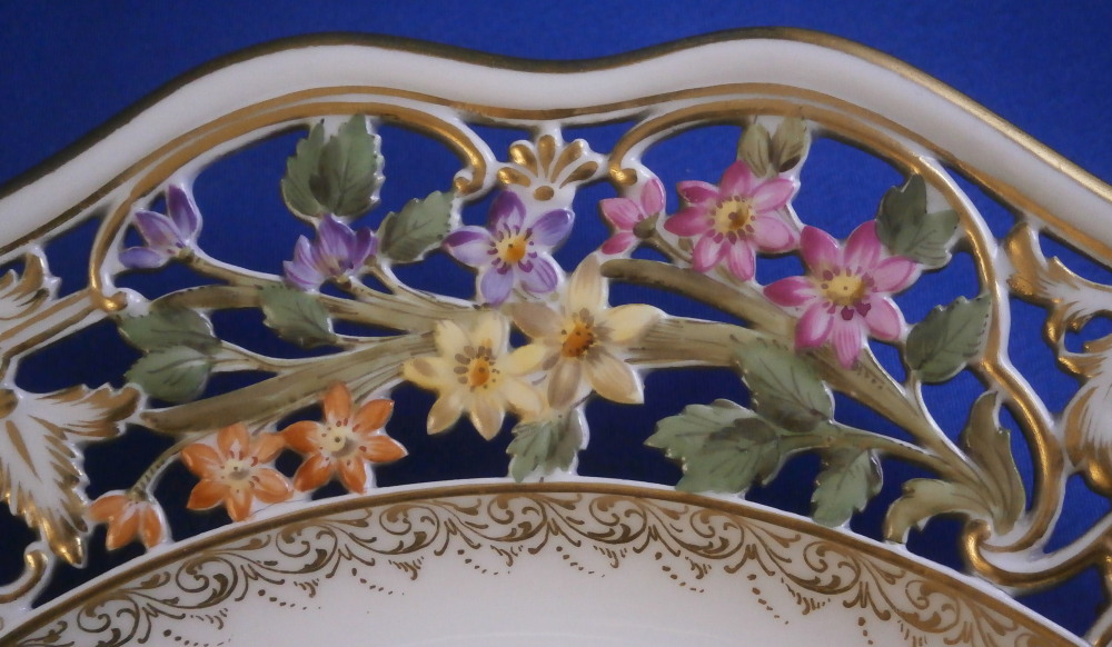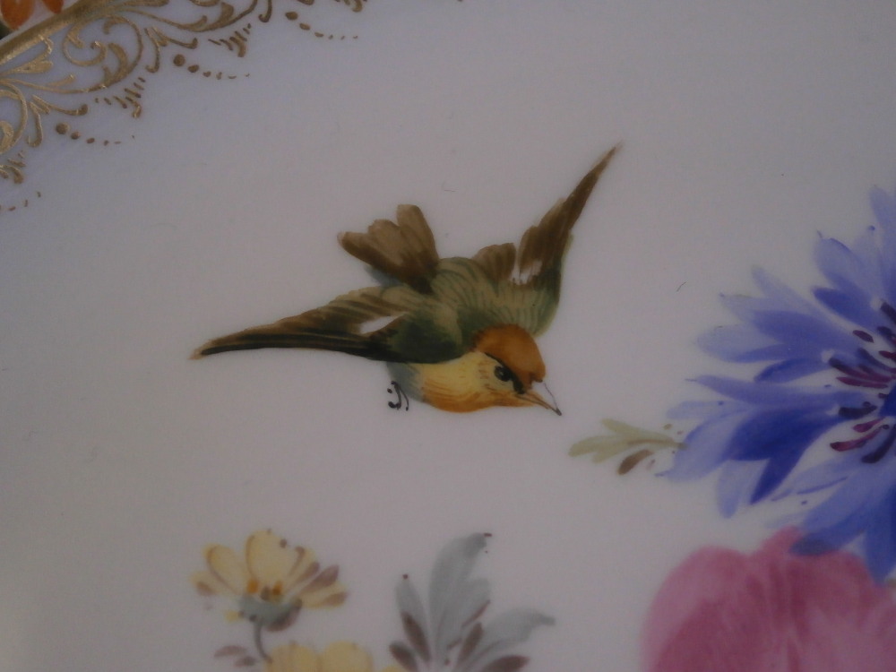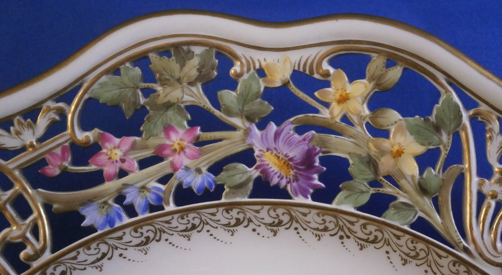 This is a superb plate made by Meissen in the later 19th century. It is hand painted with a detailed floral arrangement in the center that fills most of the well and is surrounded by three little yet superb birds as well as two butterflies / bugs and a fancy gold trim around the well edge but the most fun part is the fancy reticulated rim with lots of flowers and gold highlights. This is probably one of the nicest rim designs you can own by Meissen and is called Bruehlsches Allerlei as it was originally made for Count von Bruehl. The plate is in perfect condition which is astounding given the fragile nature and design. It is marked with the under glaze blue crossed swords mark (first choice) underneath as well as the usual impressed marks one finds on Meissen of this period. The plate is 1.5 inches tall and 10.25 inches in diameter so the larger version of this style. It looks amazing when on display! Please email me for more information or other pictures.