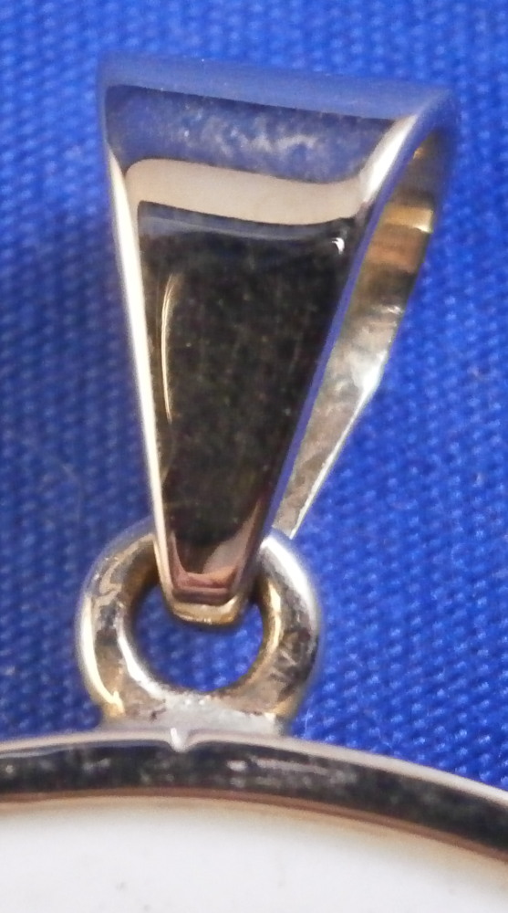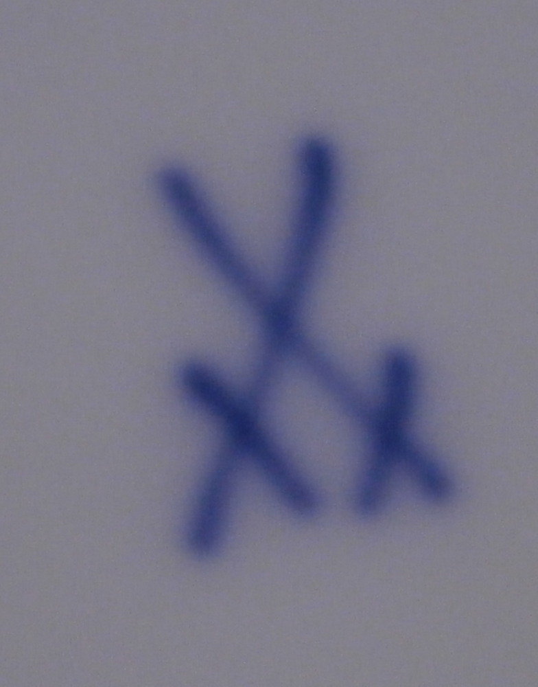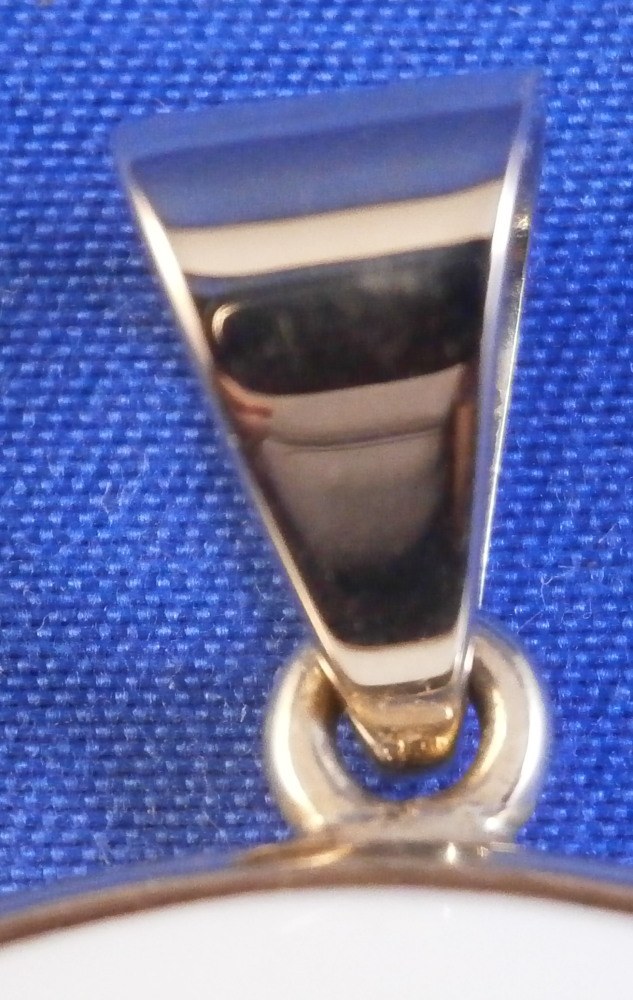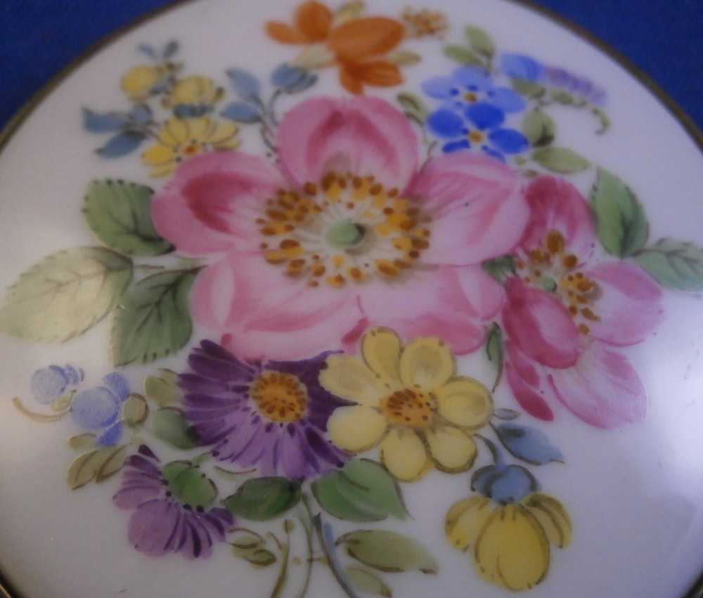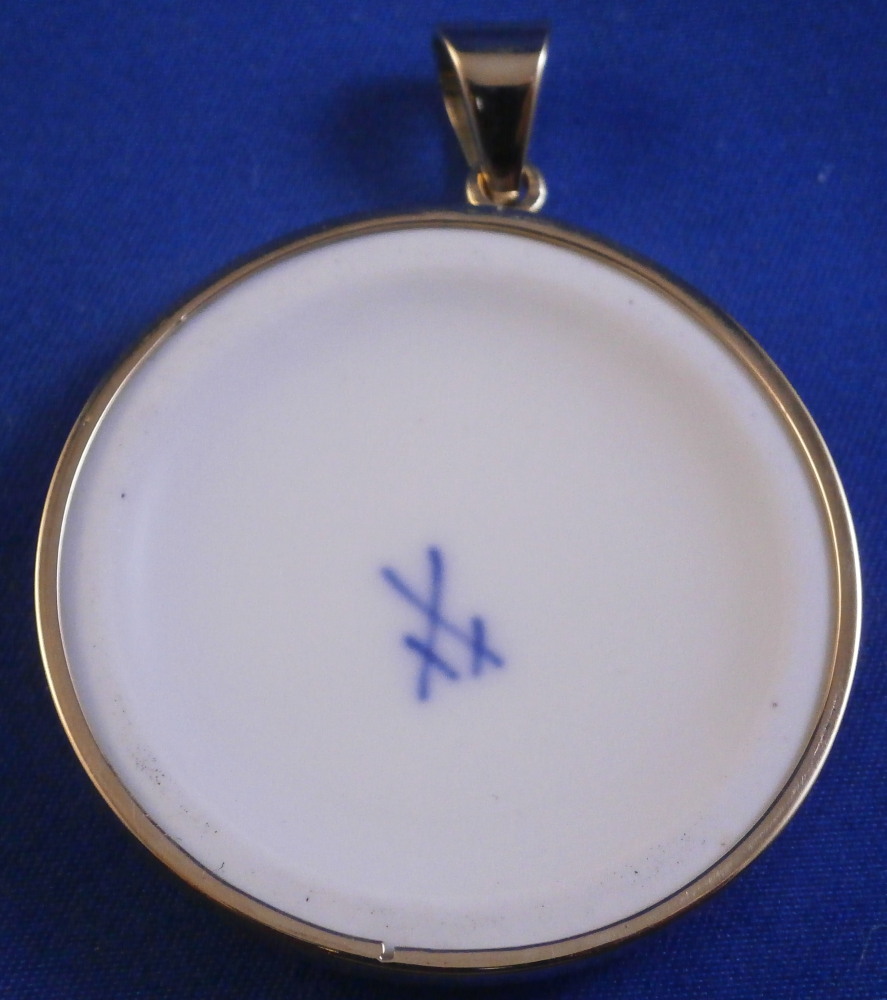 This is a large round shaped necklace pendant made by Meissen in the 20th century. It is plain white with is nicely hand painted with a floral arrangement filling pretty much the entire front. Looks gorgeous! It has a simple but very elegant mount made of gold. What kind I am not sure but it tested above 14K and under 18K when I ahd it tested. There is a very generous amount of gold on this piece. Enough to make it feel way too heavy for its size of porcelain. On my letter scale it bounces between 0.9 ounces and 1 ounce. Not sure how much the porcelain weights. The porcelain piece is marked underneath with the under glaze blue swords mark as shown - 1st quality. The mounts are not marked as far as I can see but they tested as at least 14K gold probably a bit higher. The piece is 1.75 inches in diameter with the necklace attachment part sticks up about 0.5 inches from there. It is in perfect condition! Please email me for more information or other pictures.