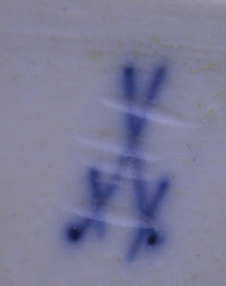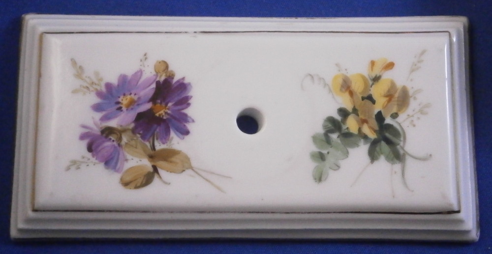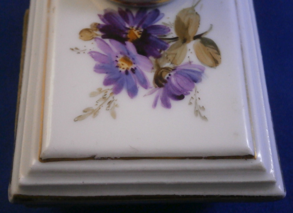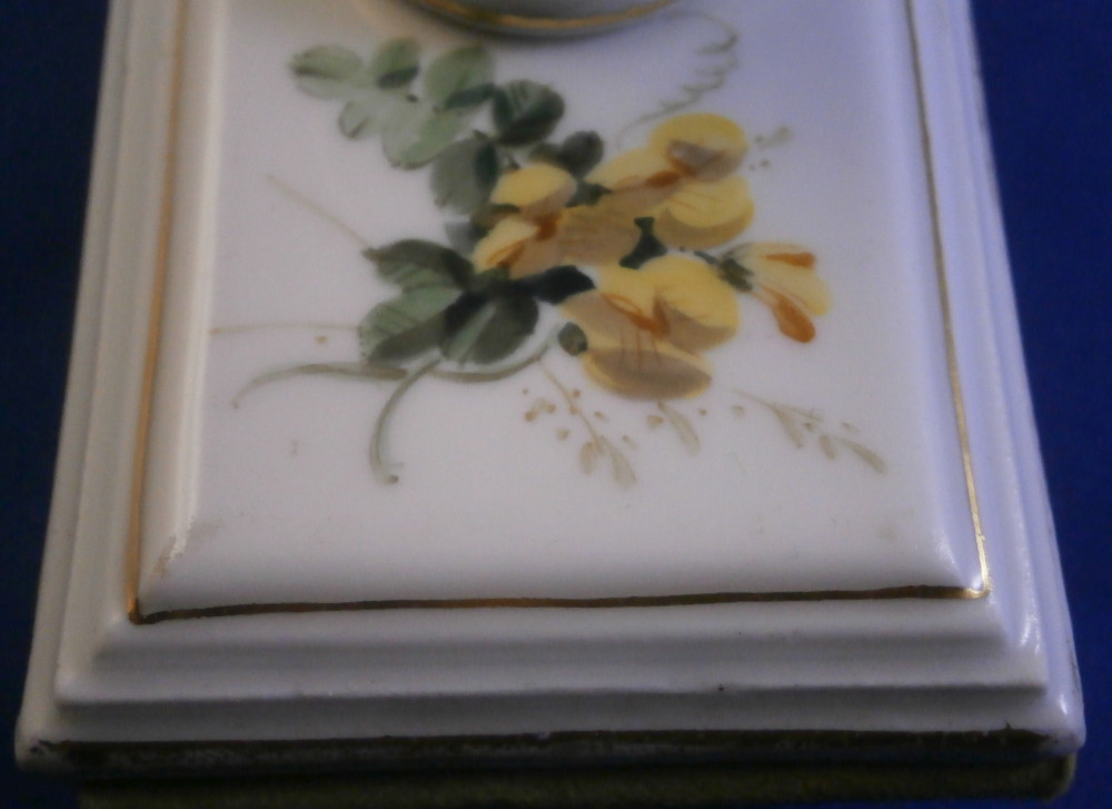This is a nice blotter made by Meissen in the late 19th or early 20th century. A nicely done example with the knob part having a hand painted butterfly / bug on it and the plate two nice hand painted flowers to it. A purple one to one side and a yellow one to the other. Gold trim to finish off this ncie example! The blotter part is made of metal (probably brass) that is open to the sides. That is covered with a green blotting paper. The blotter comes apart into three pieces plus a metal dish as a spacer as I have shown in the pictures which is normal so you can attach blotter paper to it. The porcelain knob and plate are both marked underneath with the blue swords mark as shown with four cuts across them - made for use by their workers which often decorated them with their specialty so the quality is very good. It was not meant for sale but for use of the workers and to take home and give away as gifts. The entire blotter is 2.375 inches tall, 4.25 inches long and 2.125 inches wide. A really nice and rare piece! It displays nicely but does have wear to the gold trim. It would be a very ahrd to find addition to a desk set or inkwell if you have something with a similar design! Please email me for more information or other pictures.