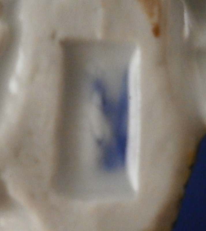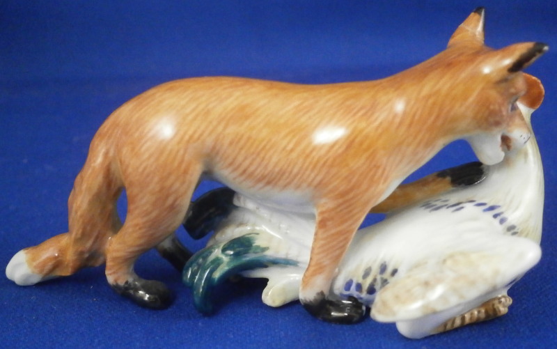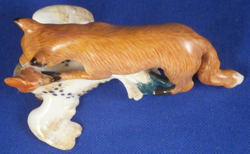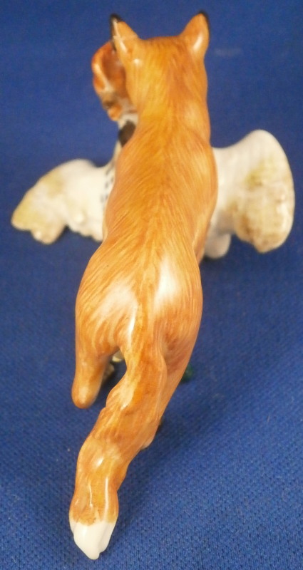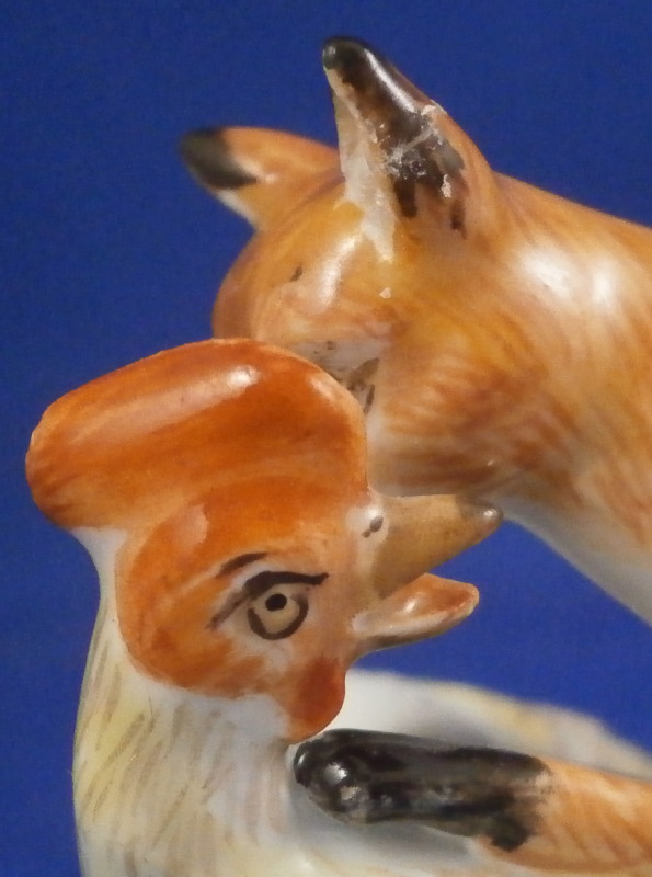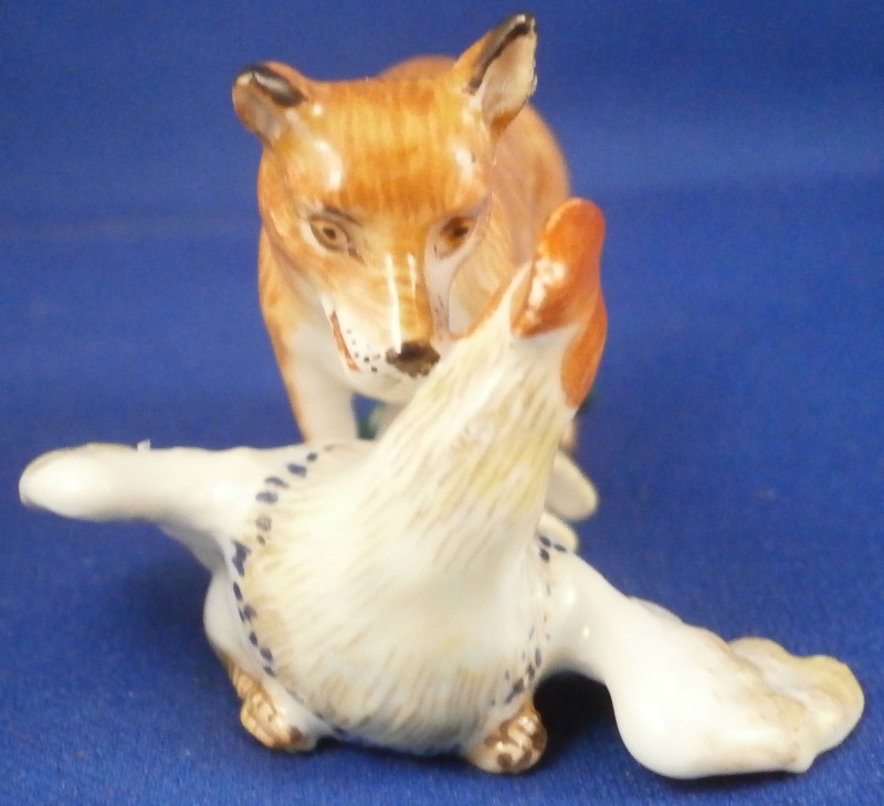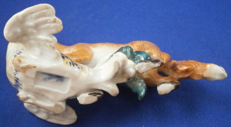 This is a great figurine of a fox killing a rooster and carrying it away made by Meissen in the 20th century. The fox is superbly modeled with lots of nice detail but the chicken is just superb with all those feathers and the wings spread out during his last minutes on this earth. It's not looking good for the guy :( The entire figure is really well modeled and hand painted perfectly. All in all a very hard to find figure and a fun piece in a morbid sort of way. The figurine is in good condition and displays perfectly but his left ear has been reglued. Not obvious at all in real life but easily seen in the closeups I took to show it clearly. It was a clean break and reglued perfectly and if one wanted to it could be perfectly touched up for very little money by any restorer! The figurine is marked underneath with the under glaze blue crossed swords mark as well as the usual impressed numbers as shown. The piece is 1.5 inches tall, 1.875 inches wide and 3 inches long. Please email me for more information or other pictures.