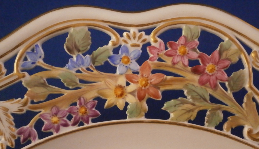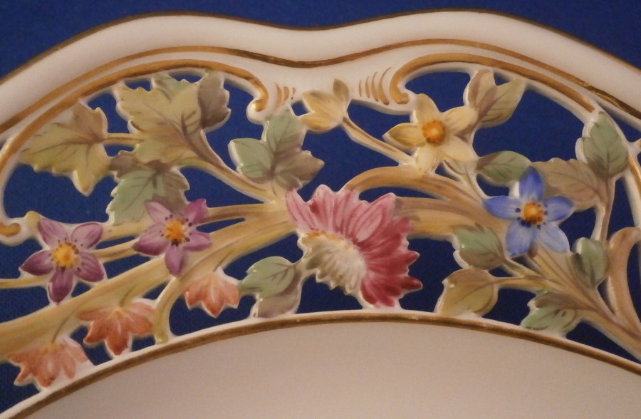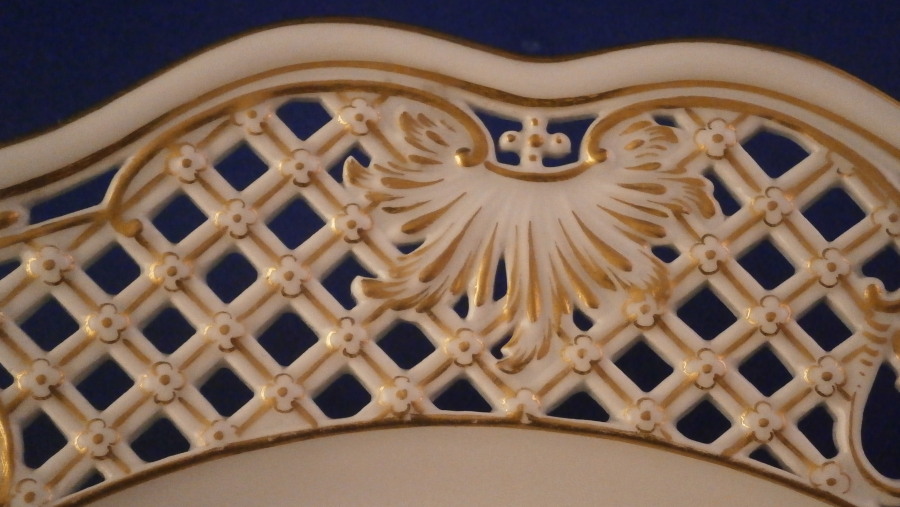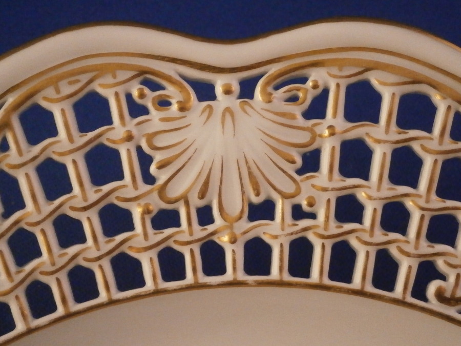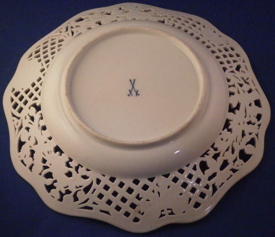 The plate is a superb plate made by Meissen in the late 19th century. It has a rim design called Brühlsches Allerei which includes a large hand painted fruit arrangement in the center which is much rarer than the flower ones and it has three little bugs / butteflies around it. Off course it has the very fancy reticulated rim with lots of flowers and gold highlights which gives it its name. Each reticulated area is different with three that are more plain with just a touch of gilding and three more that are in the shape of a floral arrangement with each flower hand painted perfectly! The Bruehlsches Allerlei design is one of the nicest rim designs one can own by Meissen - it was originally made for Count von Bruehl . The edge has a gold trim to it. The plate is in perfect condition which is always a bonus. It is marked with the under glaze blue crossed swords mark as well as the usual impressed numbers one find on Meissen of this period as shown. The plate is 1.625 inches tall and 10.25 inches in diameter which is a very nice size.