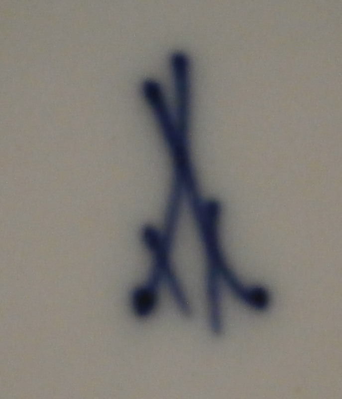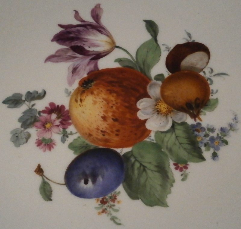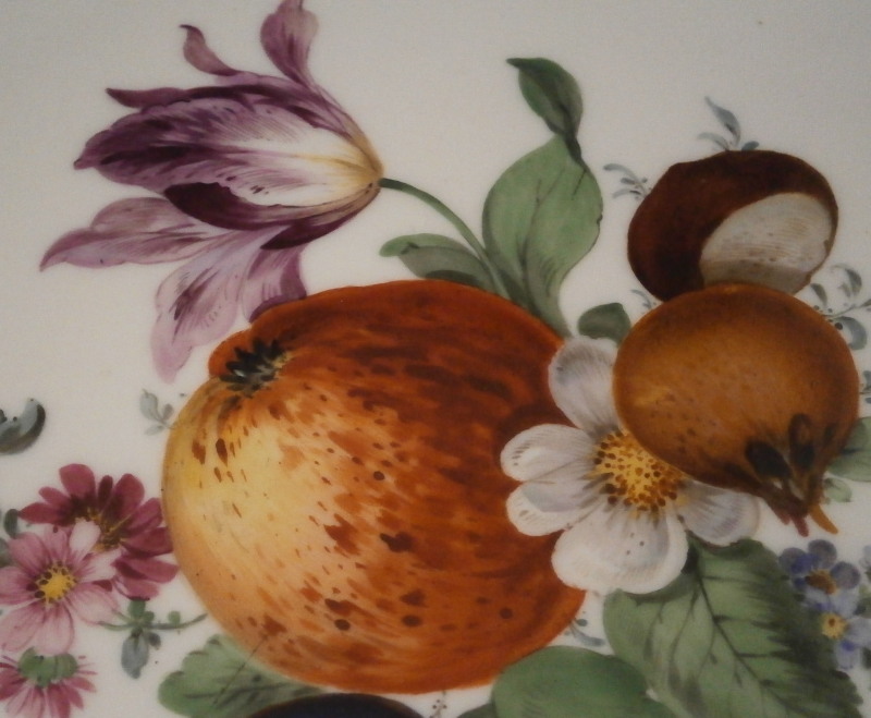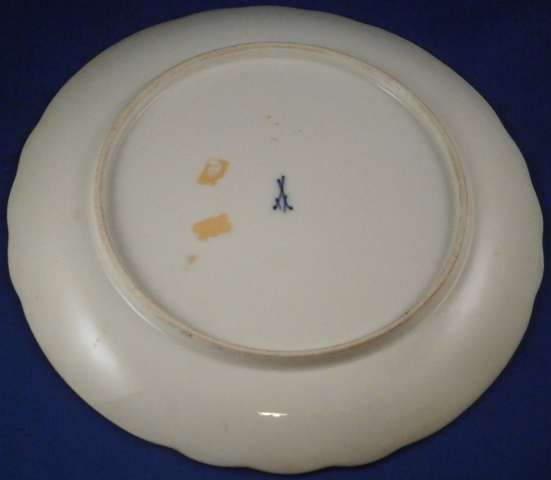 This is a nice plate made by Meissen in the late 19th century. It is hand painted with a large fruit, flower and nut arrangement scene in the center as well as a bit of a relief design along the rim and a gold trim to the nicely shaped edge. Not the most exciting piece but quite nice nontheless. The plate is in great condition with two small scratches that don't take away from the piece at all and considering its age that is about as nice as one can hope for. The piece is marked with the under glaze blue crossed swords mark underneath as well as the usual impressed numbers. The plate is 0.875 inches tall and 9 inches in diameter. Please email me for more information or other pictures.