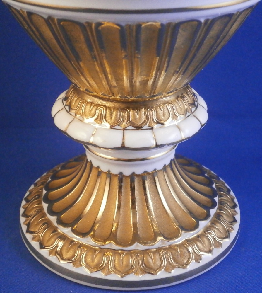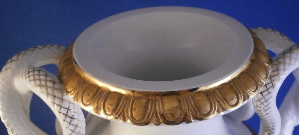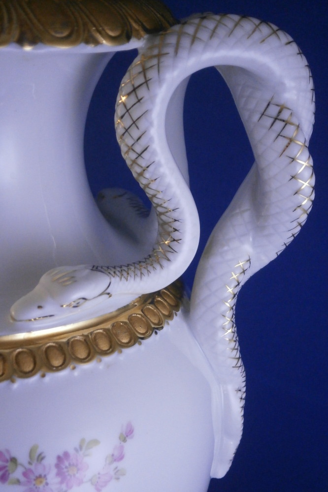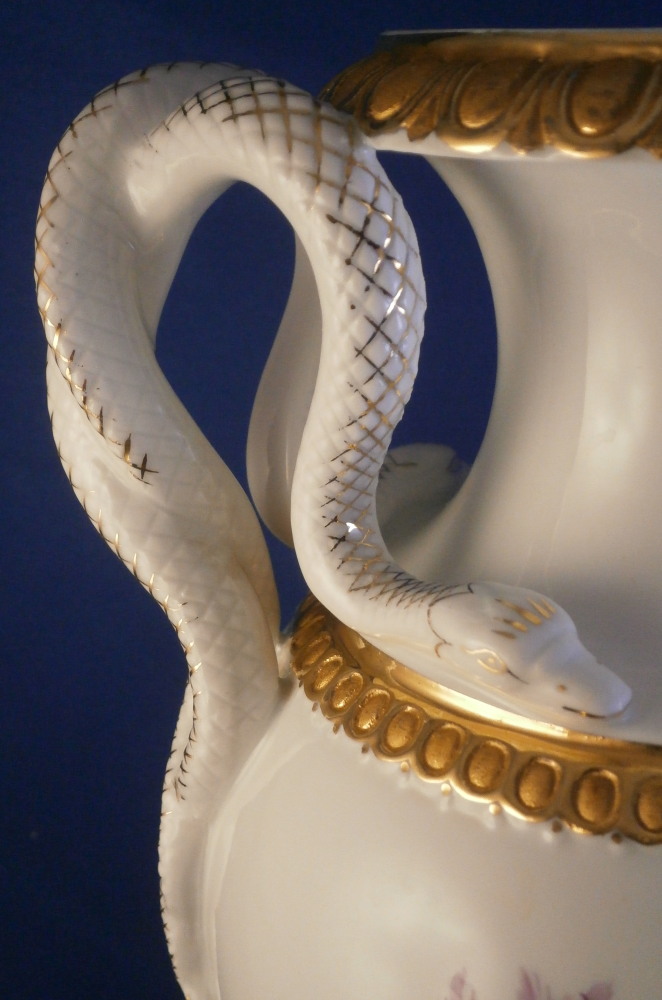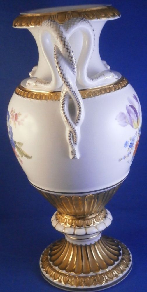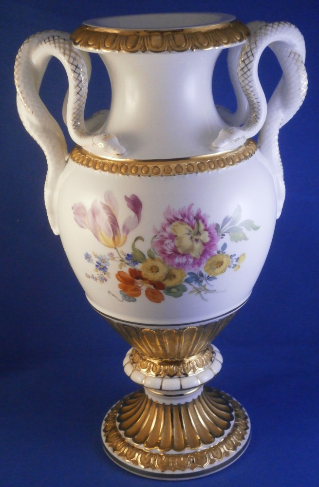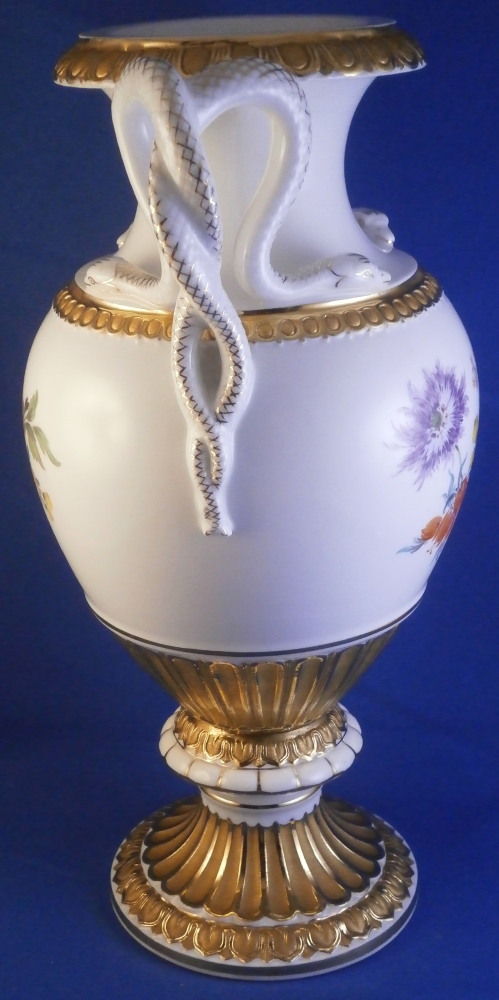 This is a really nice amphora shaped vase made by Meissen in the 20th century. A very popular design with the snake handles on either side! It was first designed by Ernst August Leuteritz in 1861 and is still very popular today. It is hard to find them in perfect condition, first choice and with the full gilding which looks amazing! The vase has a large hand painted polychrome floral arrangement on white ground in the front as well as the back, the foot and bottom of the main body have this superb gilding to it which is half shiny and half matte - a combo that looks amazing. Same type of gilding to the top and just under the snake heads. Each snake has a relief scale design to the body partially highlighted with gilding and the heads have gold facial details to it. The piece comes in two pieces that are connected with a screw system which is normal. The base is marked underneath with the under glaze blue crossed swords mark as shown and the usual impressed numbers and marks also shown. The vase is is 10.625 inches tall, 6.5 inches from handle to handle and 5 inches in diameter in the center. In perfect condition but there is one tiny firing spot between the snake heads on one side as shown. Made that way and still deemed a first choice so obviously not a big deal. Please email me for more information or other pictures.