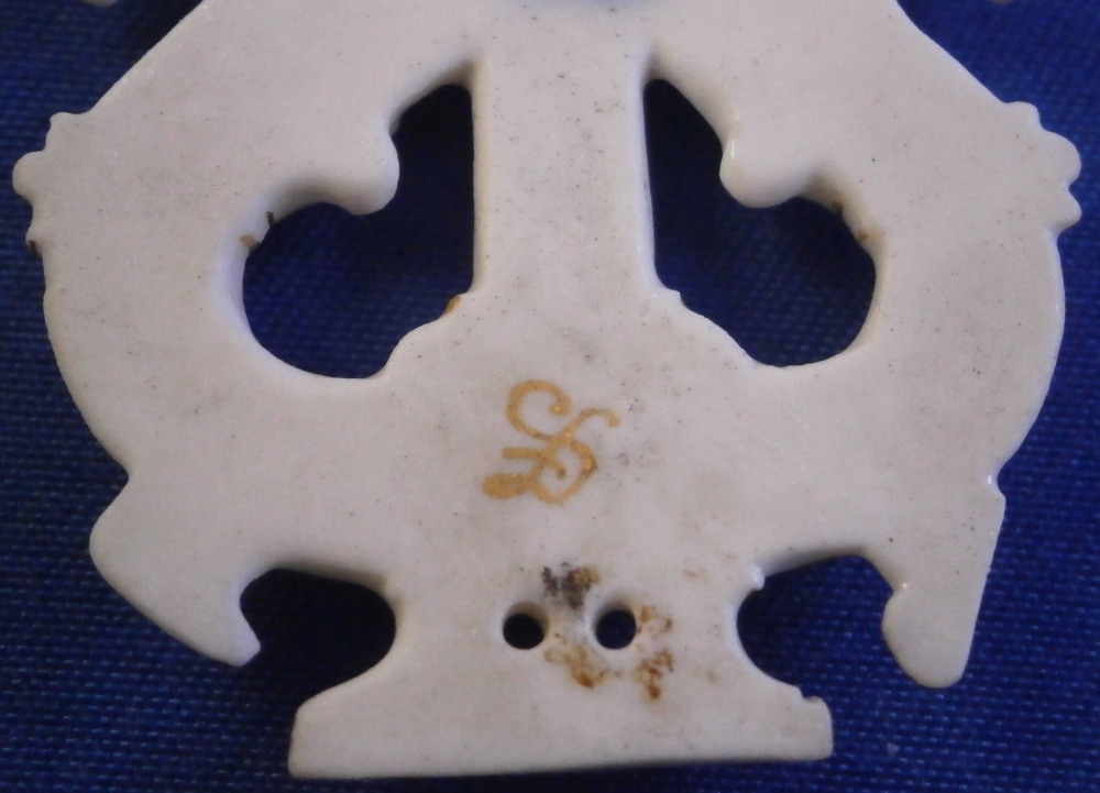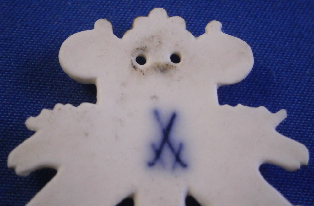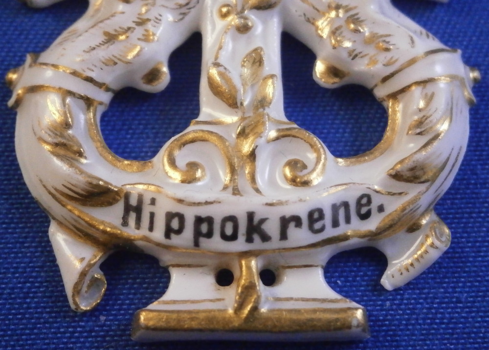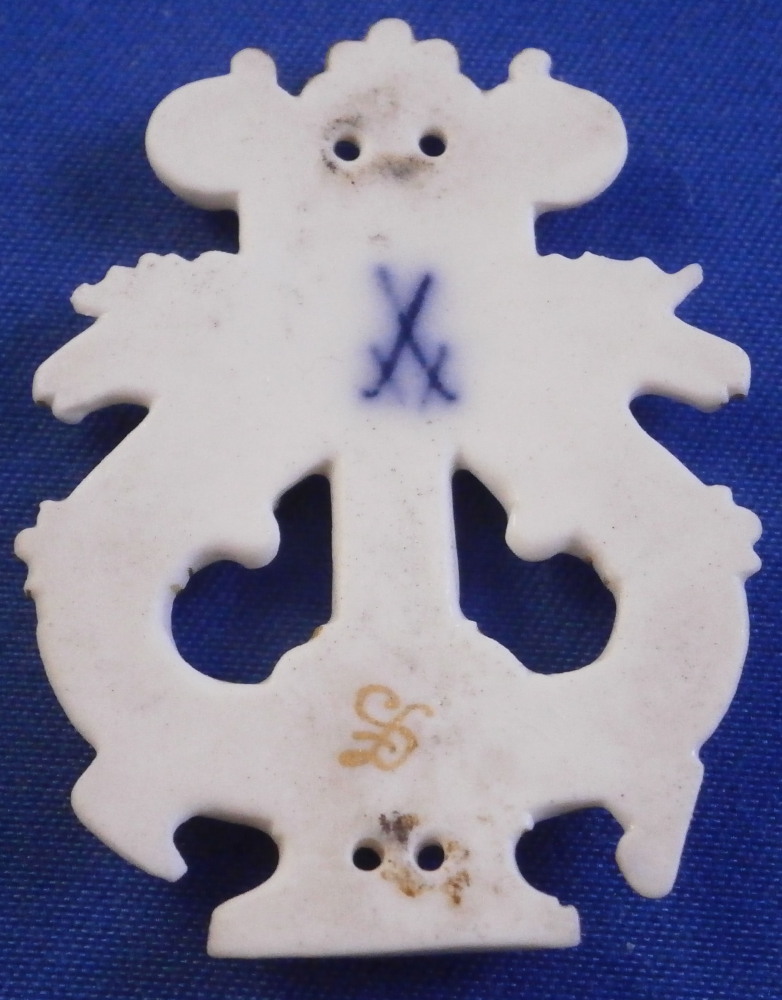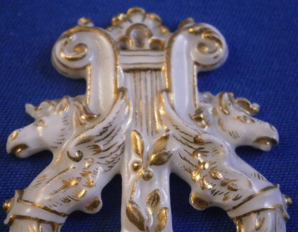 This is a really interesting piece made by Meissen around the later 19th or early 20th century. It is a fun piece made for the Meissen choir, which was called Hyppokrene . The Meissen choir was staffed only with Meissen employees and was started in 1860. Today the choir has the name " Blaue Schwerter ". The little badge / plaque was given to the members or used to adorn some of their items I would guess as it has little holes to attach it to something using tiny nails or sew it onto something. The piece is in the shape of a harp with little horse heads at the terminals. Amazingly detailed and super fragile so it is a wonder one has survived! The relief detail is highlighted with lots of gilding. The piece is marked in the back with the blue crossed swords as shown as well as a gilder's mark. Fun piece with a nice provenance and an interesting connection to the choir that is still around today. The piece is 1.625 inches tall, 1.25 inches wide and 0.125 inches thick. So super thing and fragile. It is in great condition with a tiny chip to the mane of the horse on the left not visible when on display! Please email me for more information or other pictures.