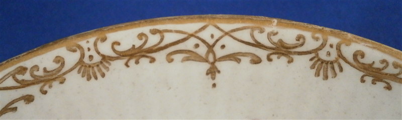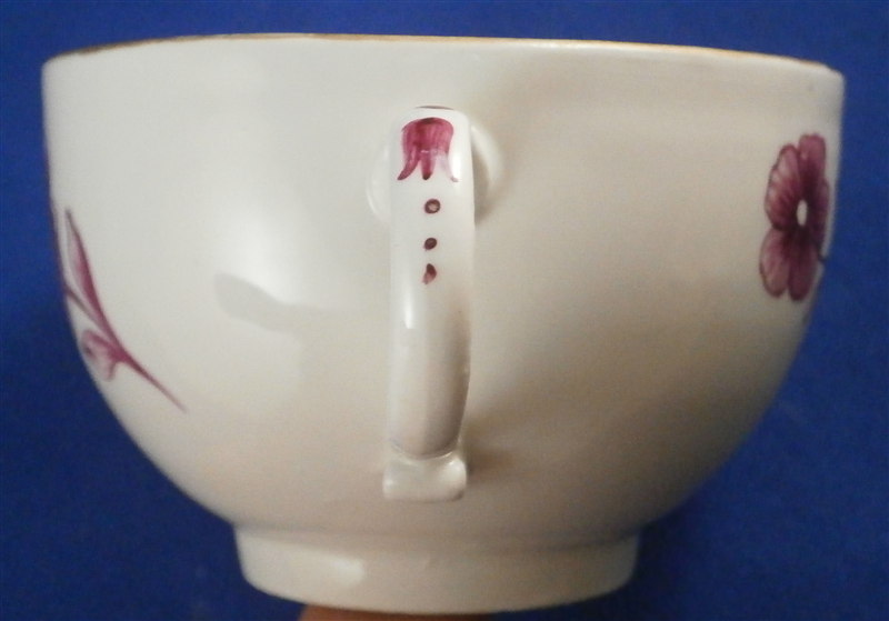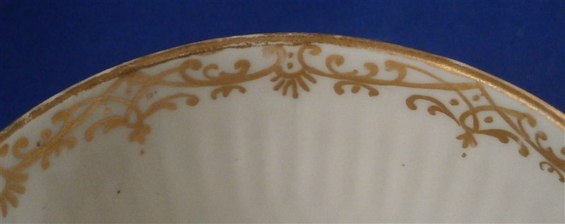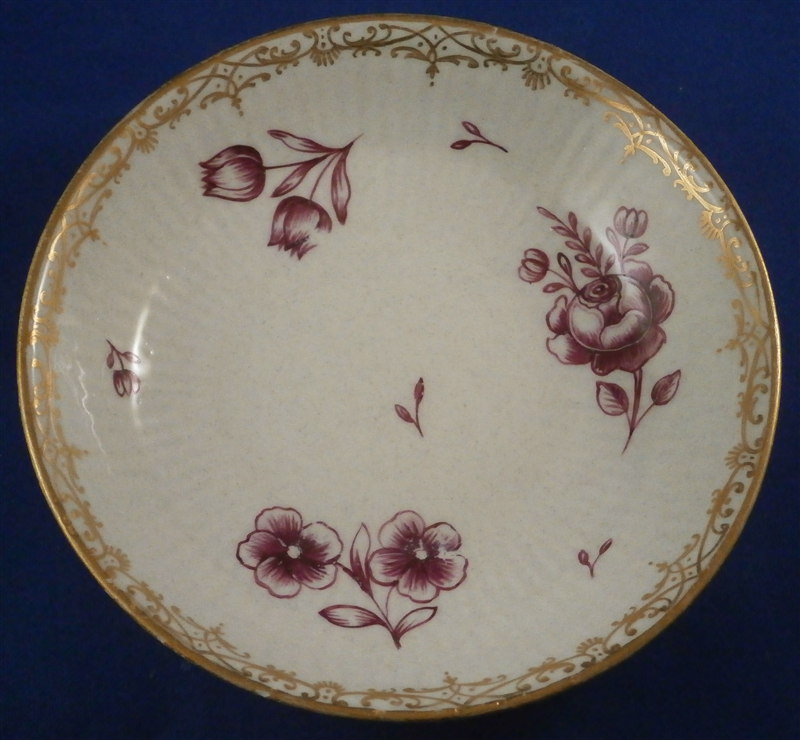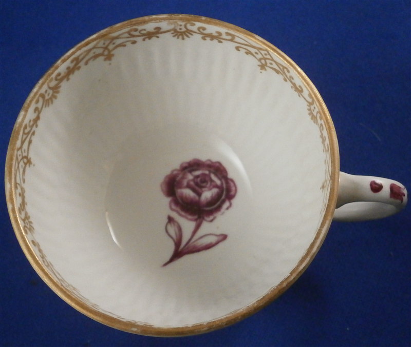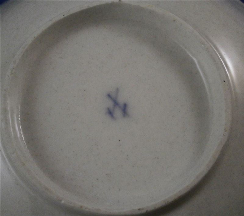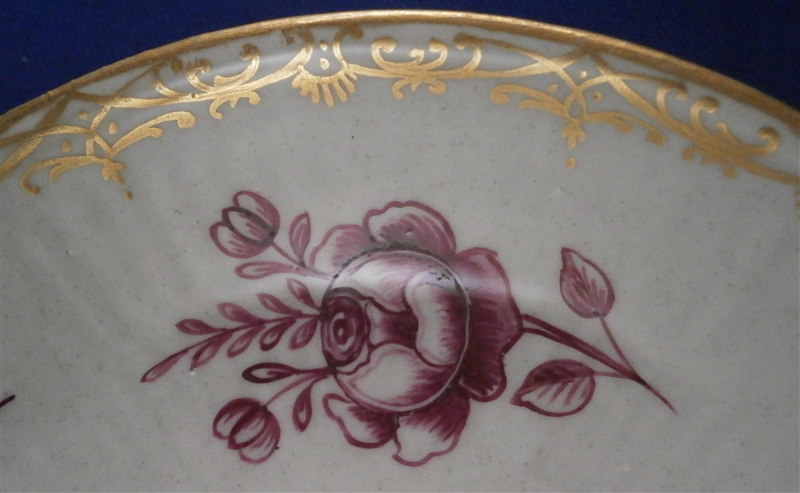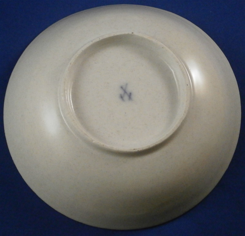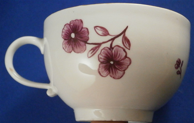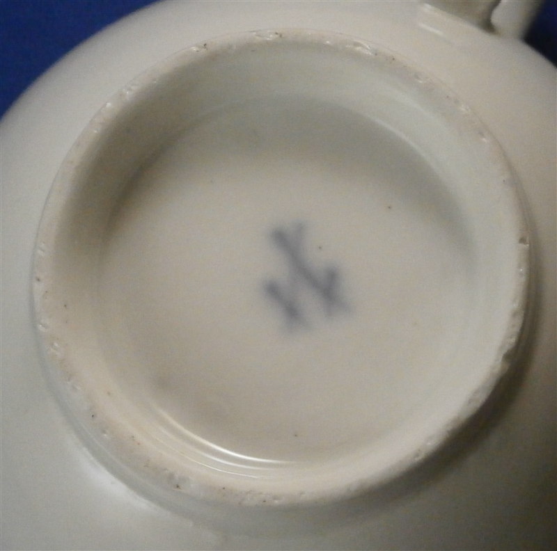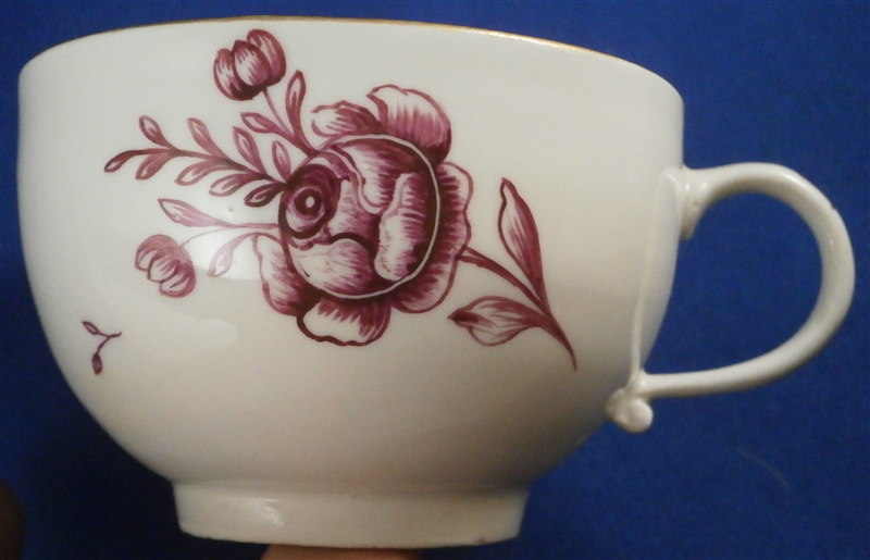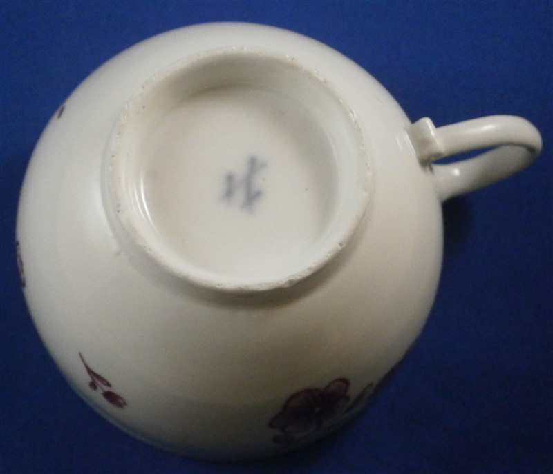 This is a cup and saucer made by Meissen in about 1745. Both are hand painted with puce flowers reminiscent of the woodcut style but more stylized and really quite interesting and stunning looking. The cup and saucer also have a fancy gold trim and a ribbed design to the paste itself. Both pieces are in superb condition with a tiny bit of wear to the gold trim on the very edge and the saucer has lots of faint tiny firing spots to it. The cup is 1.875 inch tall and 3 inches in diameter. The saucer is 1.25 inches tall and 5.3.75 inches in diameter. Both are marked with the underglaze blue crossed swords mark underneath as well as an impressed number. Please email me for more information or other pictures.