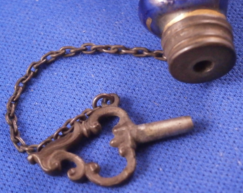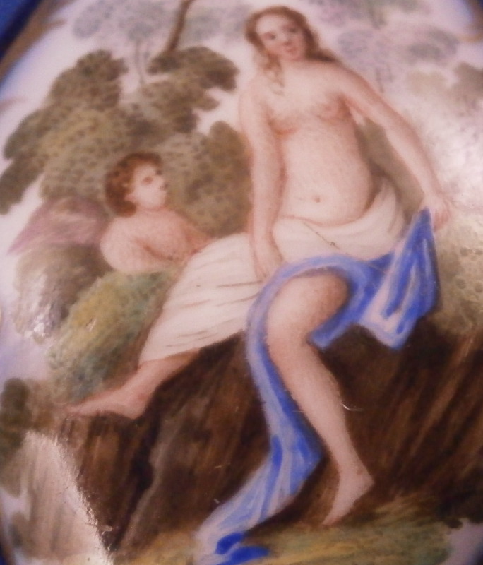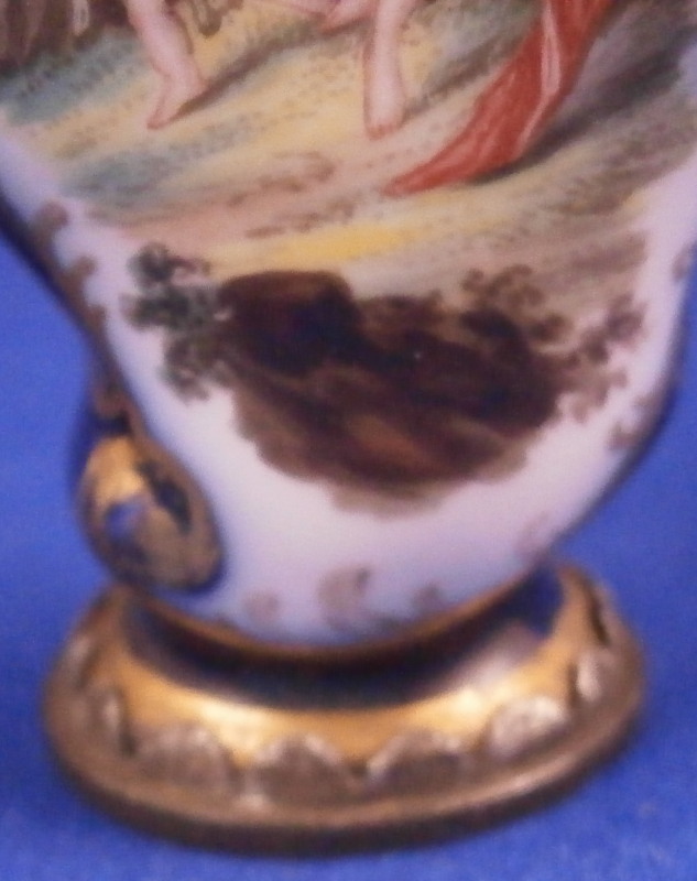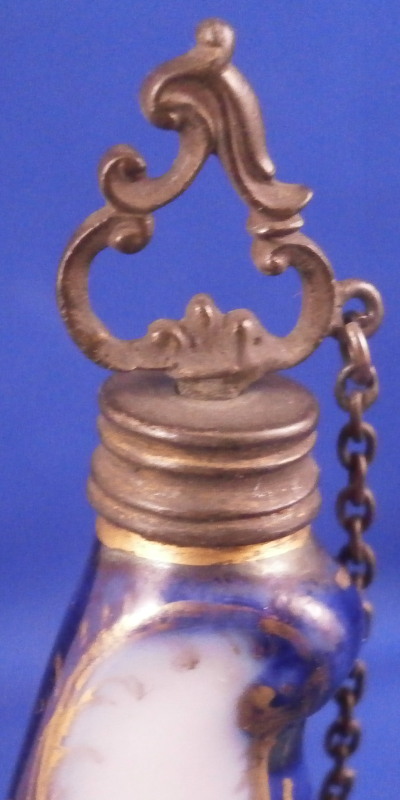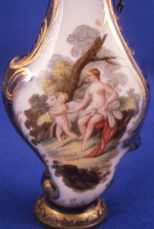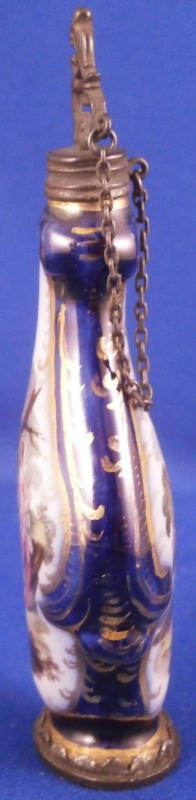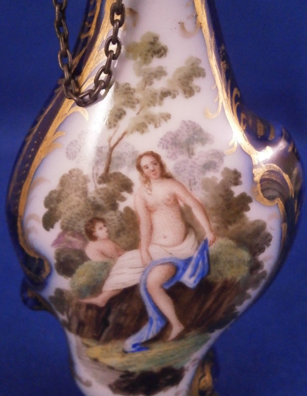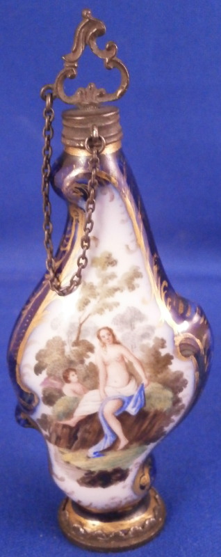 This is a superb perfume bottle made by Meissen in about 1740. It has a nice shape to it and is hand painted with two superb scenes including a nude lady and a putto / cherub in a landscape surrounding. The sides of the bottle are covered in a blue ground color with some gilding to it. It has its nicely shaped original silver stopper to it attached to the top mount with a tiny chain and a decorative silver mount to the base that has some nice designs to it as well. The bottle is in perfect condition with the silver mounts having blackened from oxidation over time which is normal and could easily be brought back to a silver shine if one wanted it but I prefer to leave them as is. Otherwise the stopper and mounts are in perfect order and just superb! The entire piece is is 3.875 inches tall, 1.5 inches wide and just over 0.75 inches deep. The piece is not visibly marked since the base mounts are covering up the porcelain on the underside. Please email me for more information or other pictures.