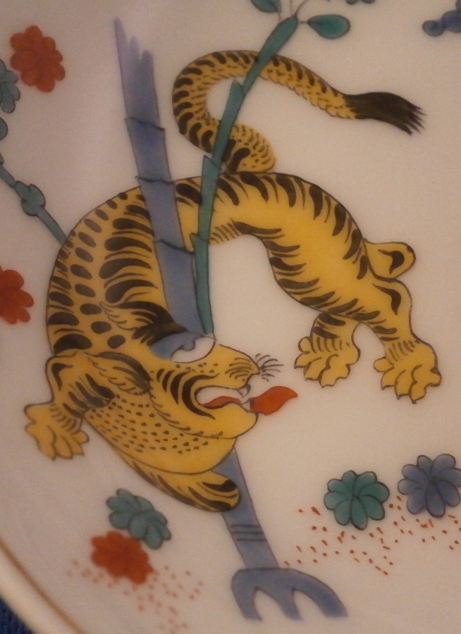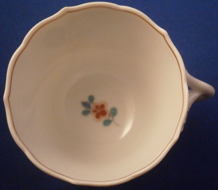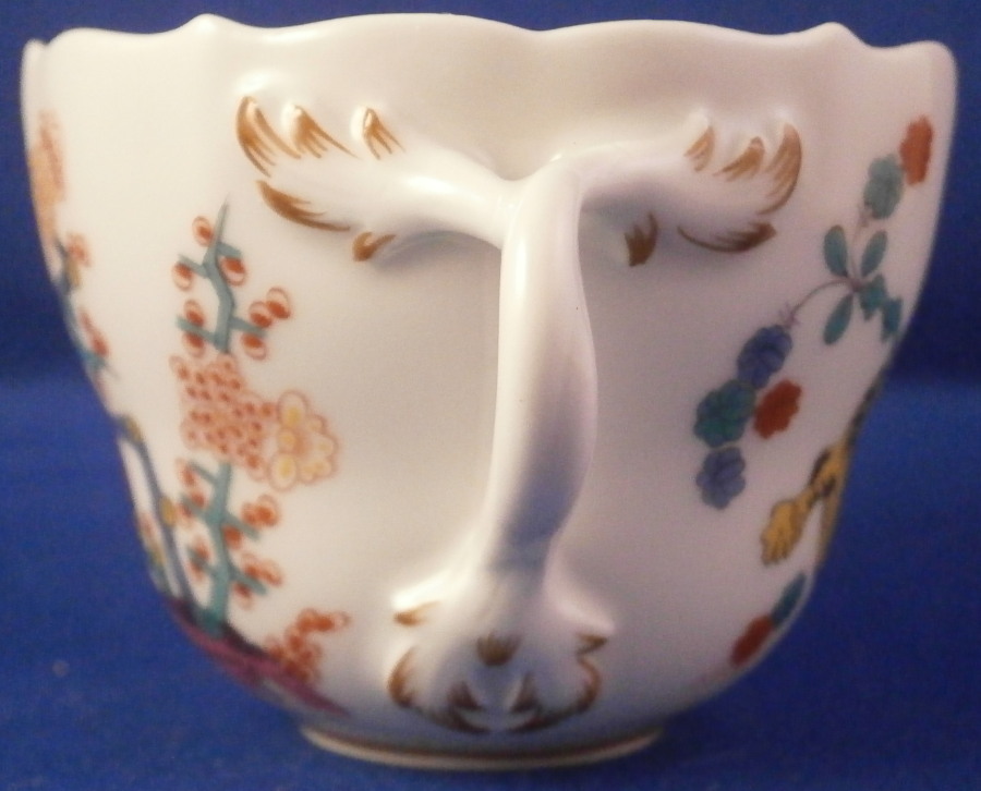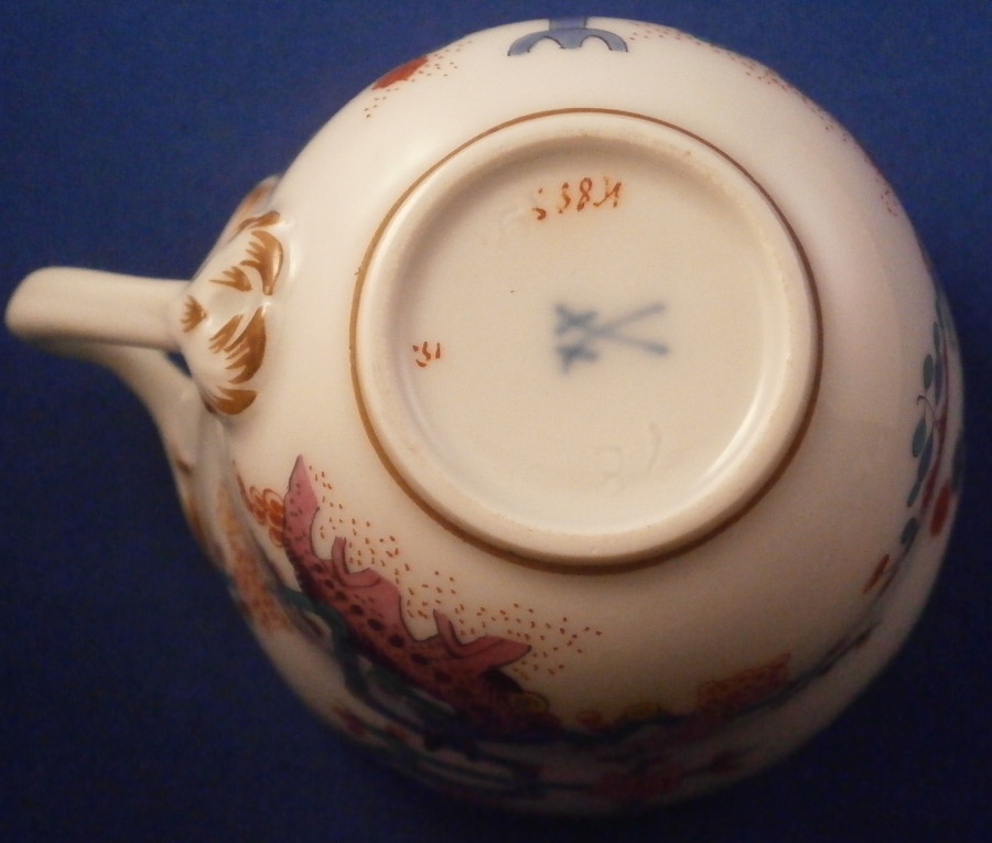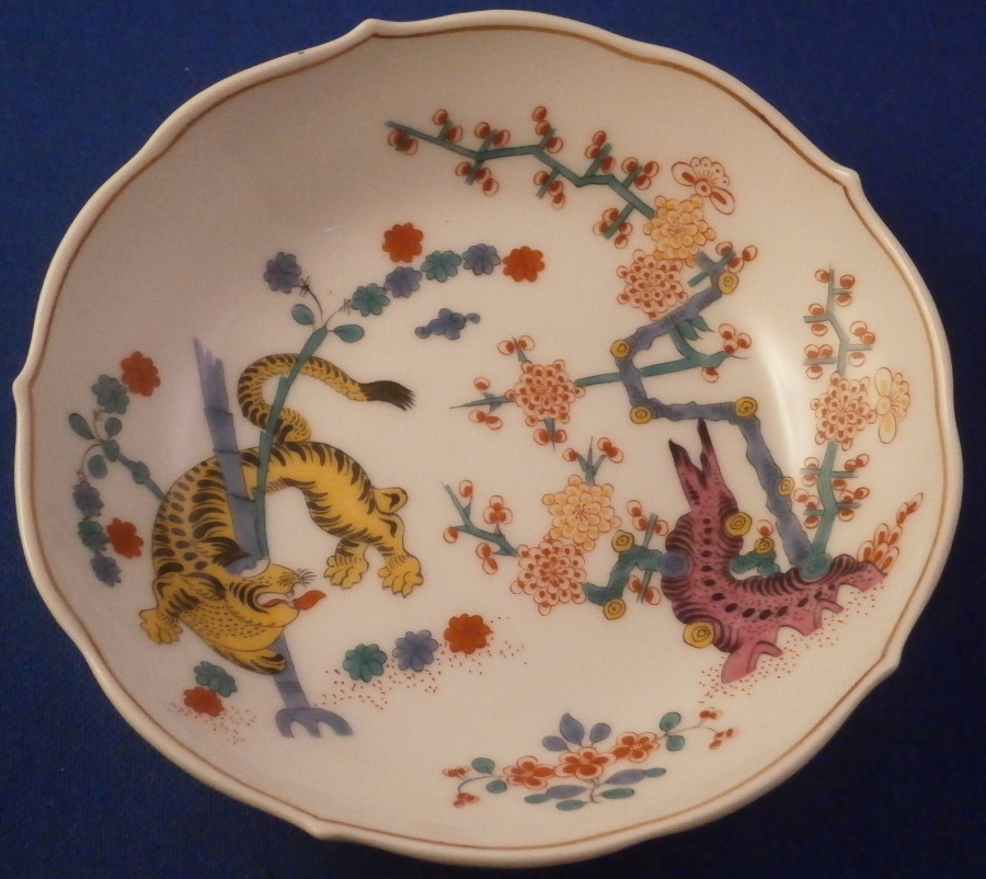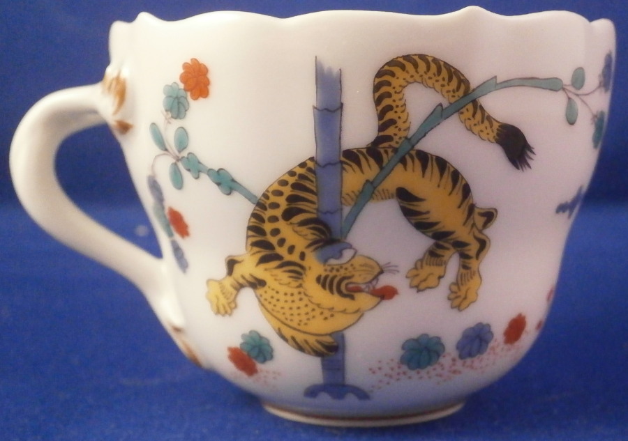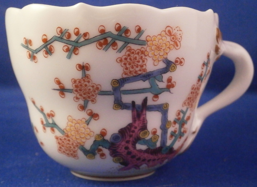 This is a mocha or espresso coffee demitasse cup and saucer made by Meissen in the 20th century. Both pieces are decorated with the famous yellow Tiger ( Gelber Löwe ) design that is so superb that it was also used for the Saxon Royal Court! Both pieces have the yellow tiger hand painted on one part and the funky colorful tree on the other part with some Kakiemon flowers in between. It is one of the nicest Kakiemon patterns there is I think. There is a light brown trim just under the nicely shaped edge and an extra flower to the bottom inside of the cup - a sure sign of quality! The handle of the cup is superb as well. This size cup is not easy to find and I like them better than regular sized pieces since they take up less room in the cabinets plus this design is just amazing! The set is in perfect condition which never hurts either :) One tiny black firing spot along the very edge of the saucer from when it was made. It is marked with the under glaze blue crossed swords mark underneath (first quality) as well as the usual impressed and painted marks one expects from pieces of this period as shown. The cup is 2 inches tall and 2.5 inches in diameter. The saucer is about 0.875 inches tall and has a diameter of 4.25 inches. Please email me for more information or other pictures.