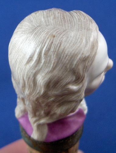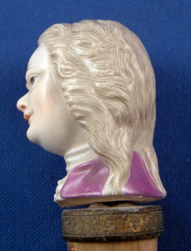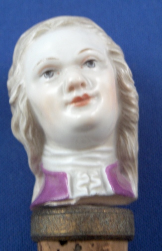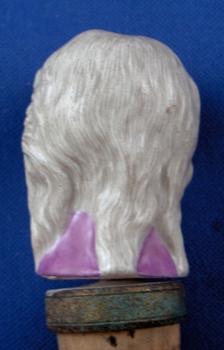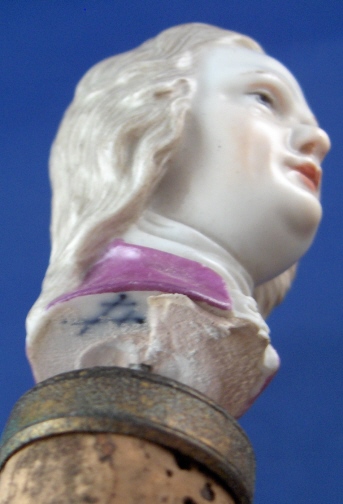 This is a bottle stopper made by Meissen in the 19th century. It is in the form of a gentleman's head with long hair and decorative collar around his neck. He is a bit chubbier than the other one I own. The porcelain head is connected with a long thin metal piece to where a metal plate would ahve been at the bottom of the cork which is now missing. The rest is all original still! The cork has a decorative metal ring to the top which has oxidized over the years. The cork is very old and not flexible anymore. The porcelain head is in perfect condition. Since the metal plate underneath the cork is gone we can in this case remove the cork to see the mark. It is marked with the straight small blue crossed swords with the dots at the end underneath between the head and the cork. The entire piece is 3.625 inches tall. The cork is 1.875 inches long and the head is 1.25 inches wide. Please email me for more information or other pictures.