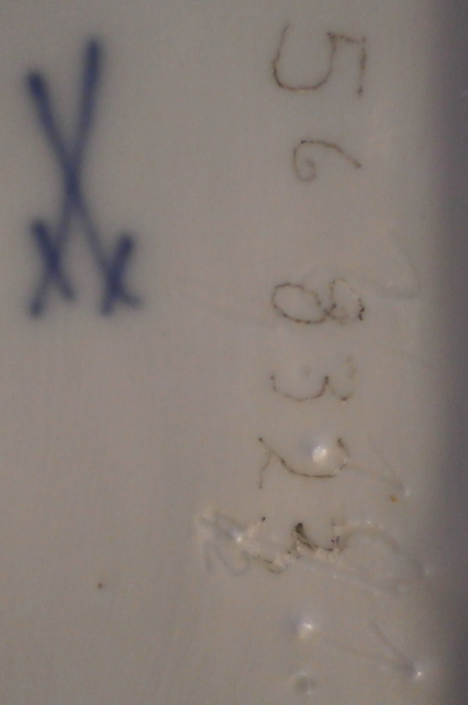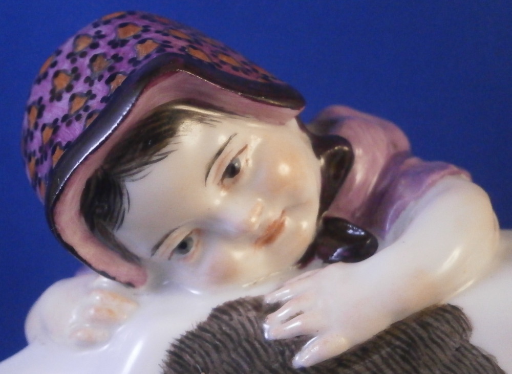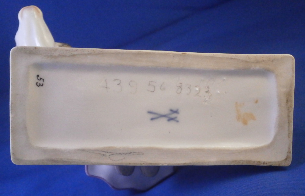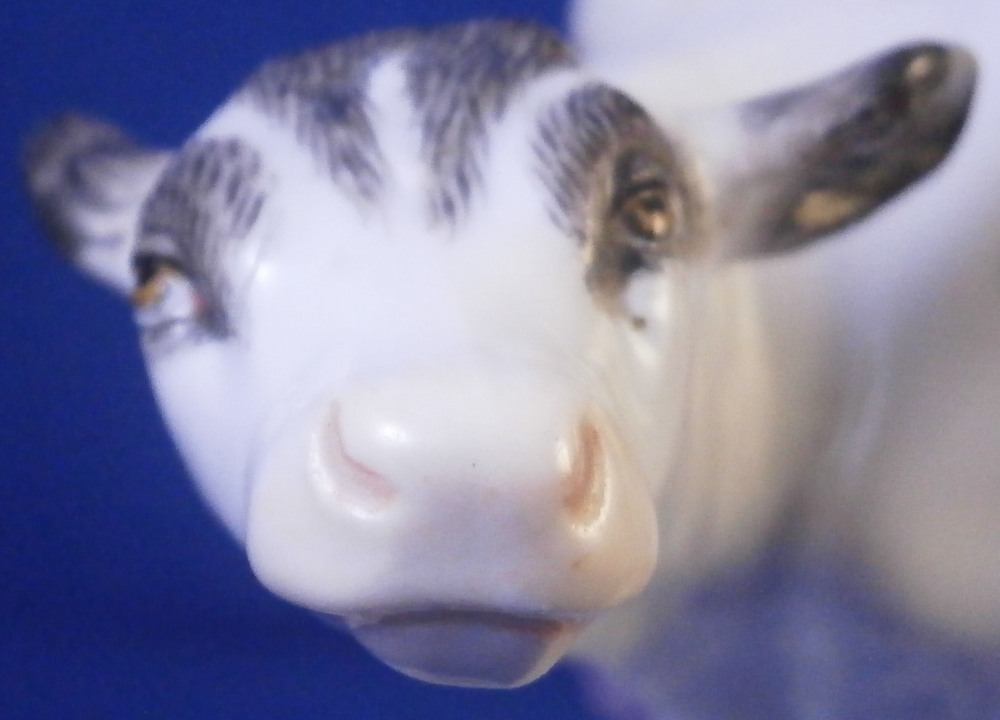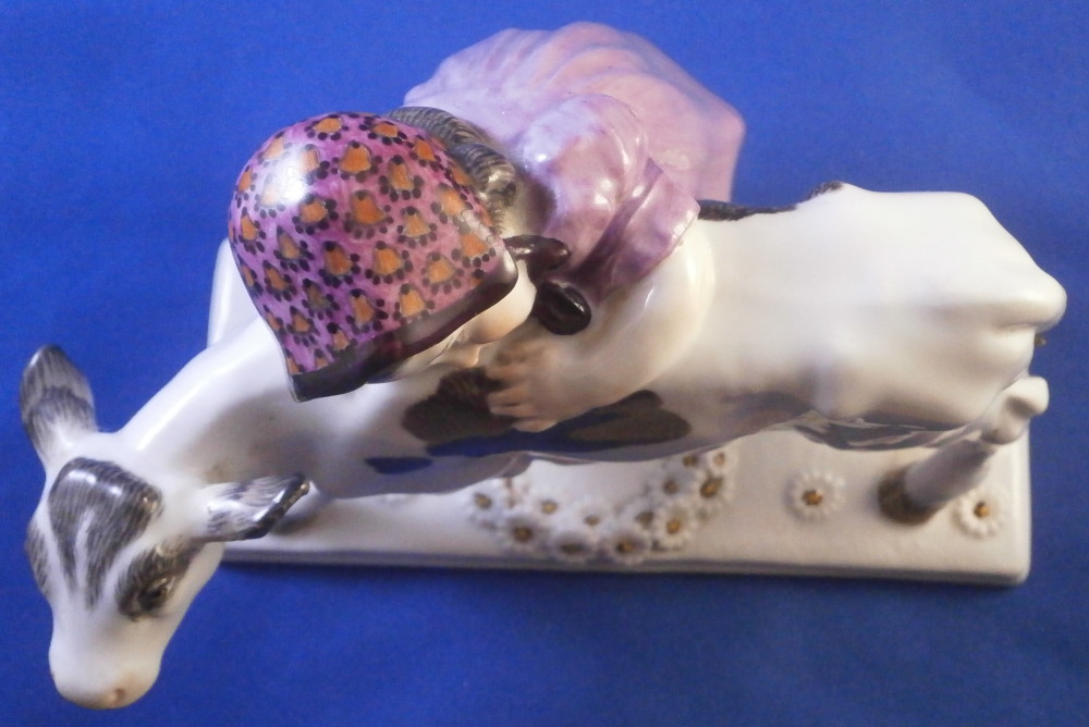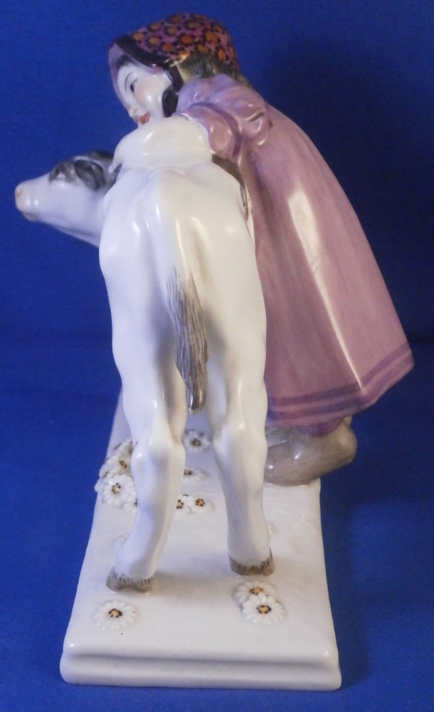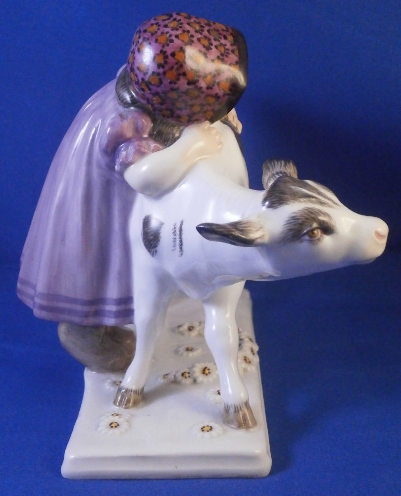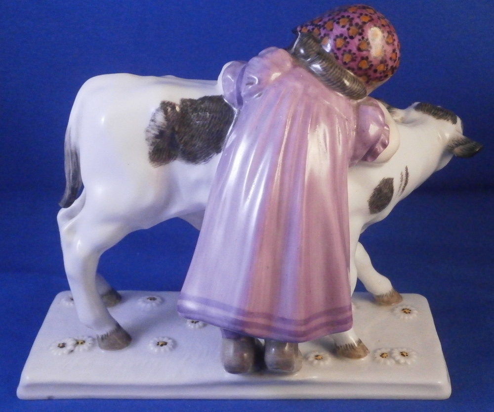This is a very nice figurine of a young lady / girl hugging a calf / young cow made by Meissen in the early 20th century. The figure was originally modeled by Max Bochmann in 1910 and this example here is from this original period which is extra nice! The piece is superbly modeled and hand painted in the Art Nouveau / Jugendstil style of the period. The girl is wearing a purple dress and a colorful bonnet type hat. There are flowers strewn across the base which fits this period perfectly. A stunning figurine! The piece is marked with the under glaze blue crossed swords mark of the period as well as an incised model number Y191, impressed number 42 and painter's numbers 53 in black. The figurine is in great condition with jsut a very tiny chip to the bottom edge of the base as shown and a few tiny black firing spots from when she was made. The black fur painted on the back side near the girl has a spot that look smudged but this is from when she was made. The figurine is first choice! It is 4.5 inches tall, 5.75 inches long and 4.25 inches wide. Please email me for more information or other pictures.