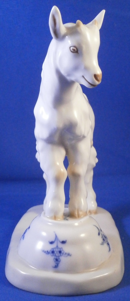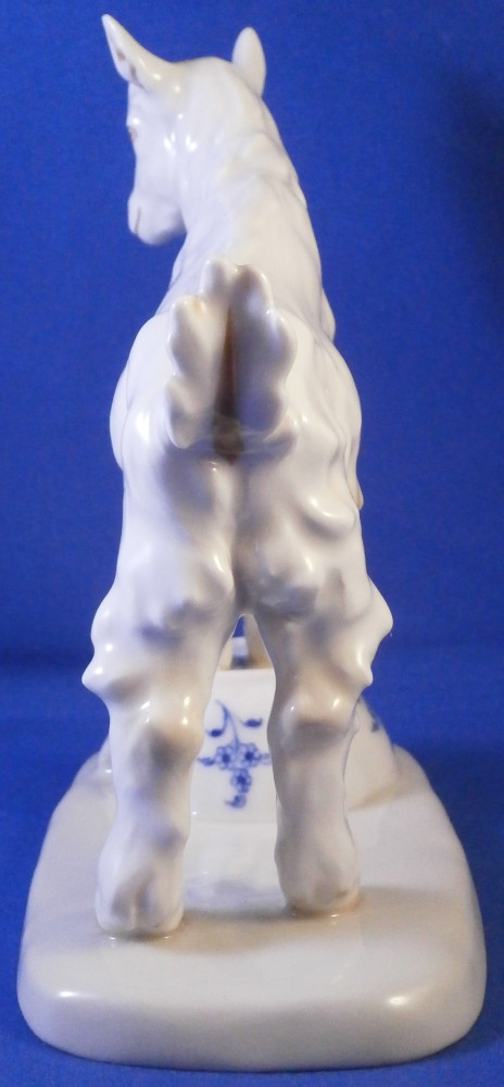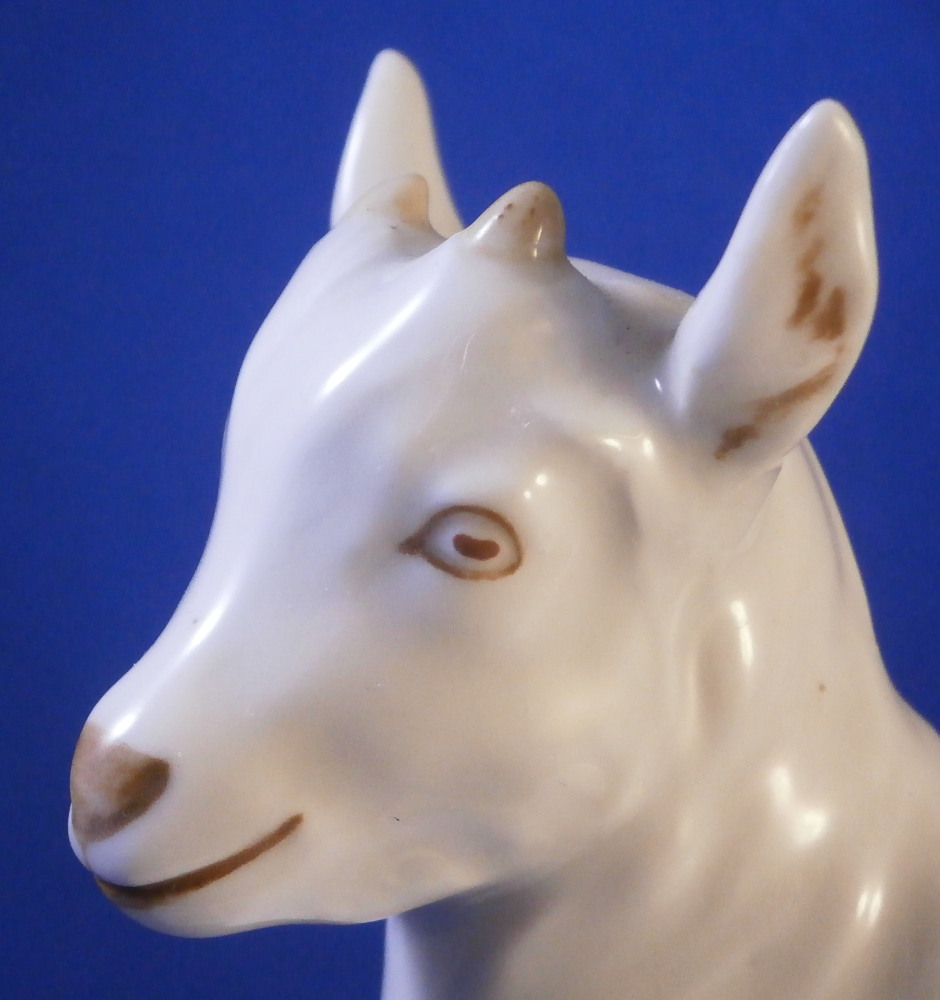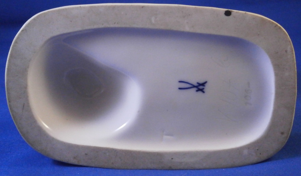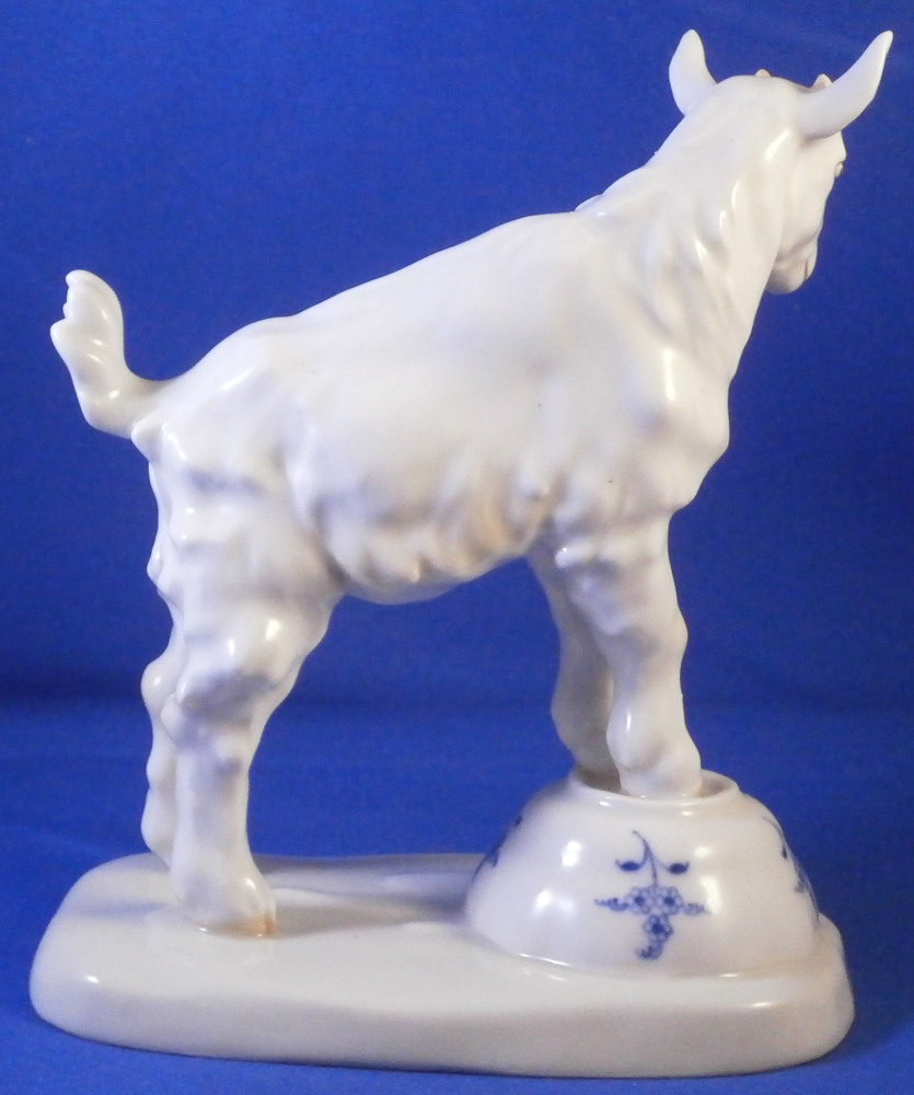 This is a fun figurine of a goat that spilled its milk made by Meissen in the 20th century. Super cute! The piece is superbly modeled and hand painted with lots of detail. The goat has its front legs standing on top of a turned over bowl with a large chip missing on one side and the milk it conatained having spilled into the cetner of the base. The bowl is even decorated with a blue floral strawflower type design and their trademark under glaze blue crossed swords! This version is really nicely painted with perfectly places area of color like the face, hoofs and belly as well as the tail. The spilled milk on the base sticks out more than on some other examples I have seen. Just a superb piece! The figure is in perfect condition which is always a bonus - first choice but there is a black firing spot on its side as shown. Should not have been first chocie but I have seen worse slide through their system. It's all aprt of the charm in my book and looks amazing! The figure is 5.5 inches tall, 2.75 inches wide and 4.75 inches long. The piece is marked underneath with the under glaze blue crossed swords mark as well as the usual impressed letters and numbers, etc. as shown. I believe it was first modeled by Model Erich Hösel in 1904. Please email me for more information or other pictures.
