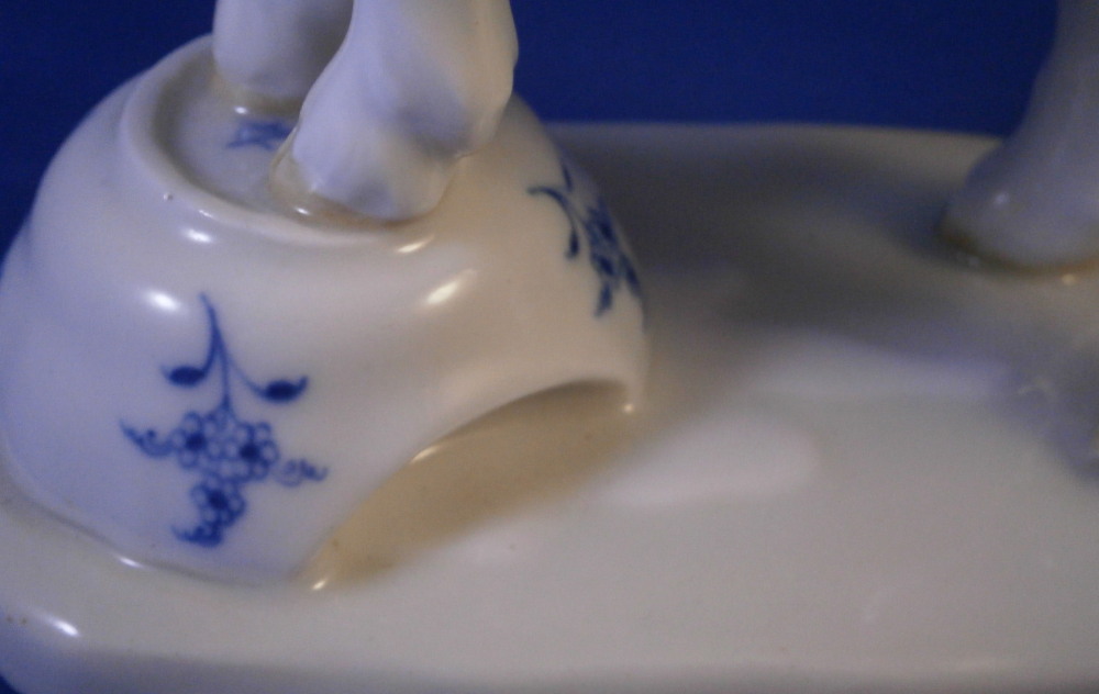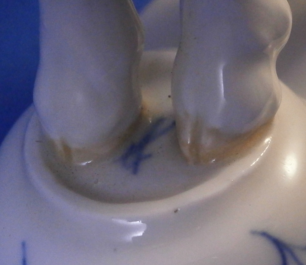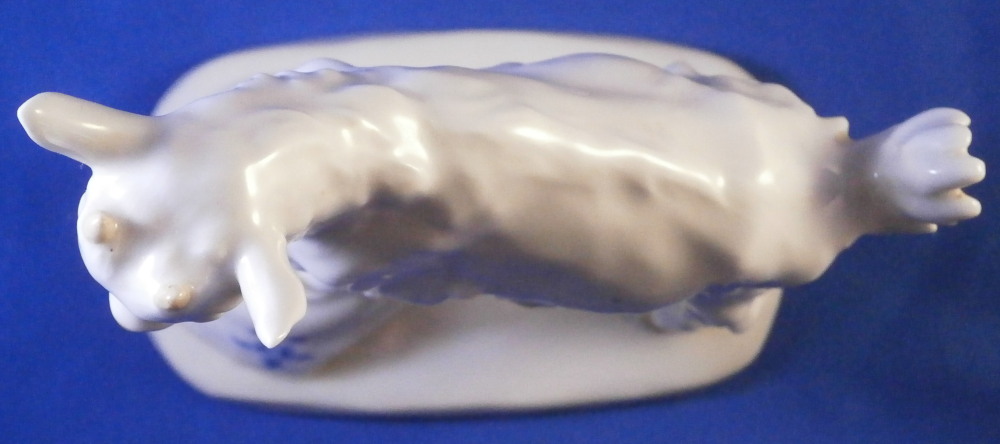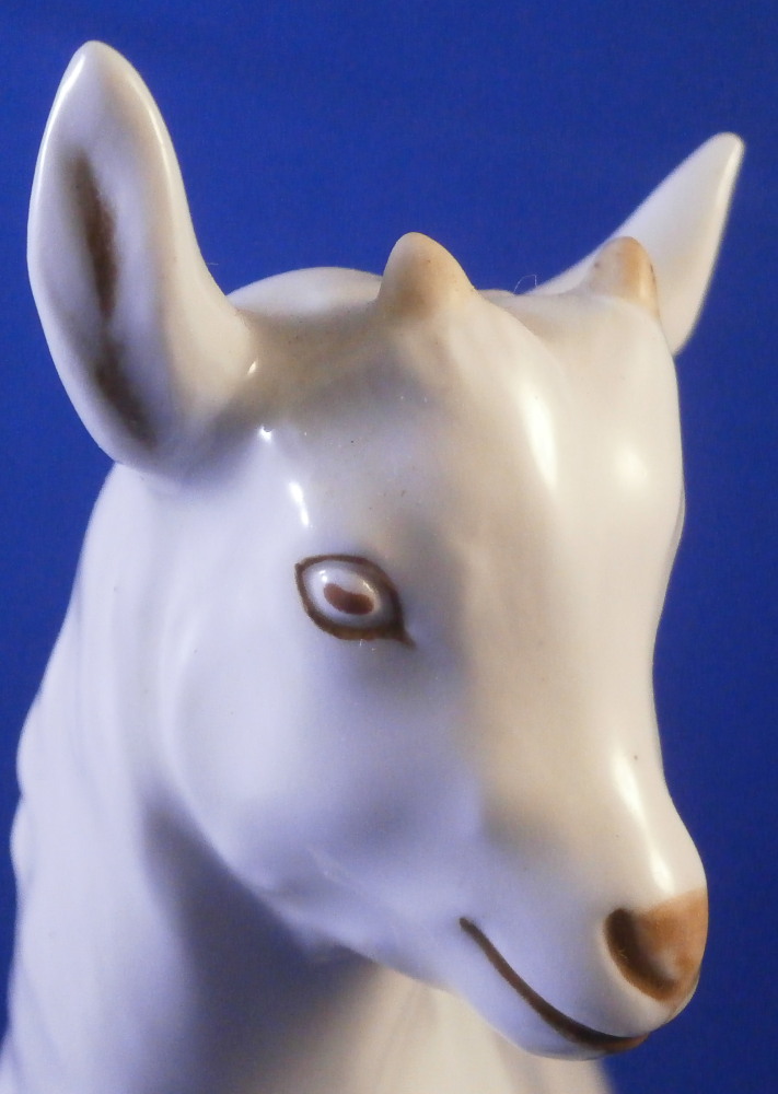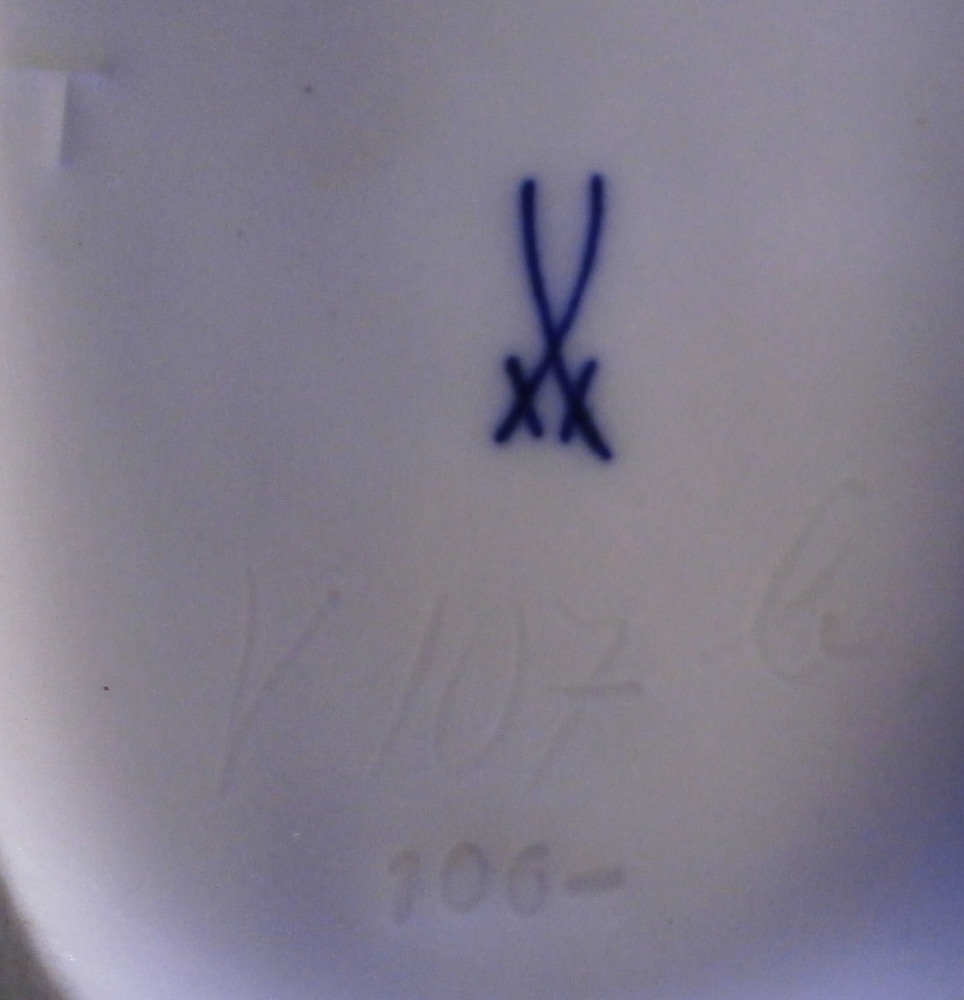 This is a fun figurine of a goat that spilled its milk made by Meissen in the 20th century. Super cute! The piece is superbly modeled and hand painted with lots of detail. The goat has its front legs standing on top of a turned over bowl with a large chip missing on one side and the milk it conatained having spilled into the cetner of the base. The bowl is even decorated with a blue floral strawflower type design and their trademark under glaze blue crossed swords! This version is really nicely painted with perfectly places area of color like the face, hoofs and belly as well as the tail. The spilled milk on the base sticks out more than on some other examples I have seen. Just a superb piece! The figure is in perfect condition which is always a bonus - first choice but there is a black firing spot on its side as shown. Should not have been first chocie but I have seen worse slide through their system. It's all aprt of the charm in my book and looks amazing! The figure is 5.5 inches tall, 2.75 inches wide and 4.75 inches long. The piece is marked underneath with the under glaze blue crossed swords mark as well as the usual impressed letters and numbers, etc. as shown. I believe it was first modeled by Model Erich Hösel in 1904. Please email me for more information or other pictures.